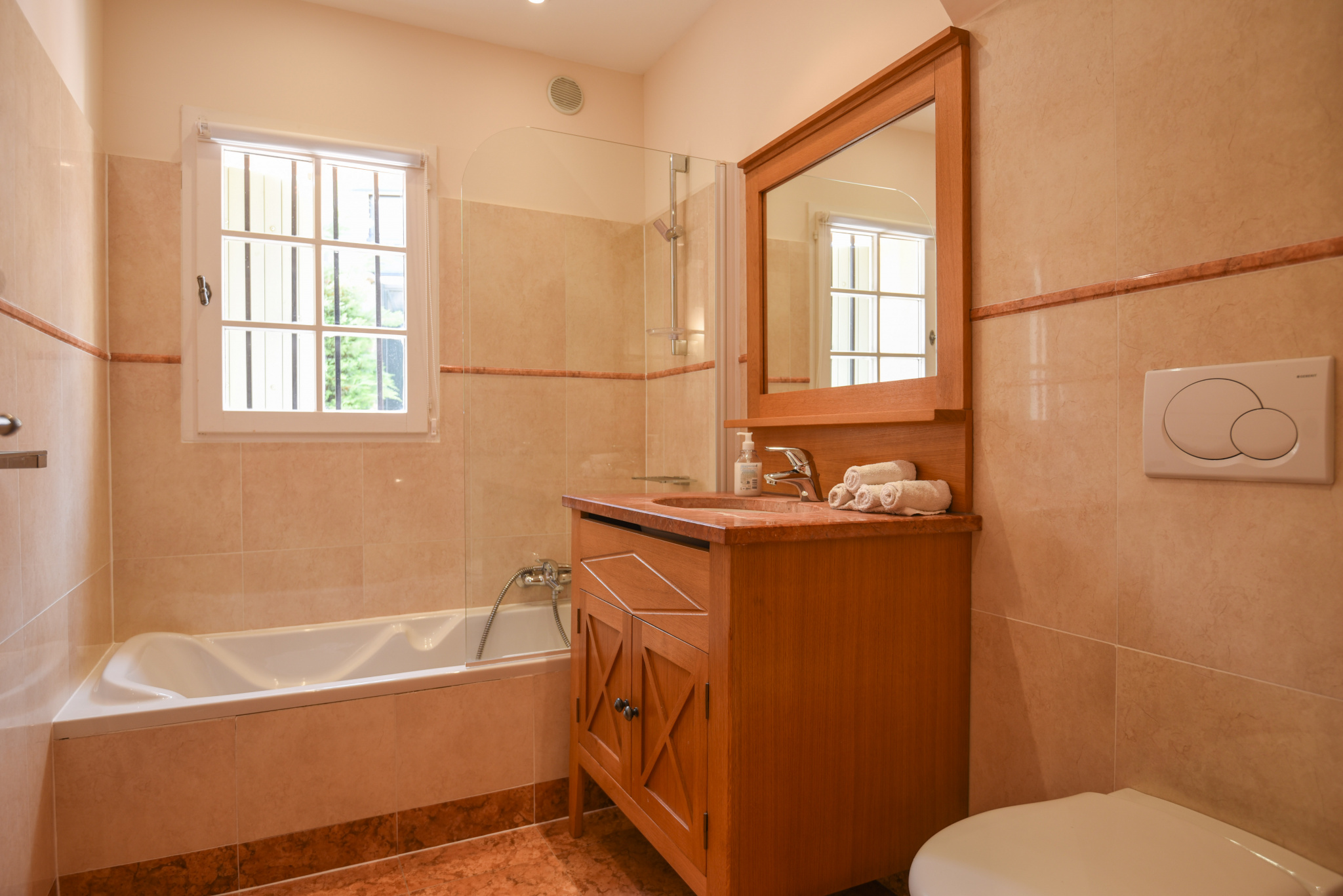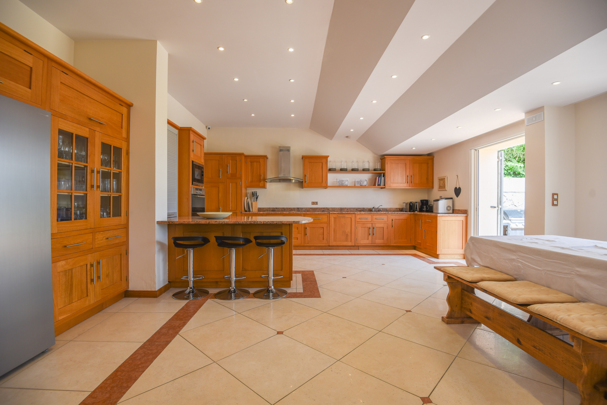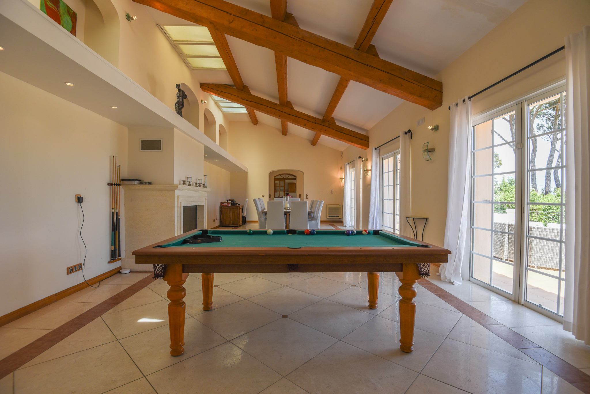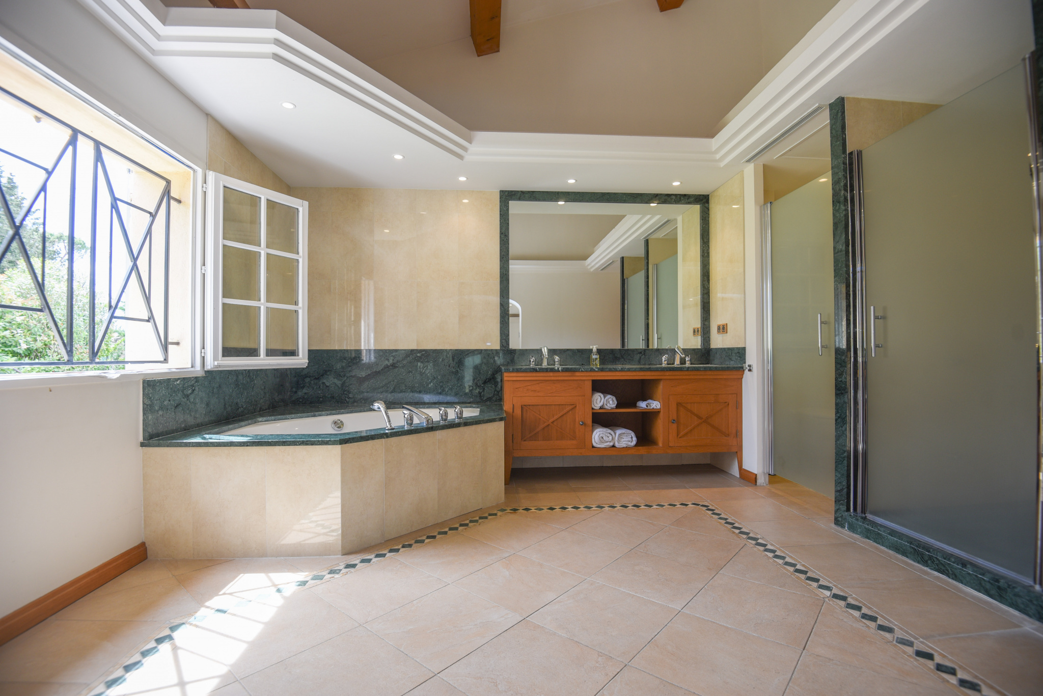 We enter the villa through a magnificent entrance hall which leads to a charming kitchen and rear kitchen, a spacious dining room and a living room which offer superb open views. and a living room which offer a superb open view. A few steps, and we access a charming library and a laundry room.
