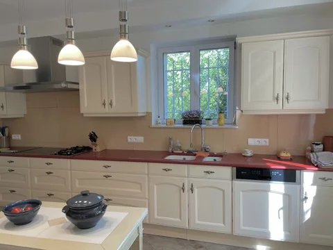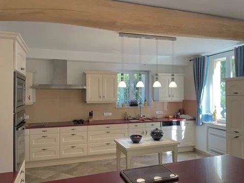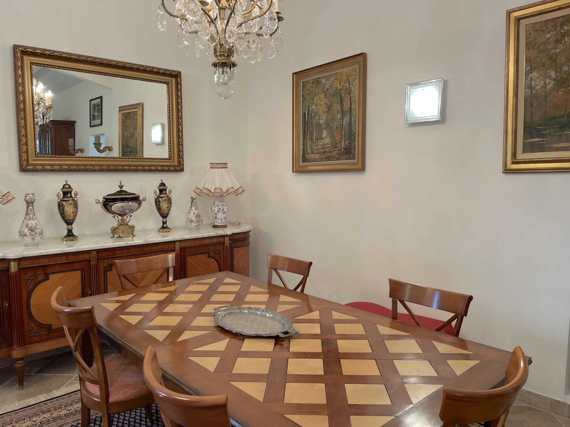 The house, approximately 300 m2, features a spacious living room with a wood stove, an open-plan kitchen with a dining area, both opening onto the terrace. There is a lovely second “living”-dining room with high ceilings, a library, an office, and a utility room with laundry facilities.