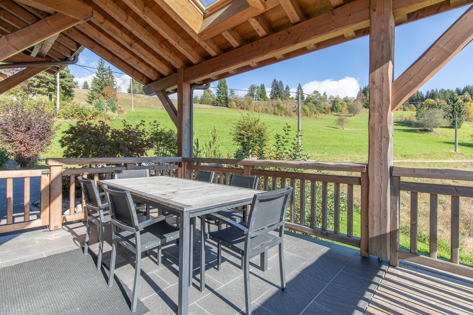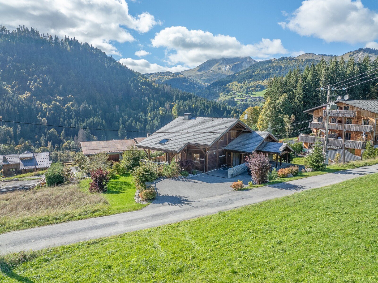 Outside, a driveway provides access to the chalet for several cars, as well as a covered parking area.