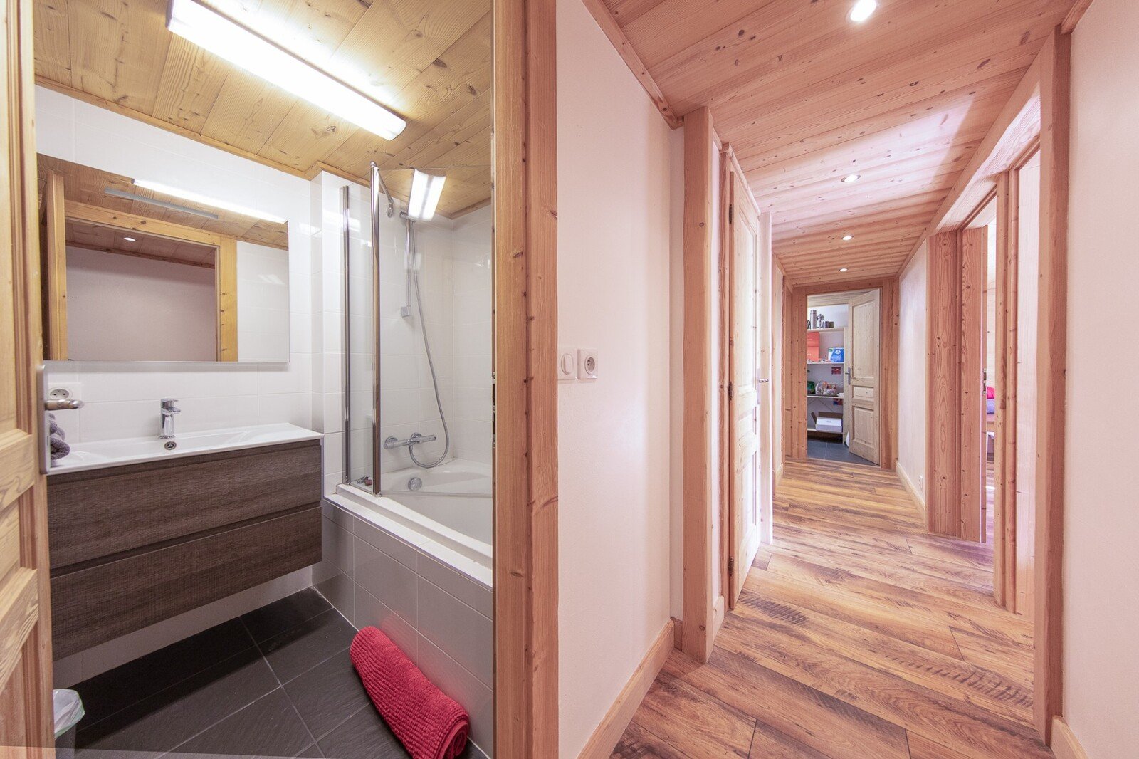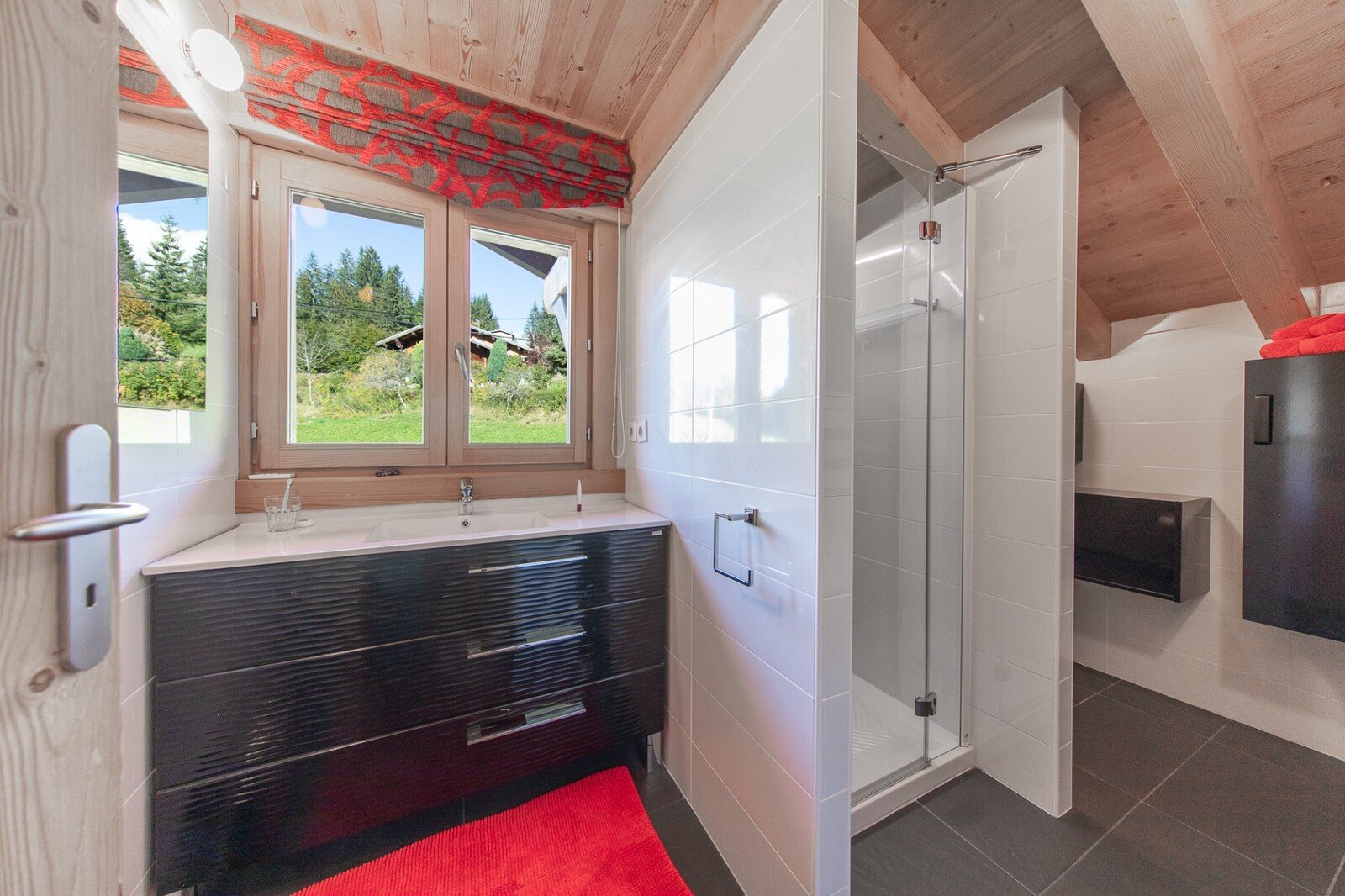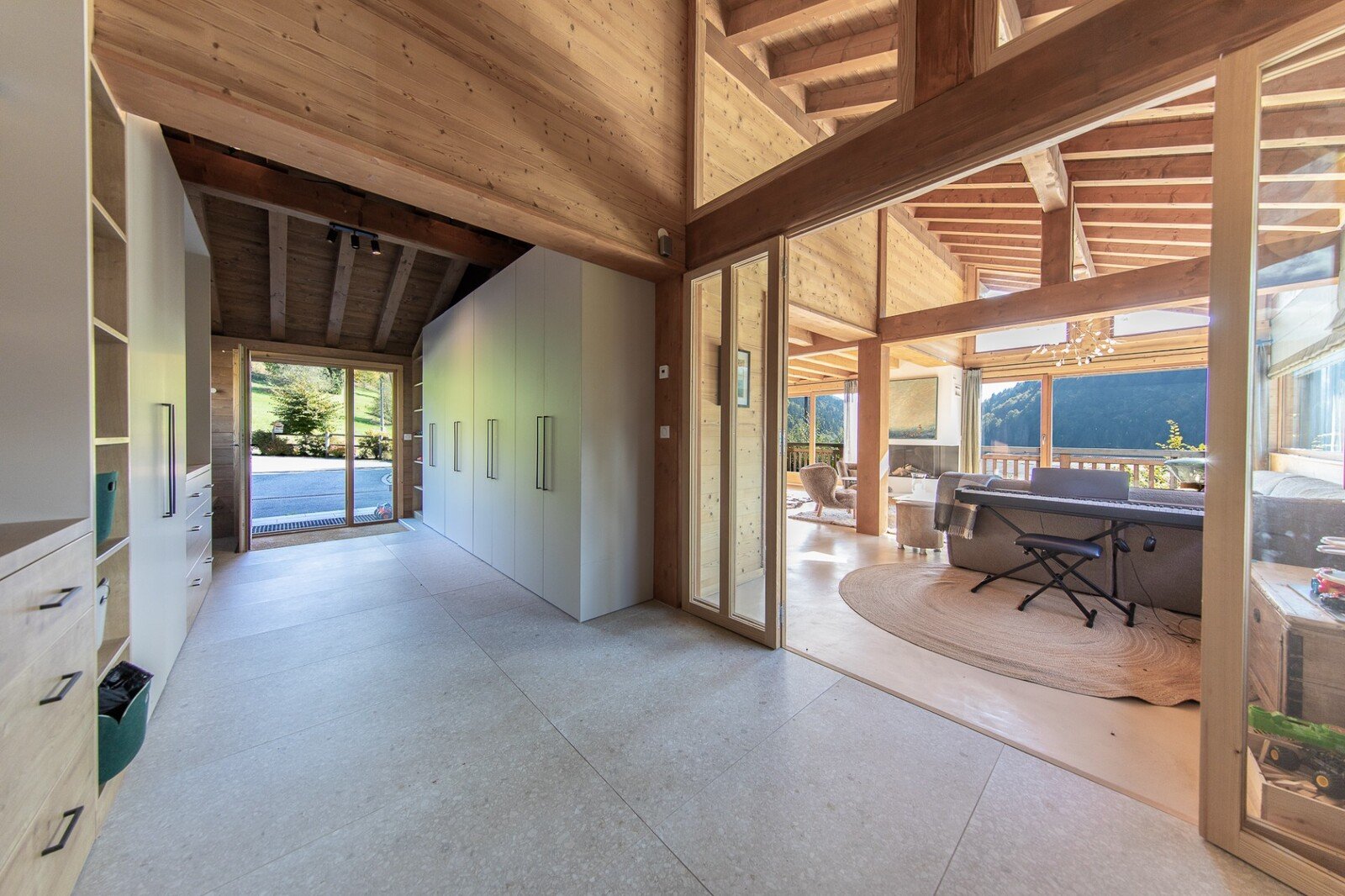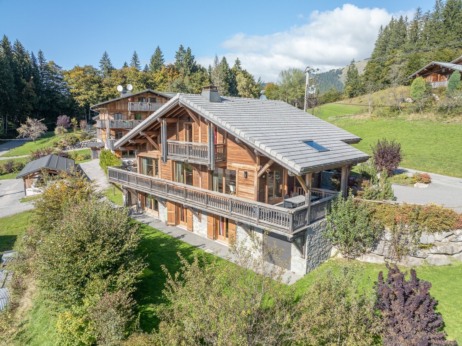 On either side of the lower part of the chalet are two garages, one open and the other with an electric blind, ideal for bicycles and equipment.