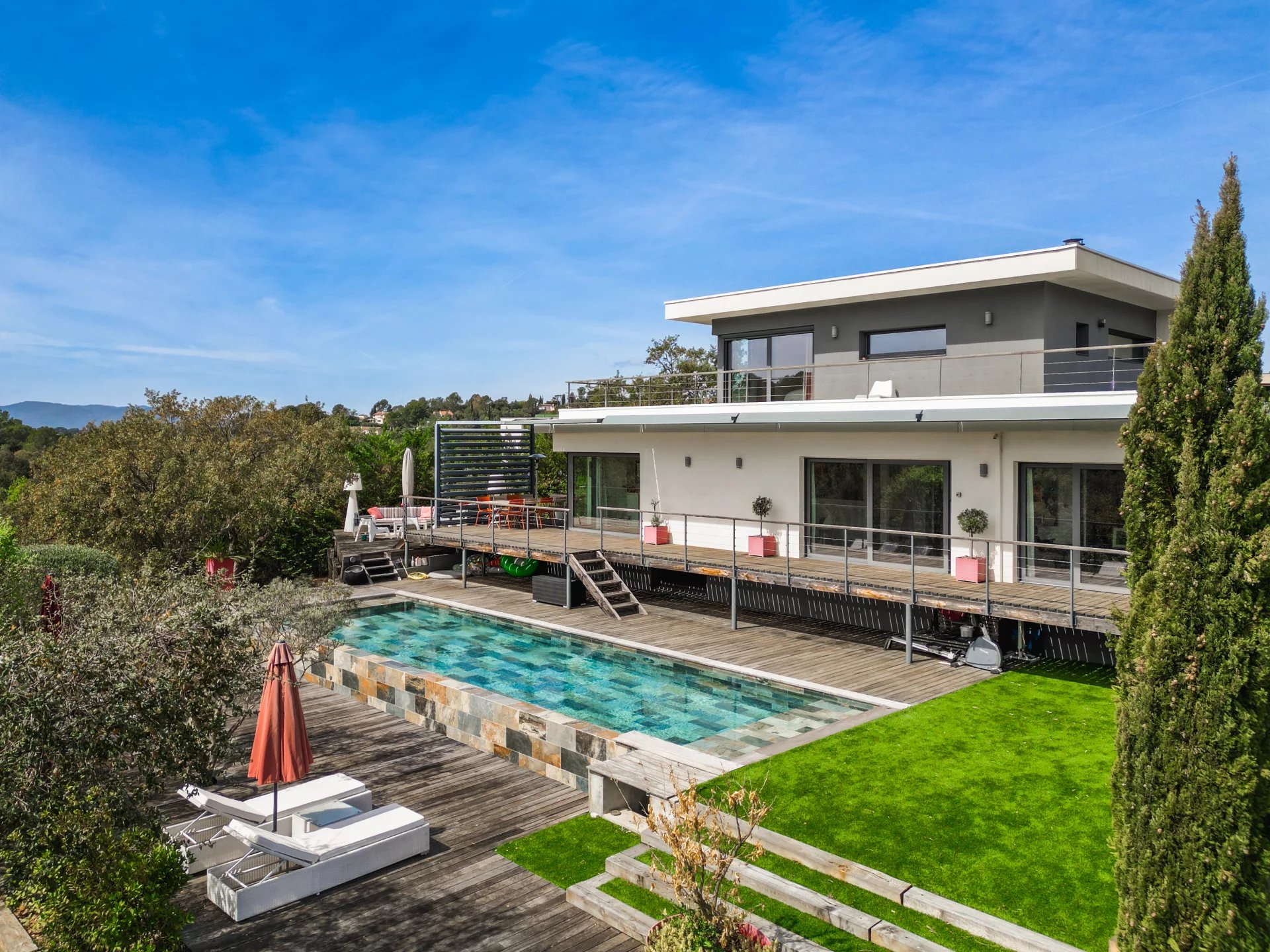 Modern architect-designed villa in a quiet neighborhood, completely private, with breathtaking panoramic sea views.