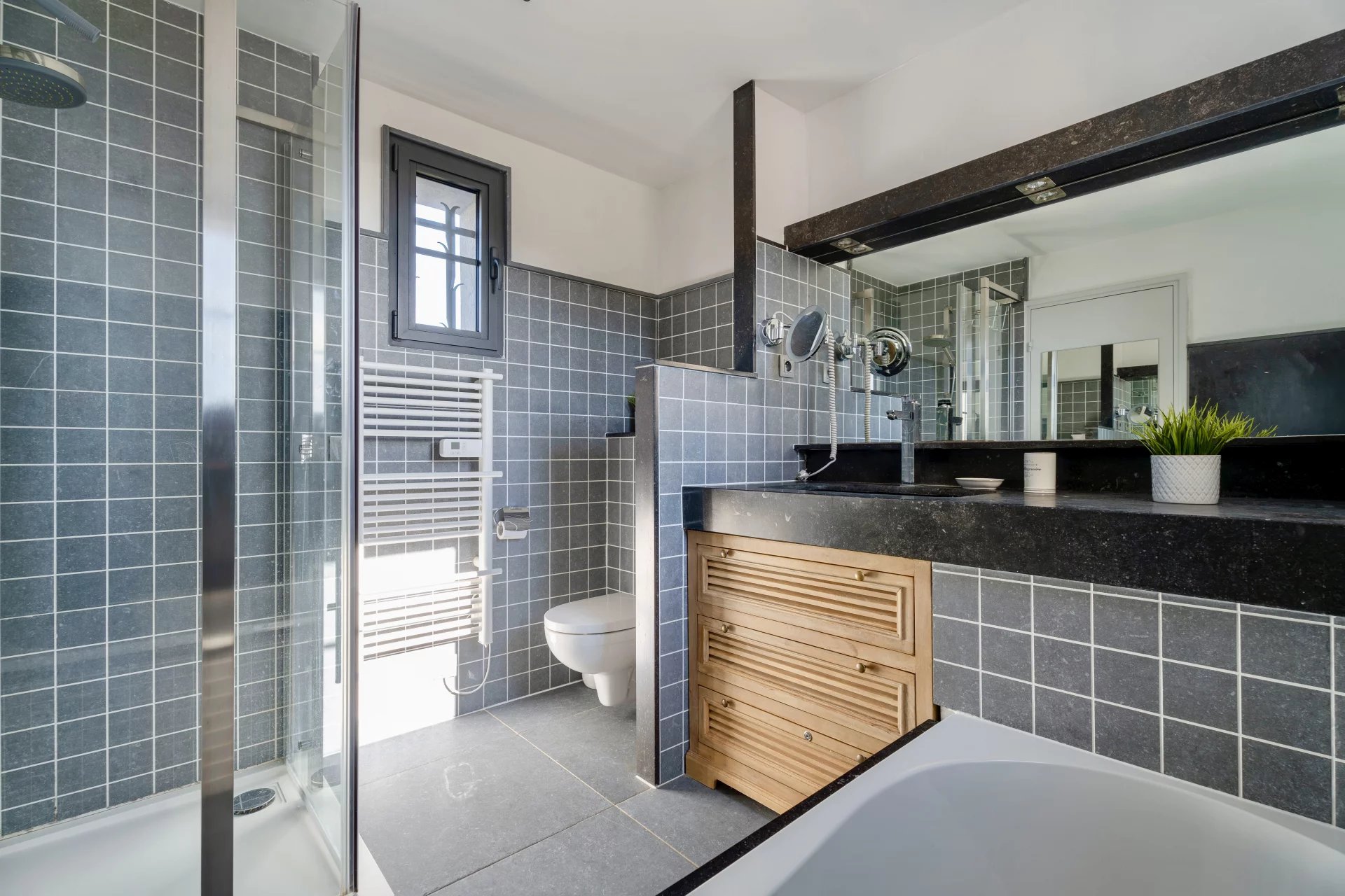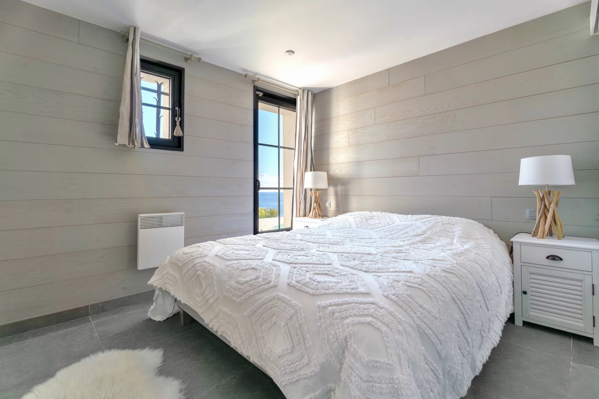 The lower ground floor offers a self-contained two-room apartment, comprising a living area, a fully equipped kitchen, a bedroom, and a shower room with WC, all with direct access to a terrace leading to the heated infinity pool.