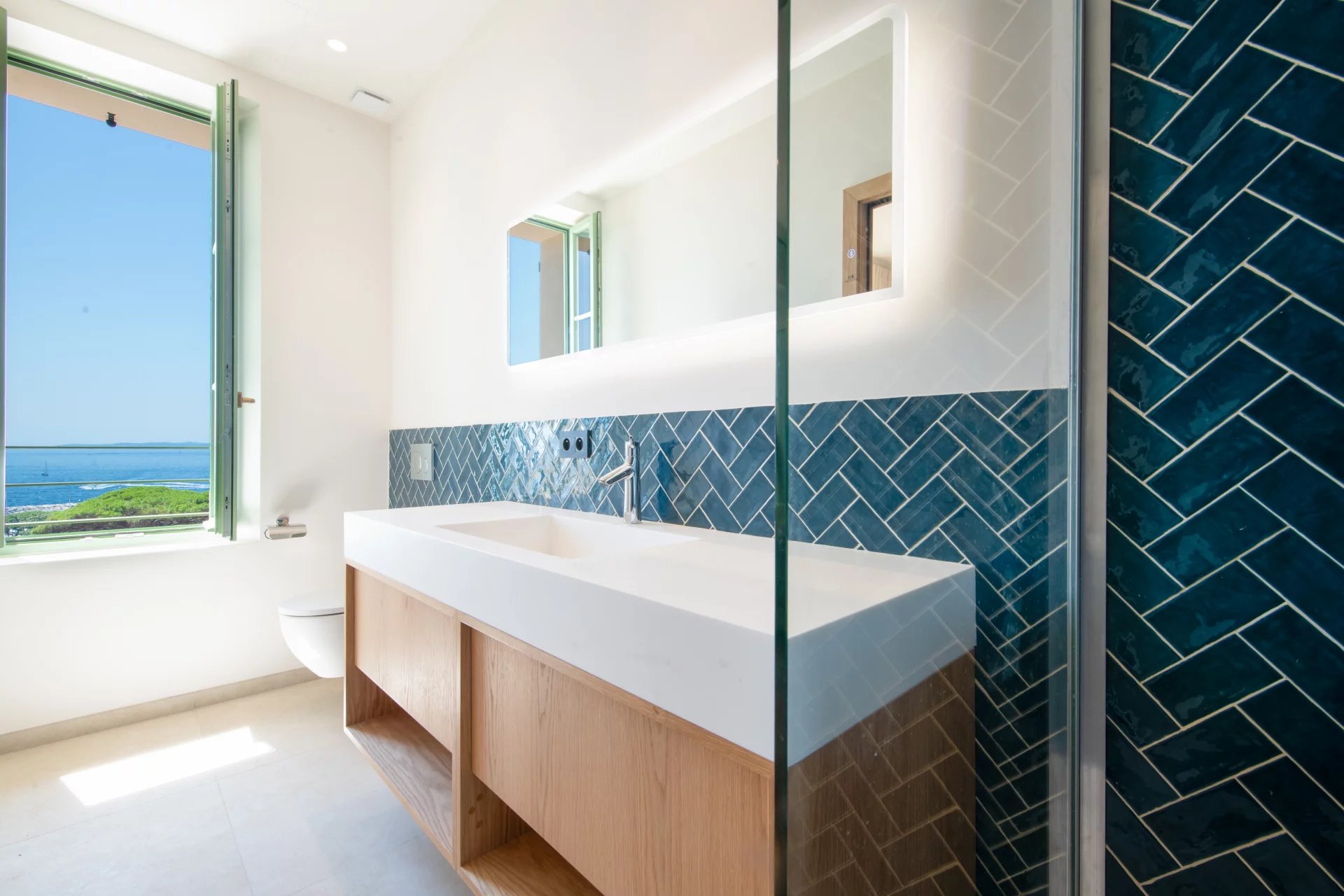 The entrance hall leads to a magnificently light and bright reception room with its dining room and separate kitchen with storeroom, both boasting exceptionally high ceilings. On this level is a master suite with direct access to the unoverlooked terrace and the gardens.