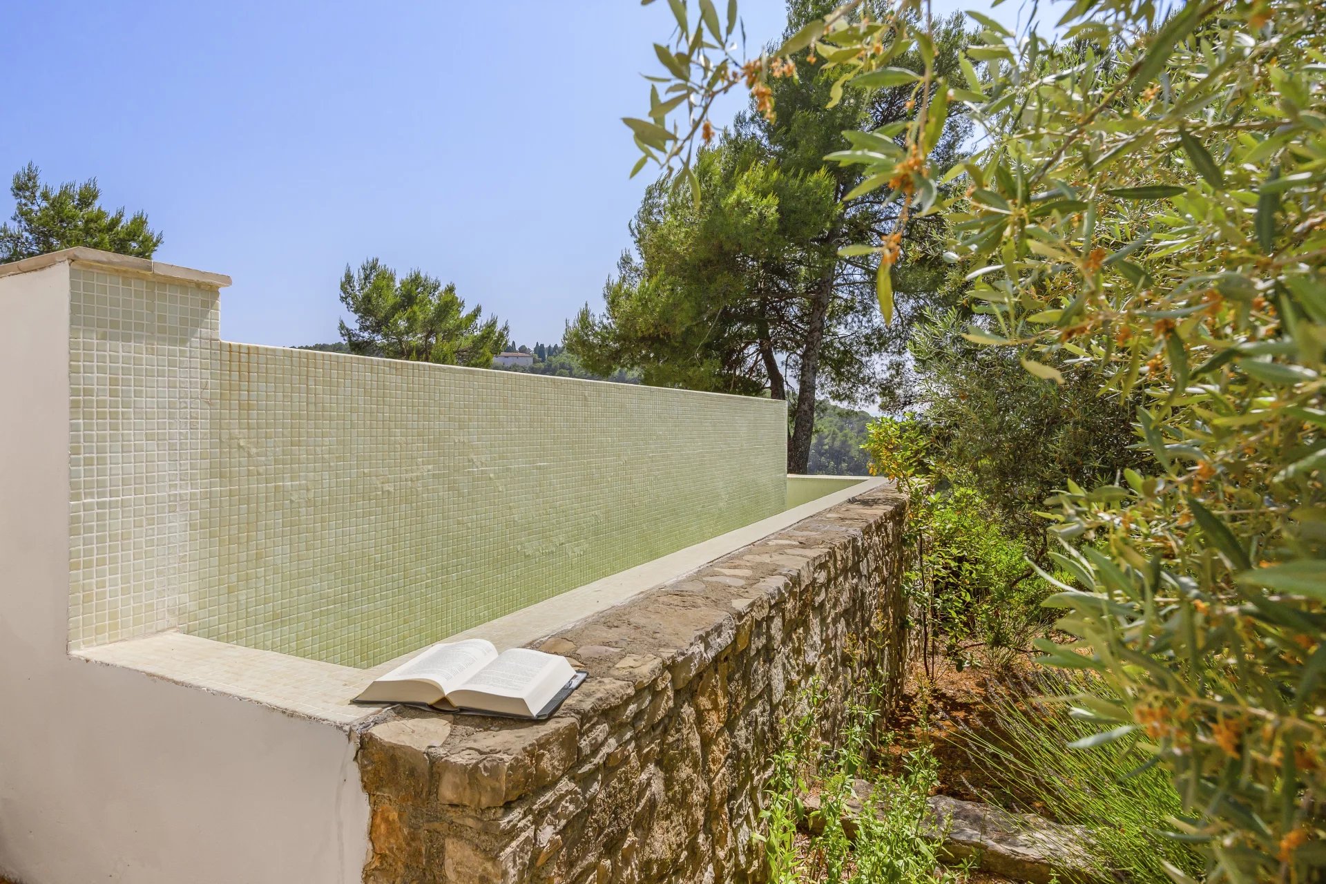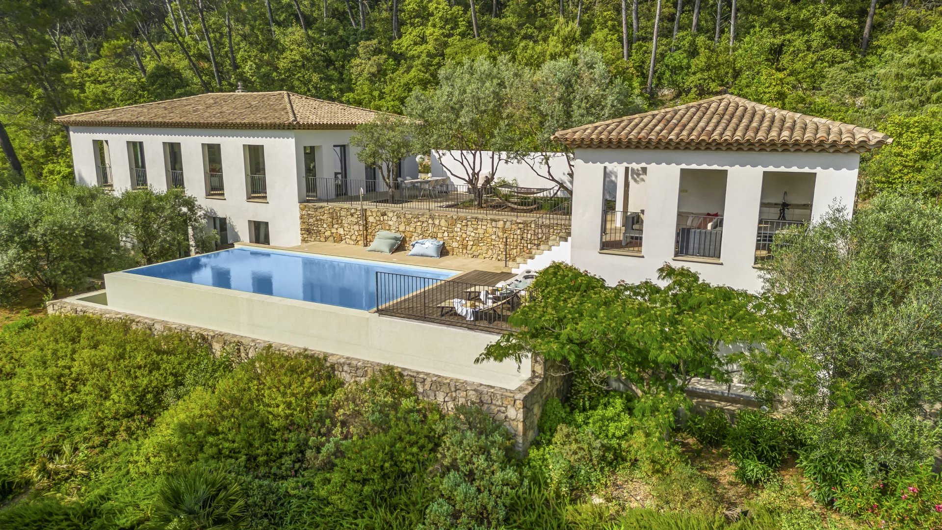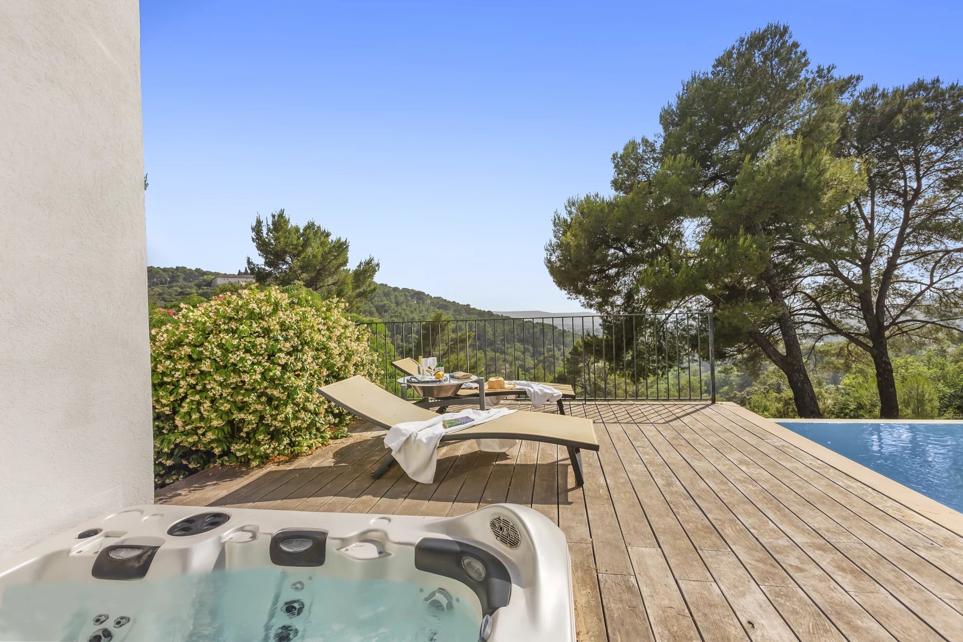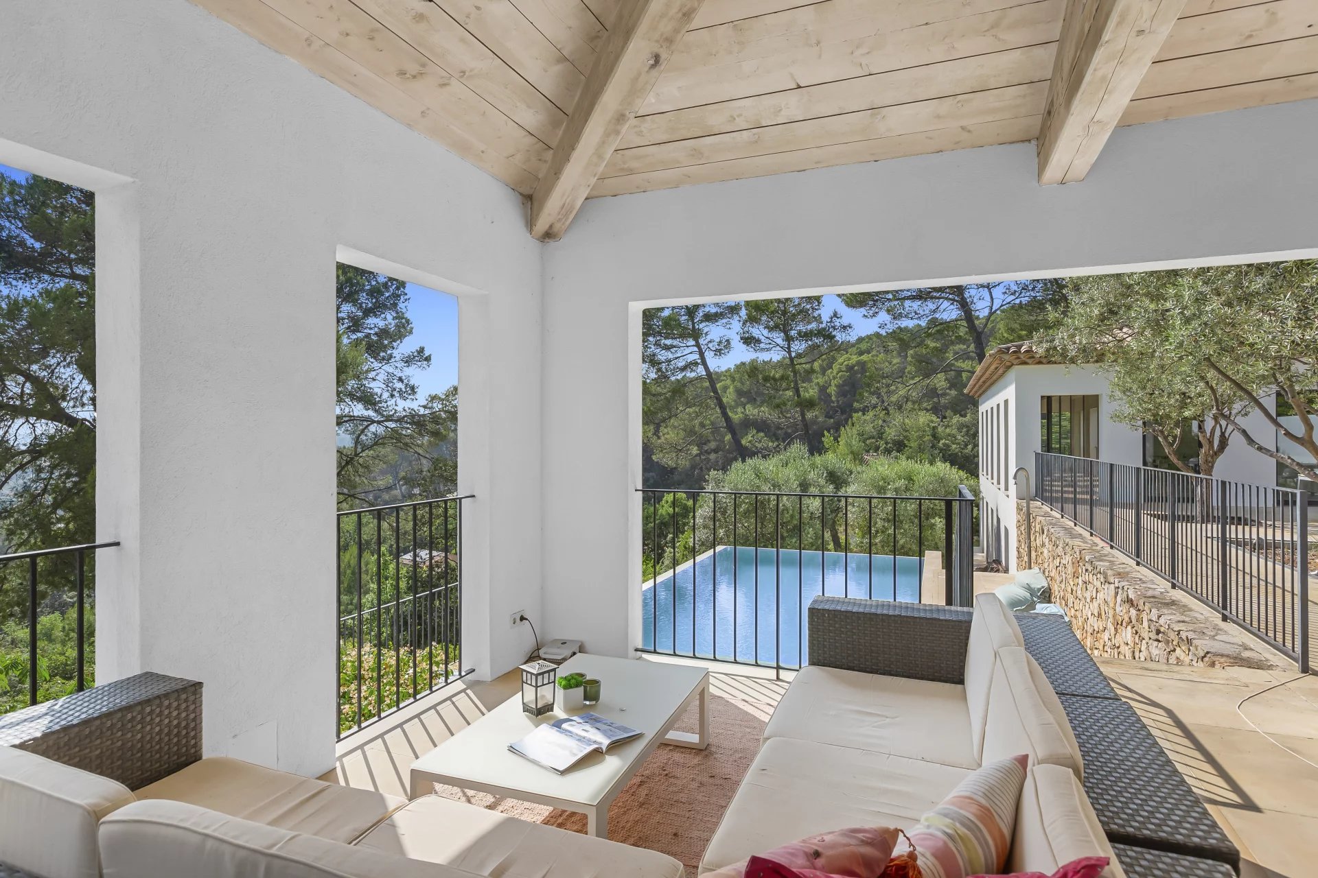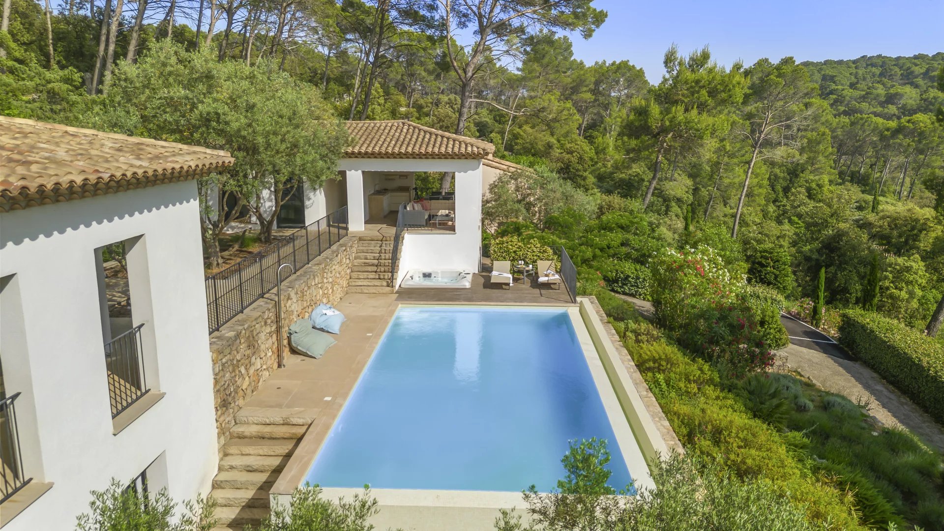 The beautifully positioned infinity pool is a serene focal point between the main villa and guest appartment, and includes a jacuzzi for ultimate relaxation.