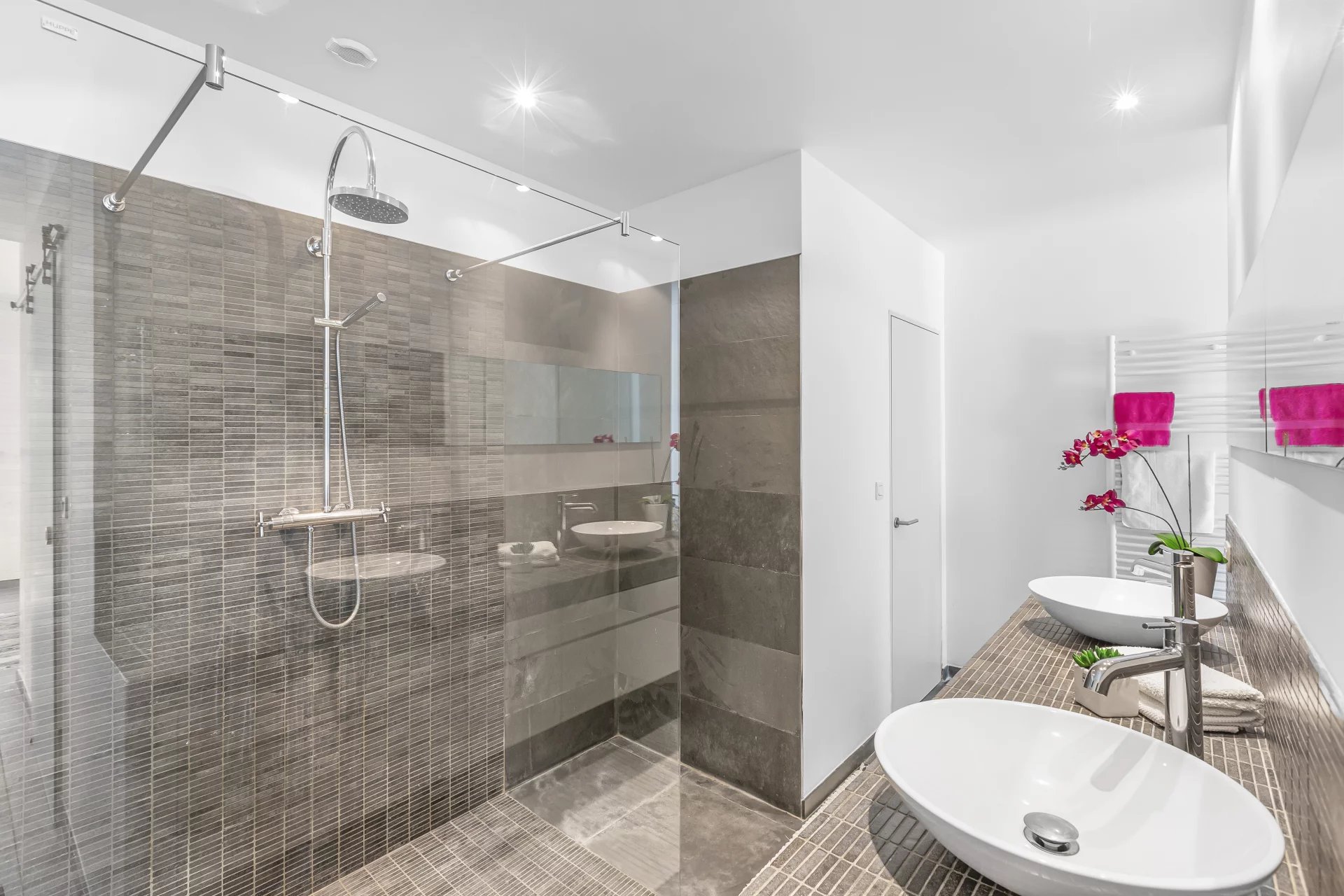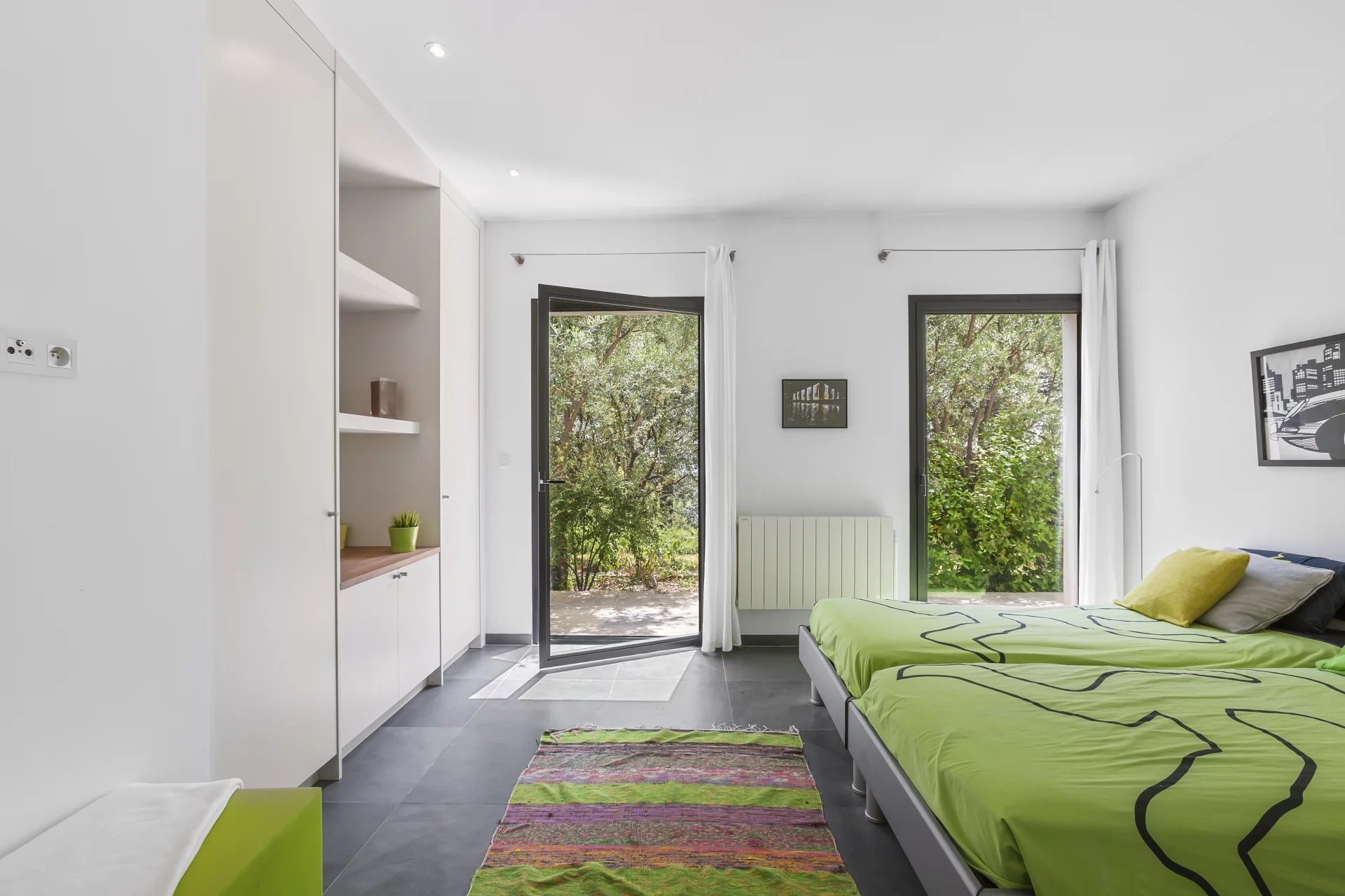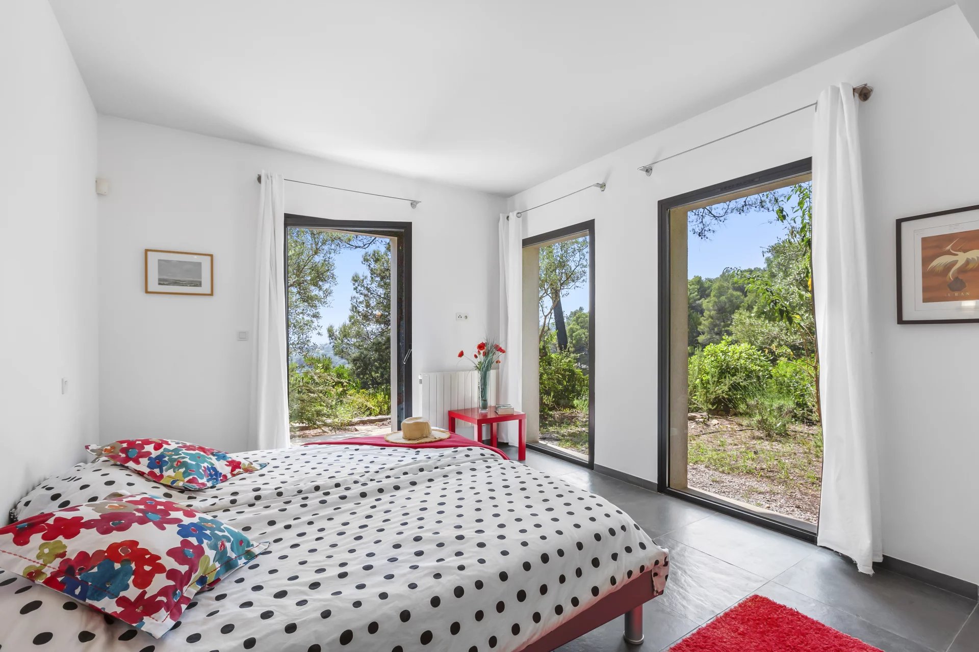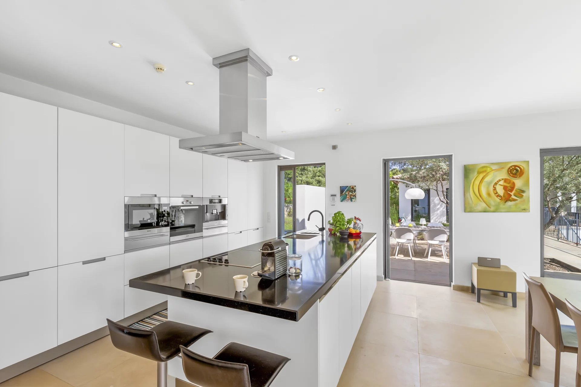 On the garden level, the luxurious master suite is accompanied by two additional en-suite bedrooms, each with direct access to the outdoors and the swimming pool area.