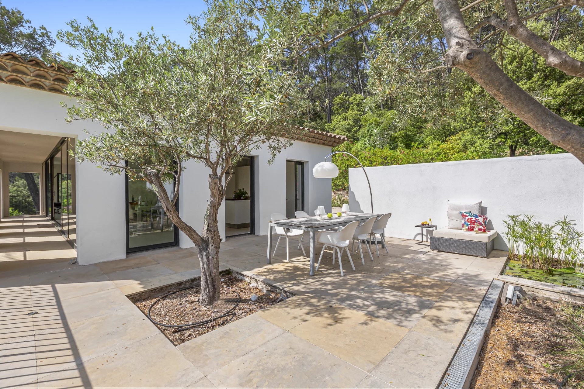 A tranquil Japanese-style patio with a decorative pond, designed to gently cool the air leads to a separate guest apartment of 22 m2 complete with its own bedroom and bathroom.