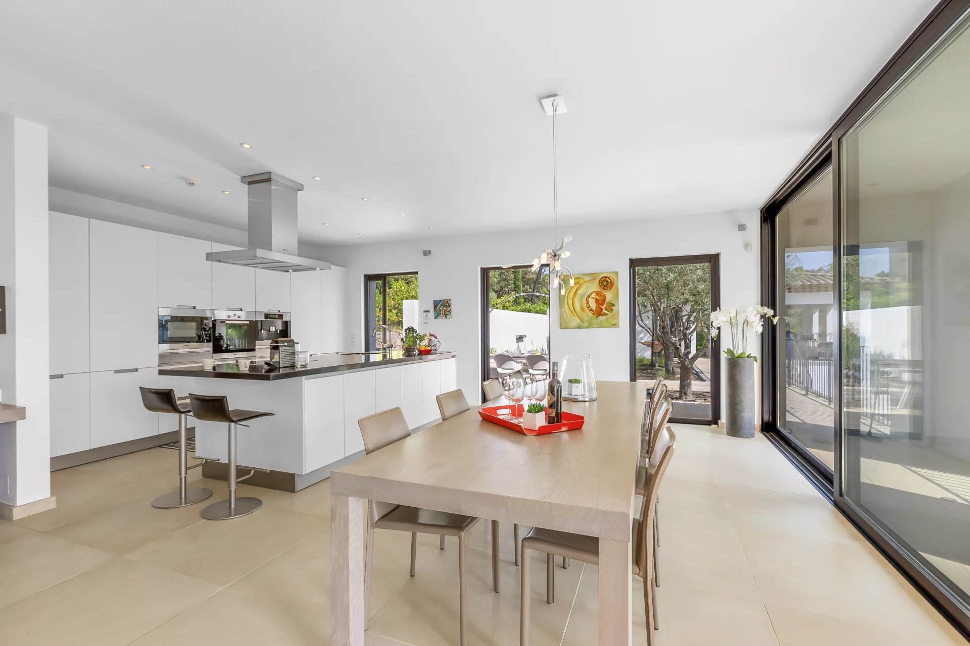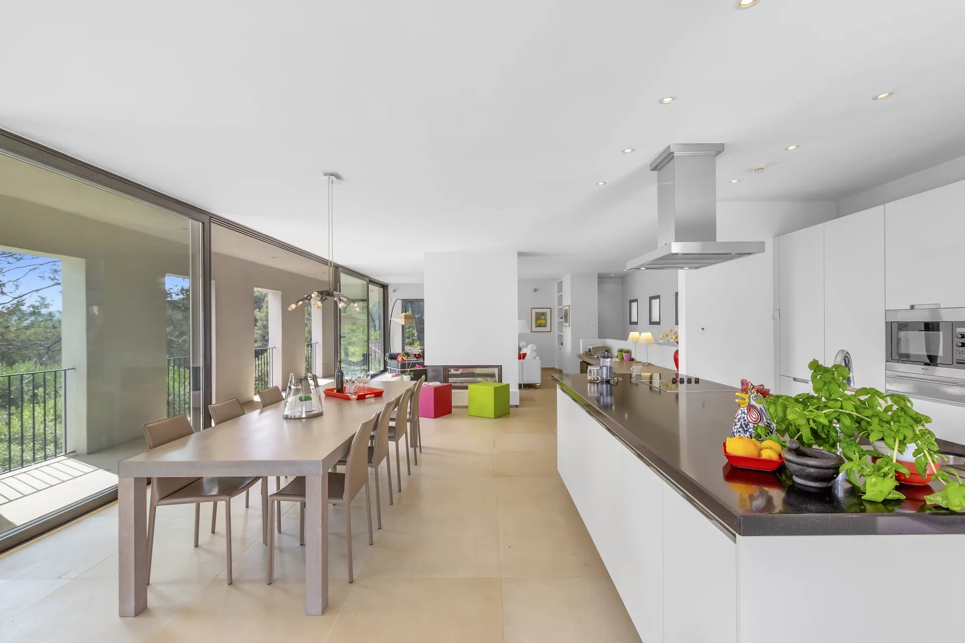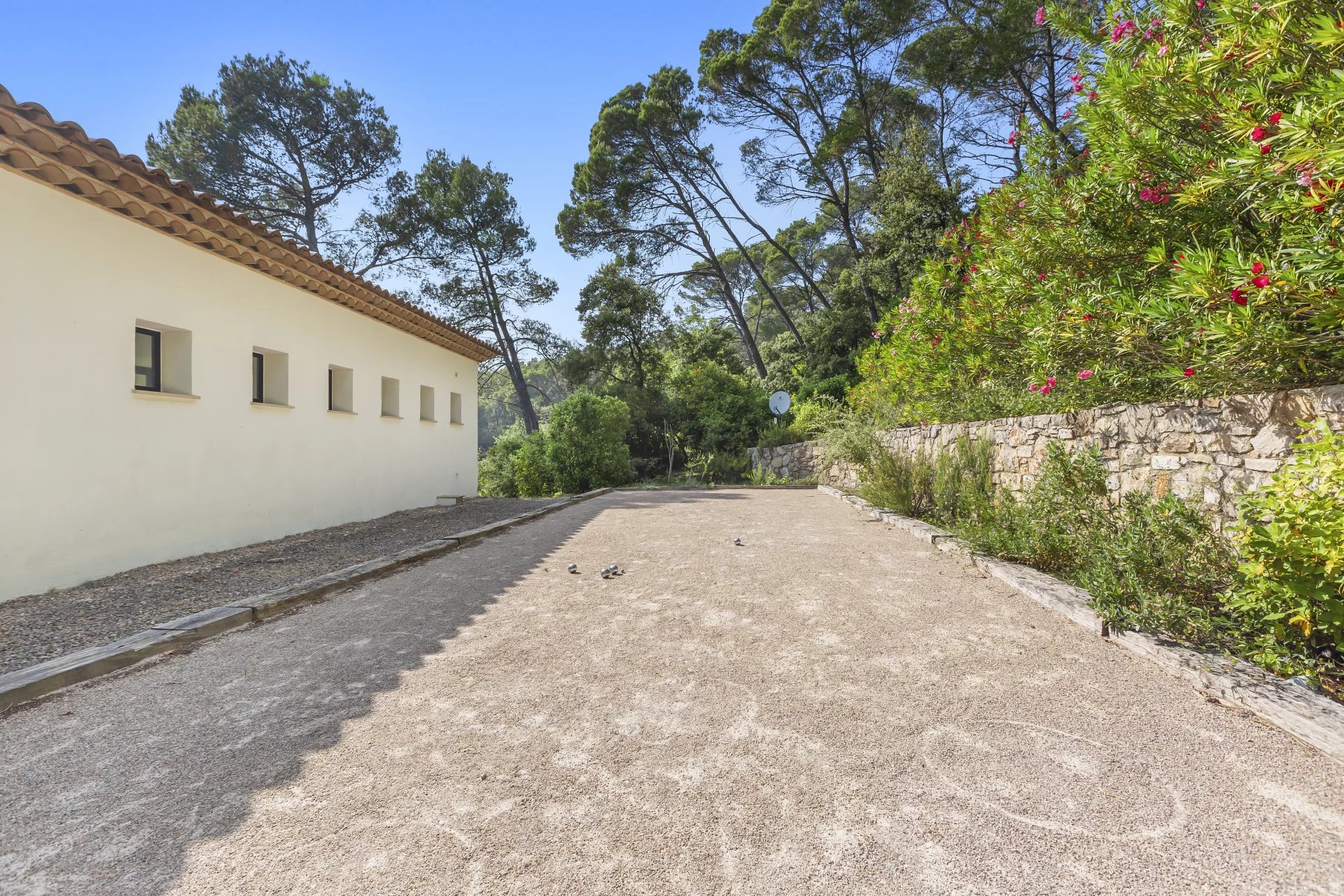 High-end features include underfloor heating and cooling beneath elegant Indian sandstone flooring, a fully integrated alarm system, and a landscaped garden secured by an electric gate. A spacious garage, additional parking, and a charming pétanque court complete the exterior amenities.