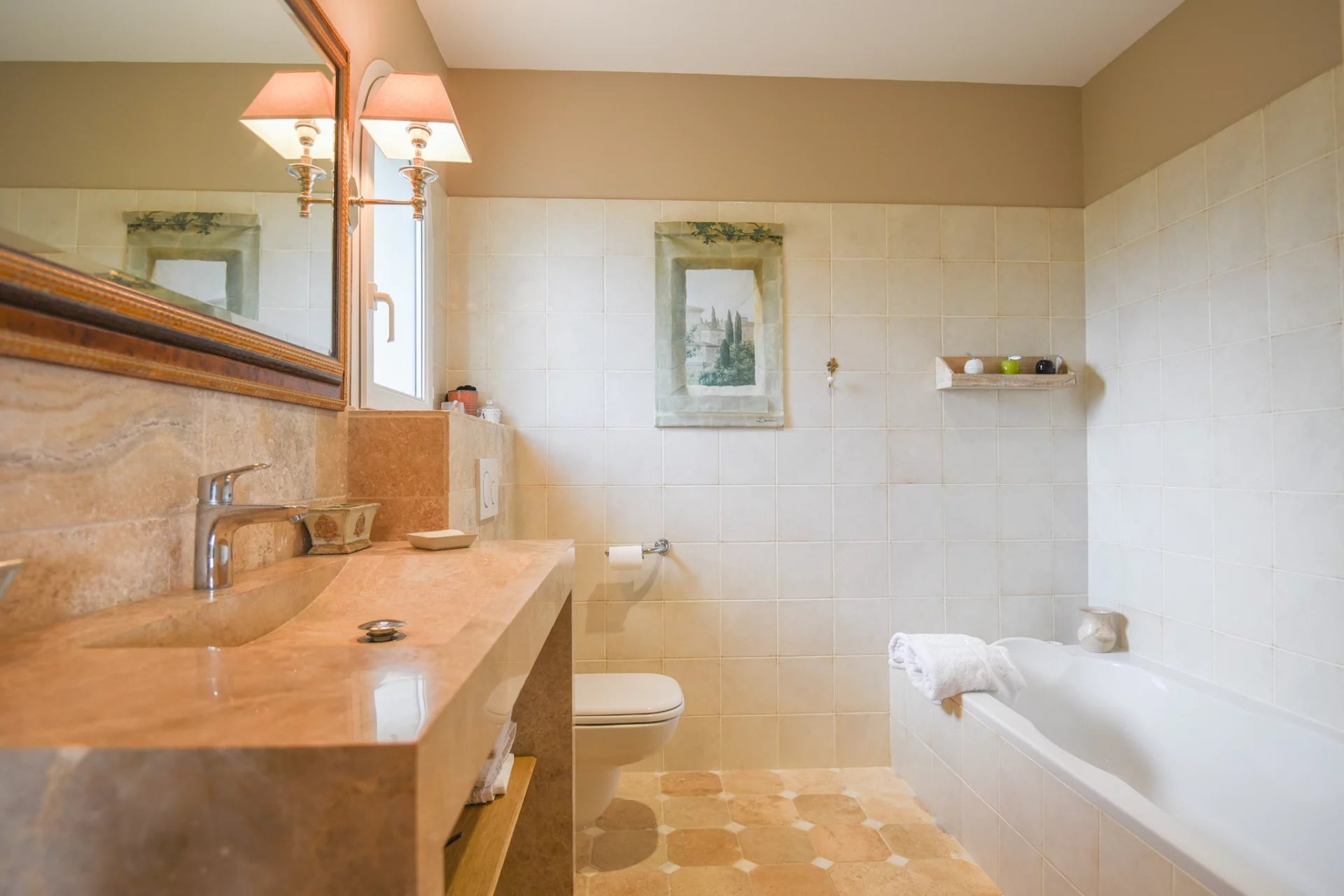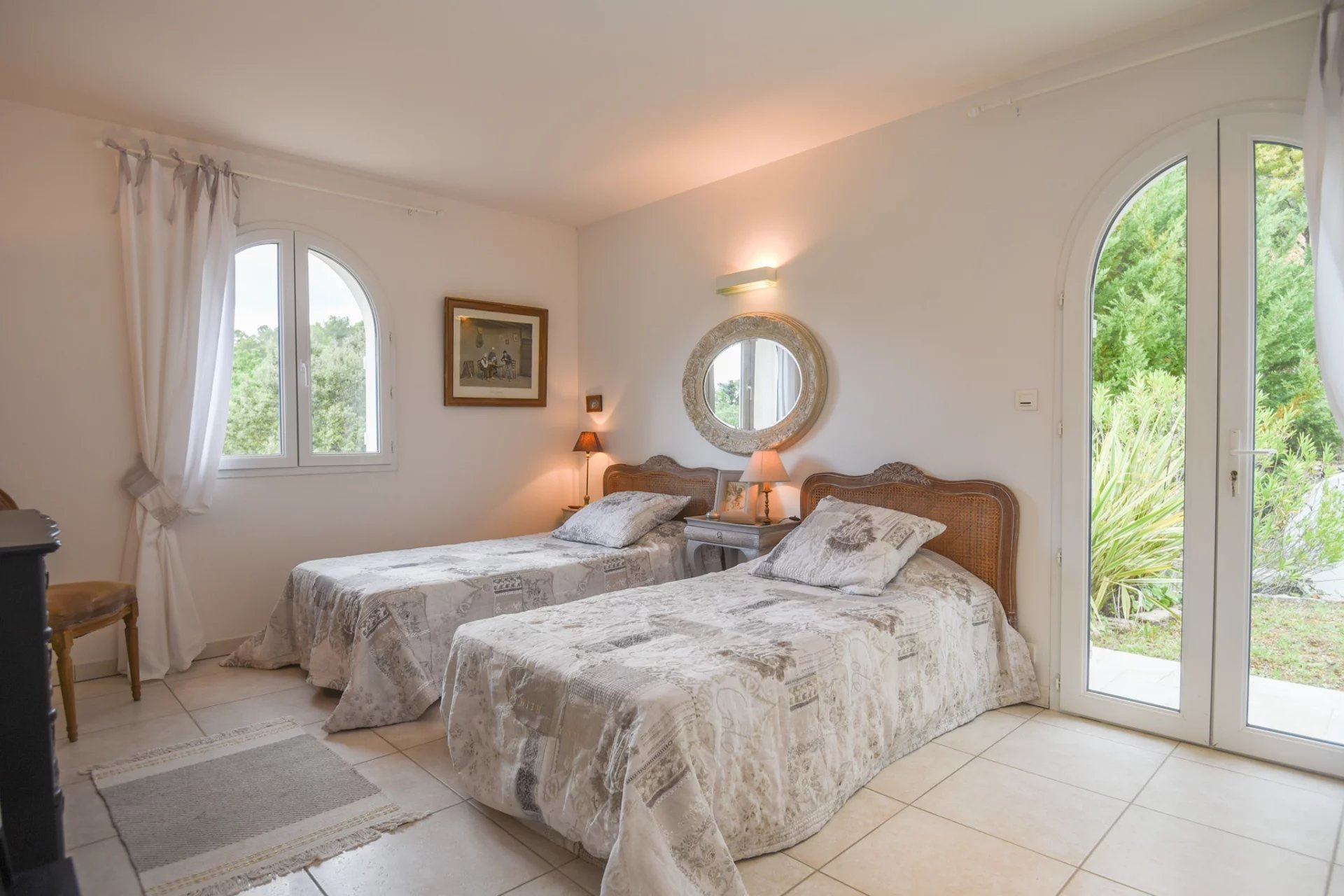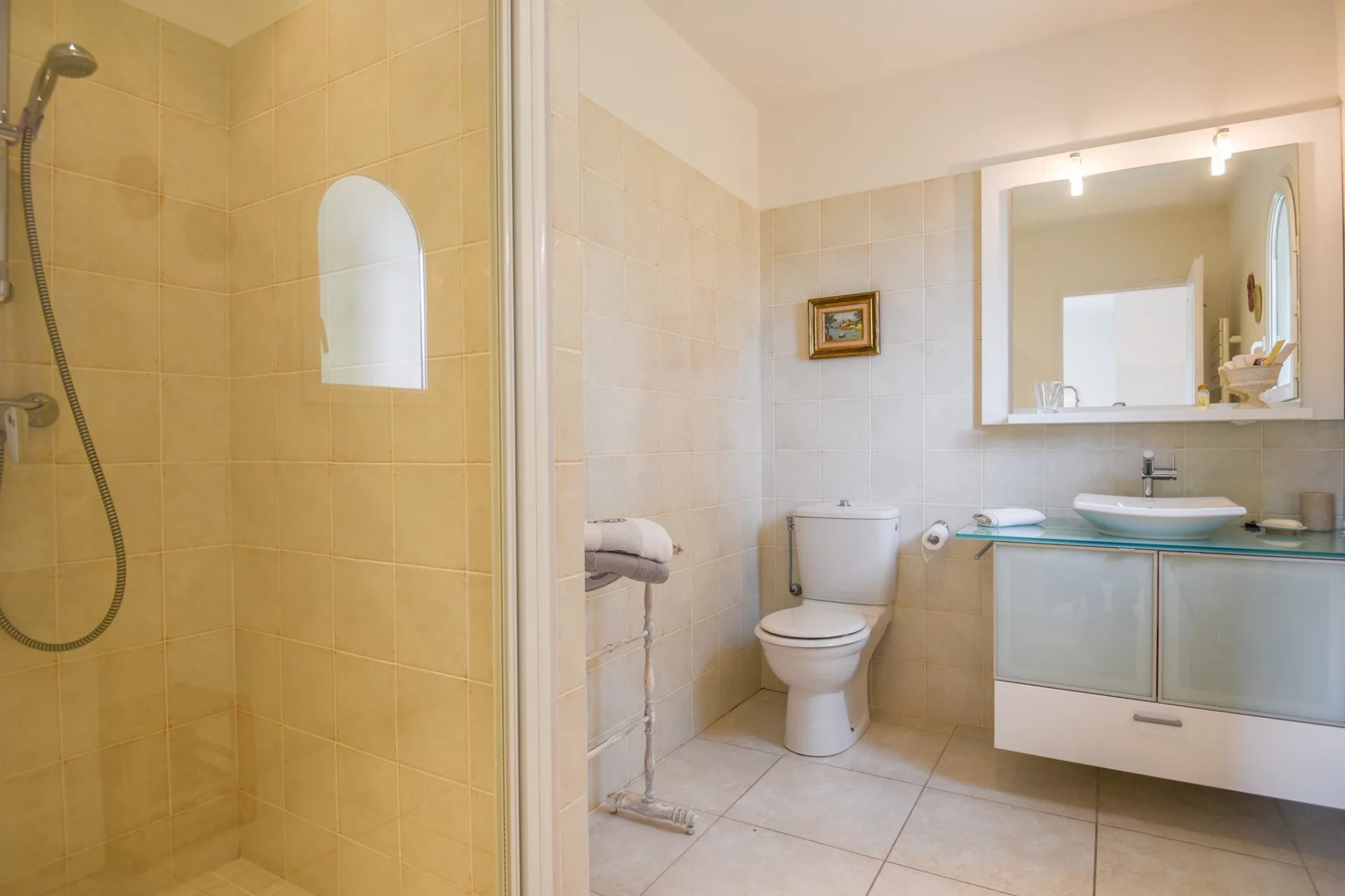 On the first floor there are 4 suites, each with its own bathroom and toilet and a terrace. The south-facing suites have private balconies overlooking the hills. The two suites at the back have a private terrace in the garden and a private entrance.