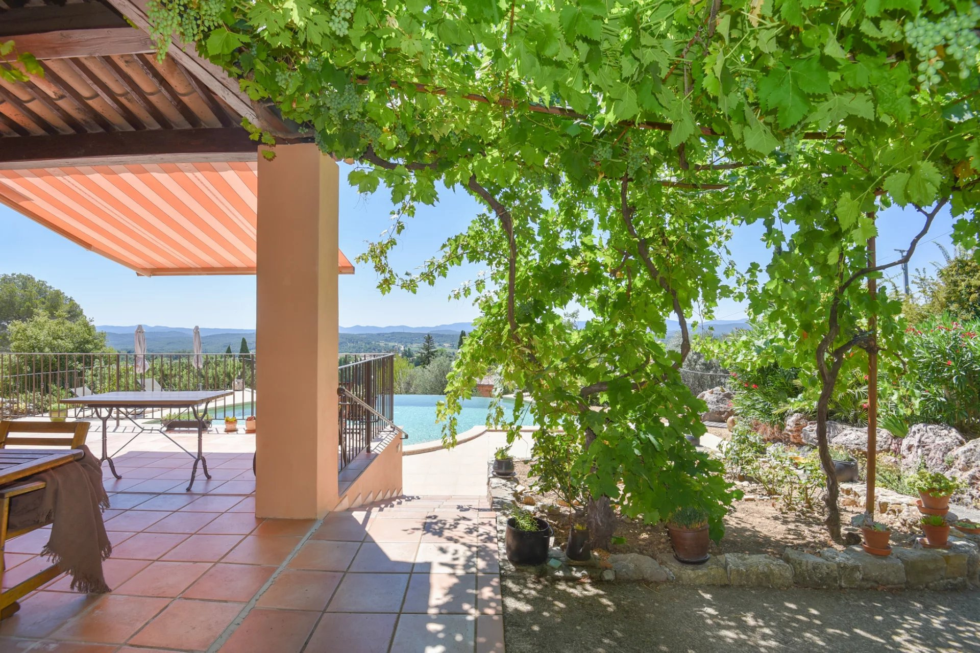 Outside, the magnificent infinity pool invites relaxation while enjoying the panoramic view. The double car shelter and the automatic gate combine functionality and security. Connected to the main sewer system and facing south, the house benefits from unmatched brightness and comfort.