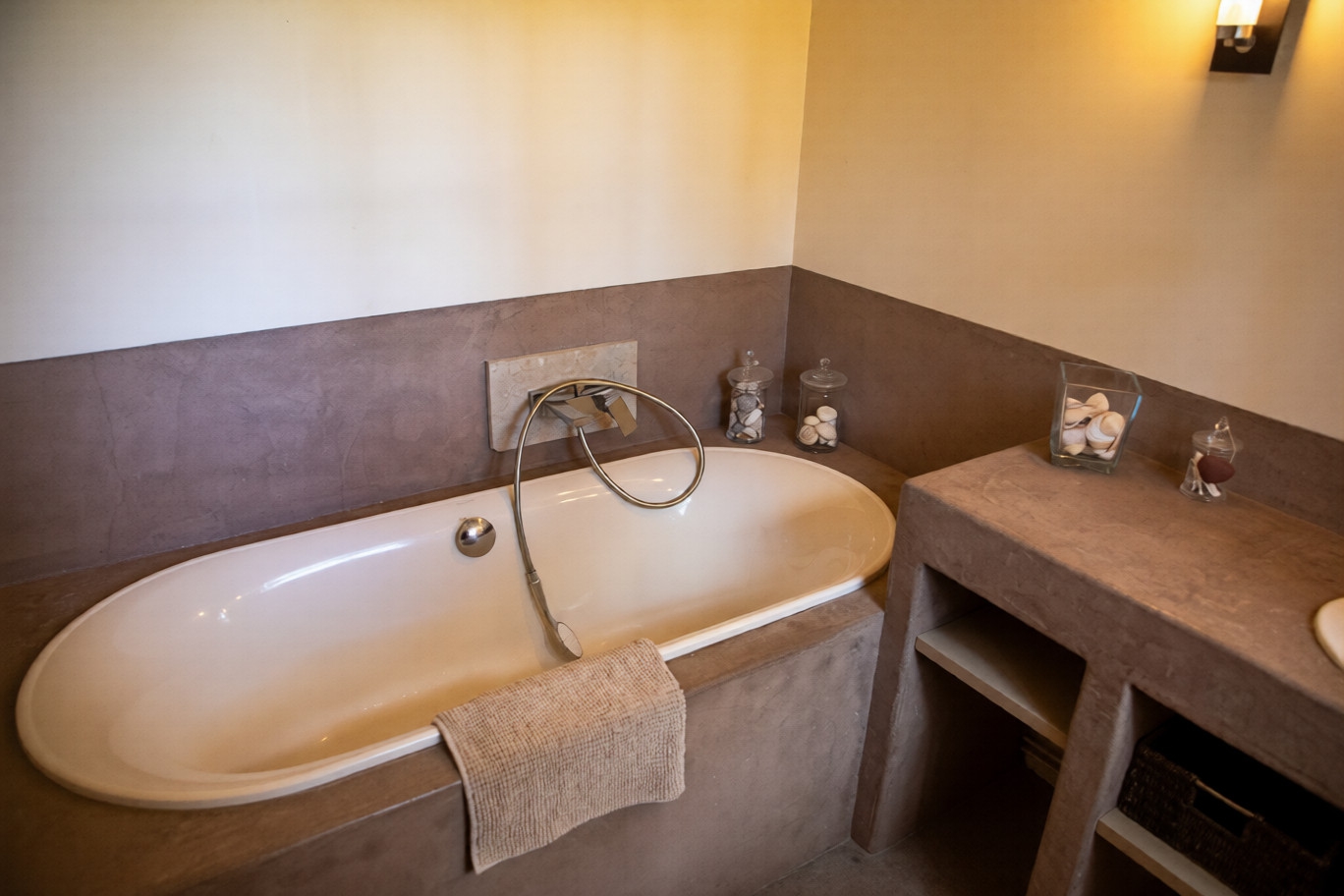 Upstairs- Two large bedrooms, including a superb master suite with its waxed concrete bathroom, combine comfort and aesthetics. A third bedroom, imbued with charm, and a bathroom with a walk-in shower complete the ensemble. Each bedroom has storage space decorated with antique doors, witnesses of the past, which add a touch of timeless elegance.