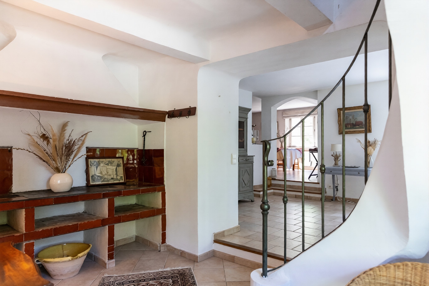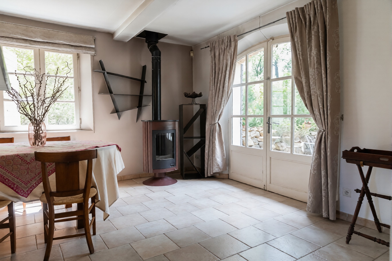 The space unfolds… From the entrance, on the west side, a warm room welcomes you, highlighted by an antique fireplace and discreet storage. The large living room, bathed in light, comes alive around a wood-burning stove, creating a soft and friendly atmosphere. The natural travertine floor, noble and timeless, gives the whole a mineral elegance. The equipped kitchen, open to the living space, invites moments of sharing and indulgence. A pantry completes this level of living with discretion and practicality.