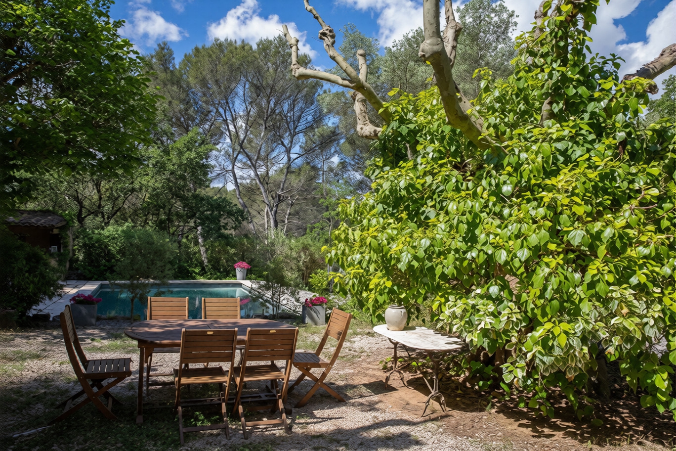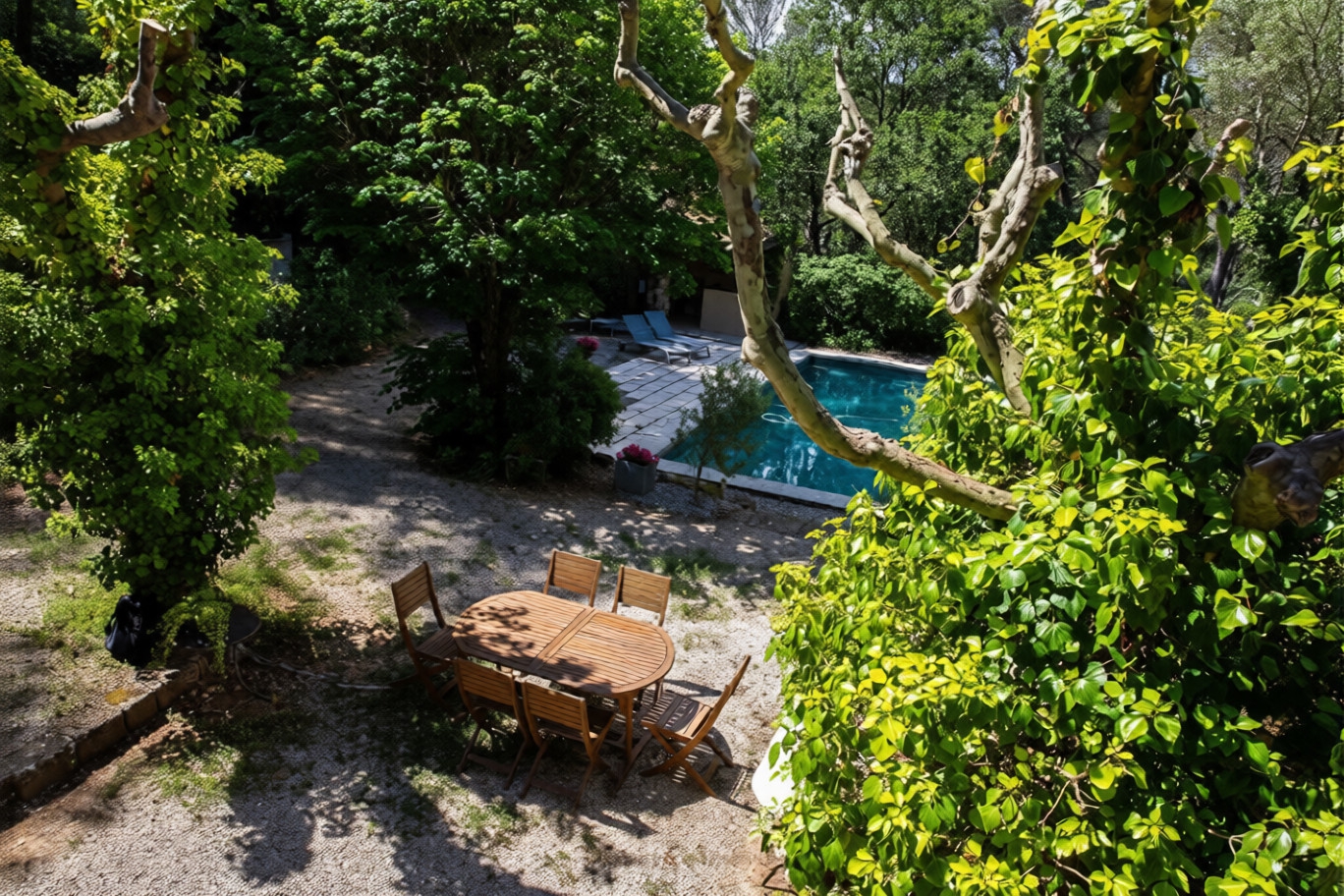 Outside… The 8,000 m2 park, generously planted with trees, unfolds its shaded paths and flowerbeds like an invitation to daydream. Two terraces, one bordering the pool, the other in front of the living room, offer relaxing spots perfect for balmy summer evenings. And around a grove, a wonderful old-fashioned washhouse is revealed, like a poetic nod to the Provence of yesteryear. The elegantly tiled pool is accompanied by a furnished pool house, a true place of conviviality and relaxation for summer days with family or friends.