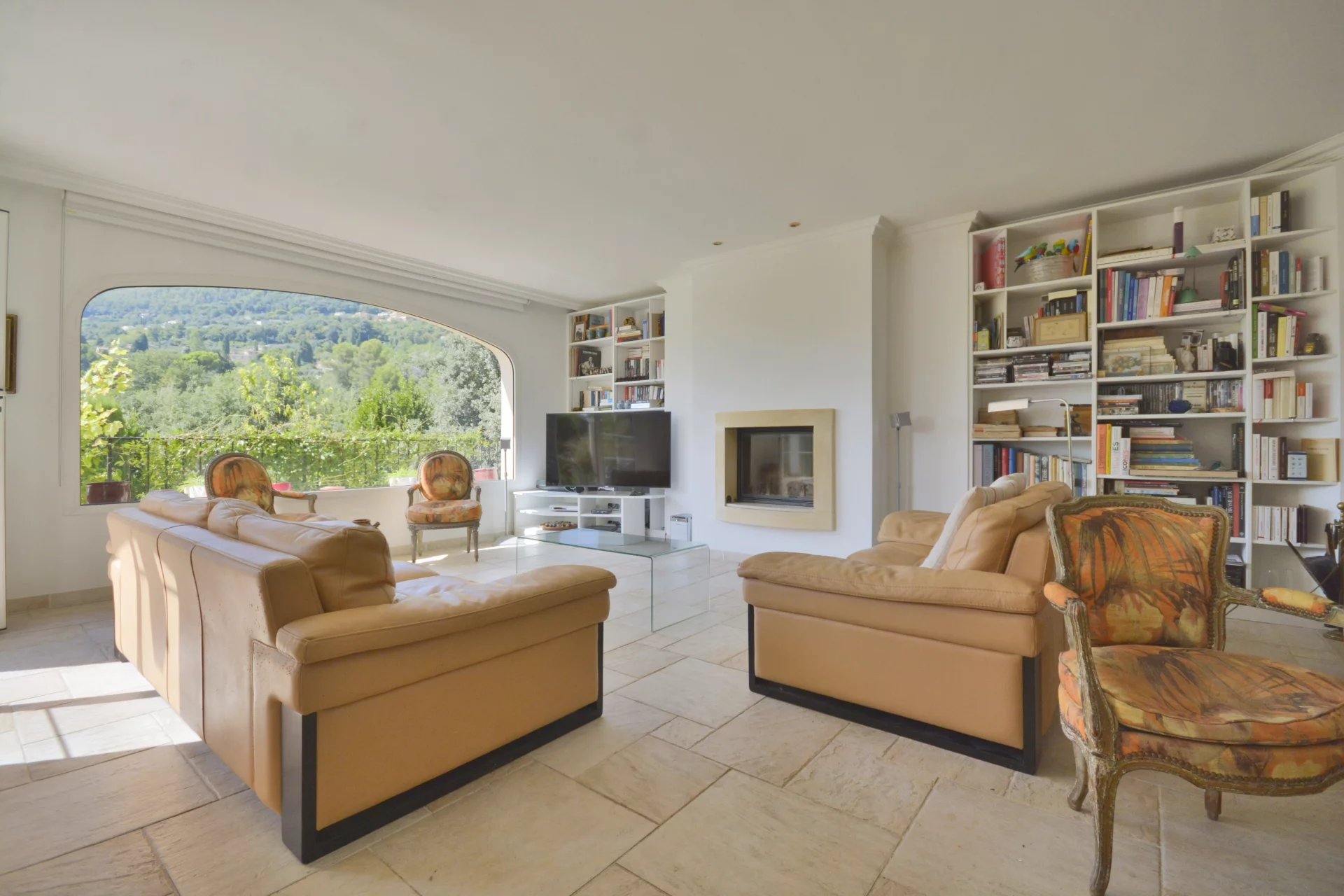 Large, bright living room with a classic fireplace