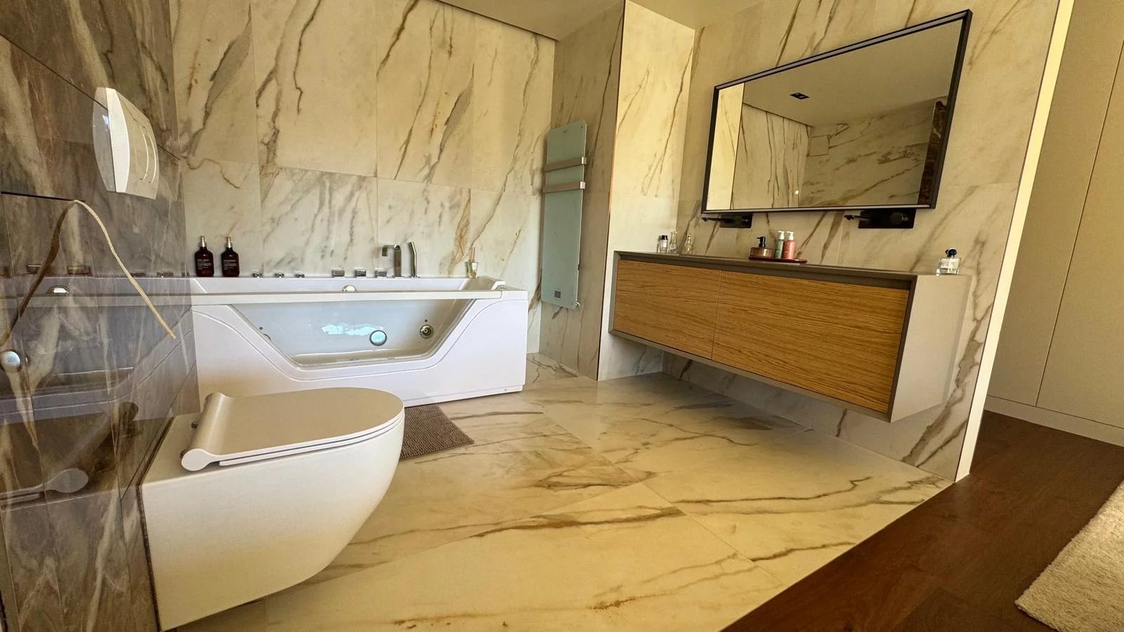 Facing east-south-west, features a beautiful living/dining/kitchen area opening onto a continuous terrace and an enclosed loggia. The sleeping area comprises a master bedroom with en-suite bathroom, two further bedrooms, a shower room, a separate toilet, and a laundry room.