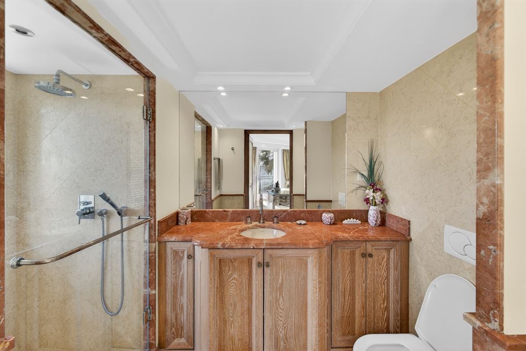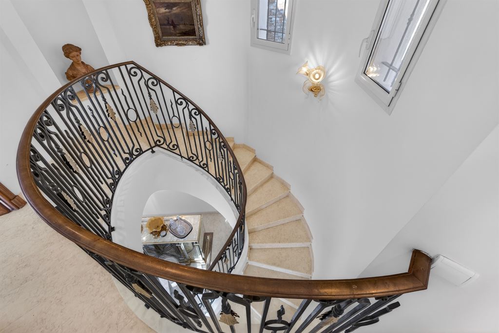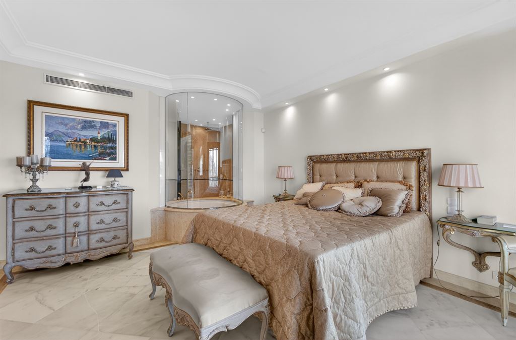 The upper level includes an entrance hall leading to two en suite bedrooms, providing a private guest or family area. The main living level features a triple reception room of approximately 100 m2, opening onto the garden and enjoying uninterrupted sea views. The layout allows for a natural connection between indoor and outdoor spaces. A fully equipped kitchen, guest toilet and a master suite with dressing room and bathroom complete this level.