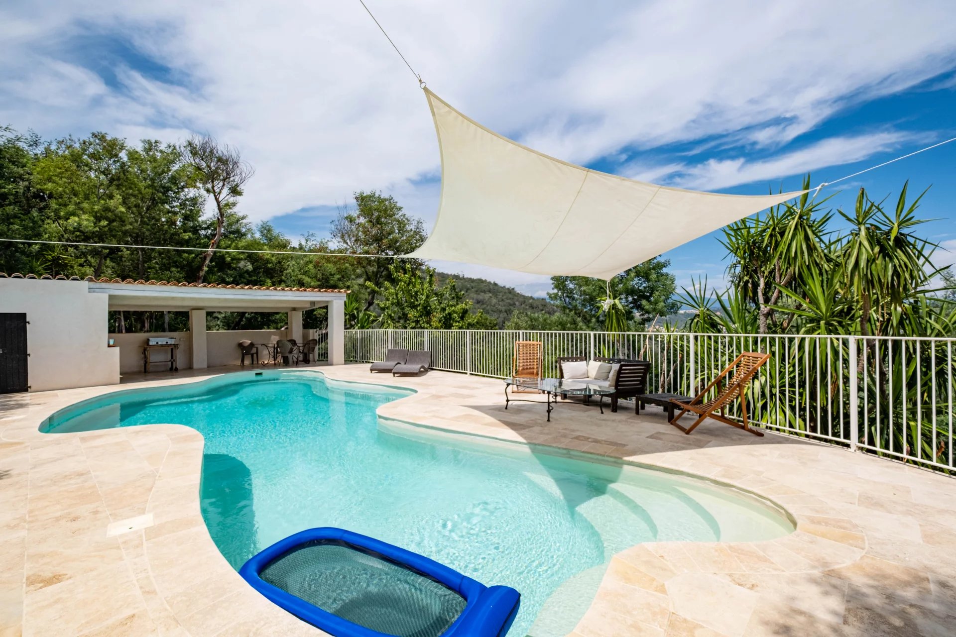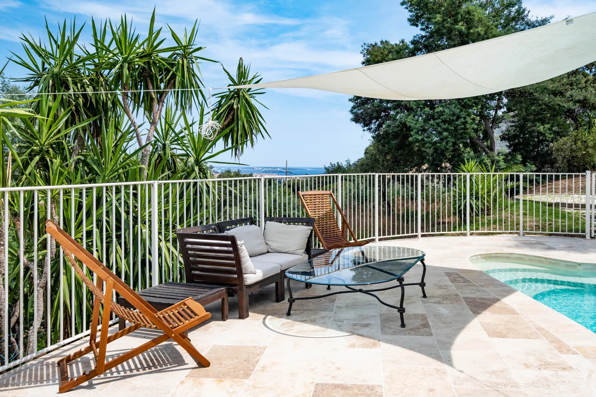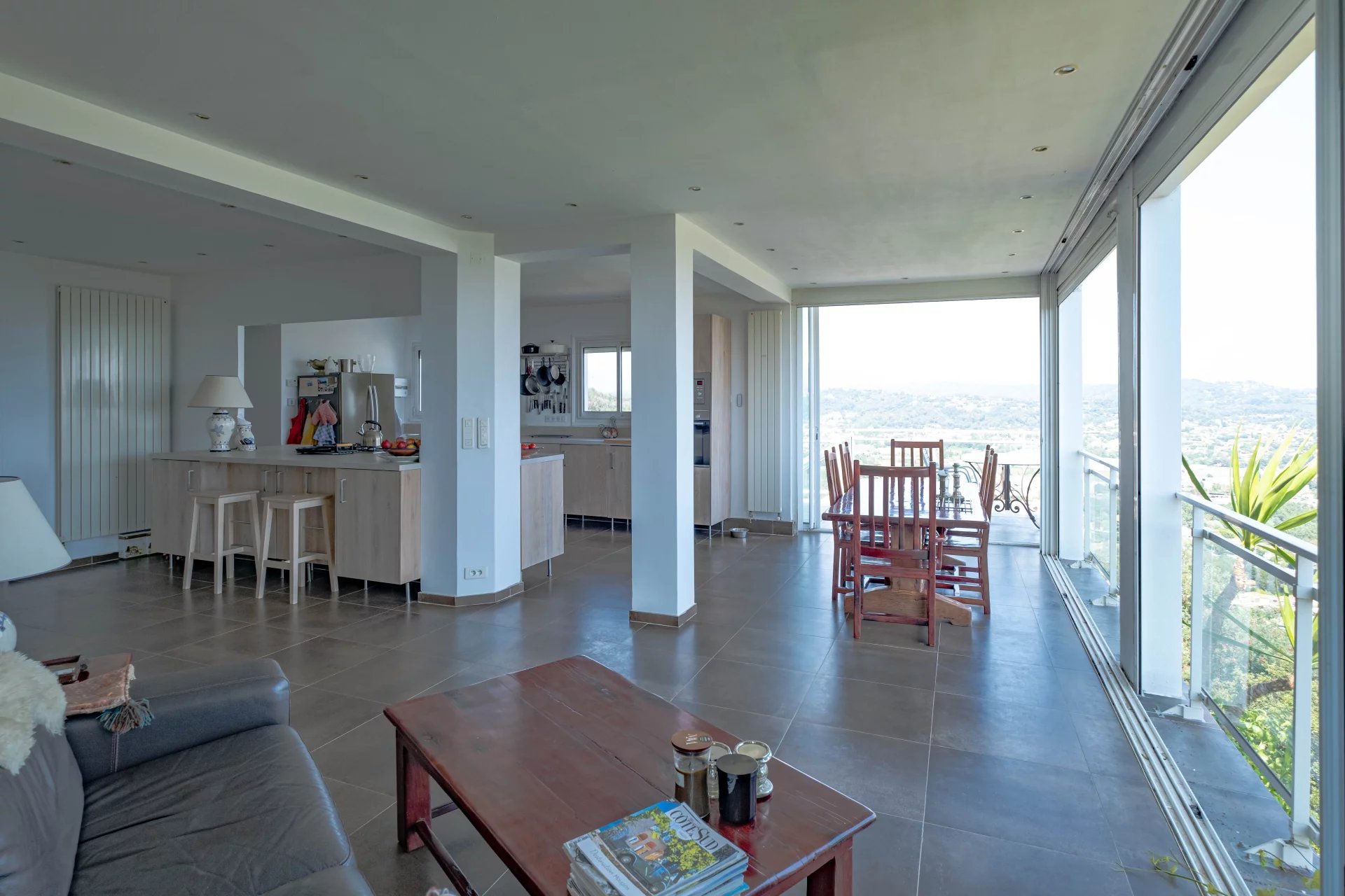 Located on the heights of Mandelieu, this contemporary-style villa boasts breathtaking 270-degree panoramic views of the islands, the bay of Cannes, the Esterel massif and the Alps.