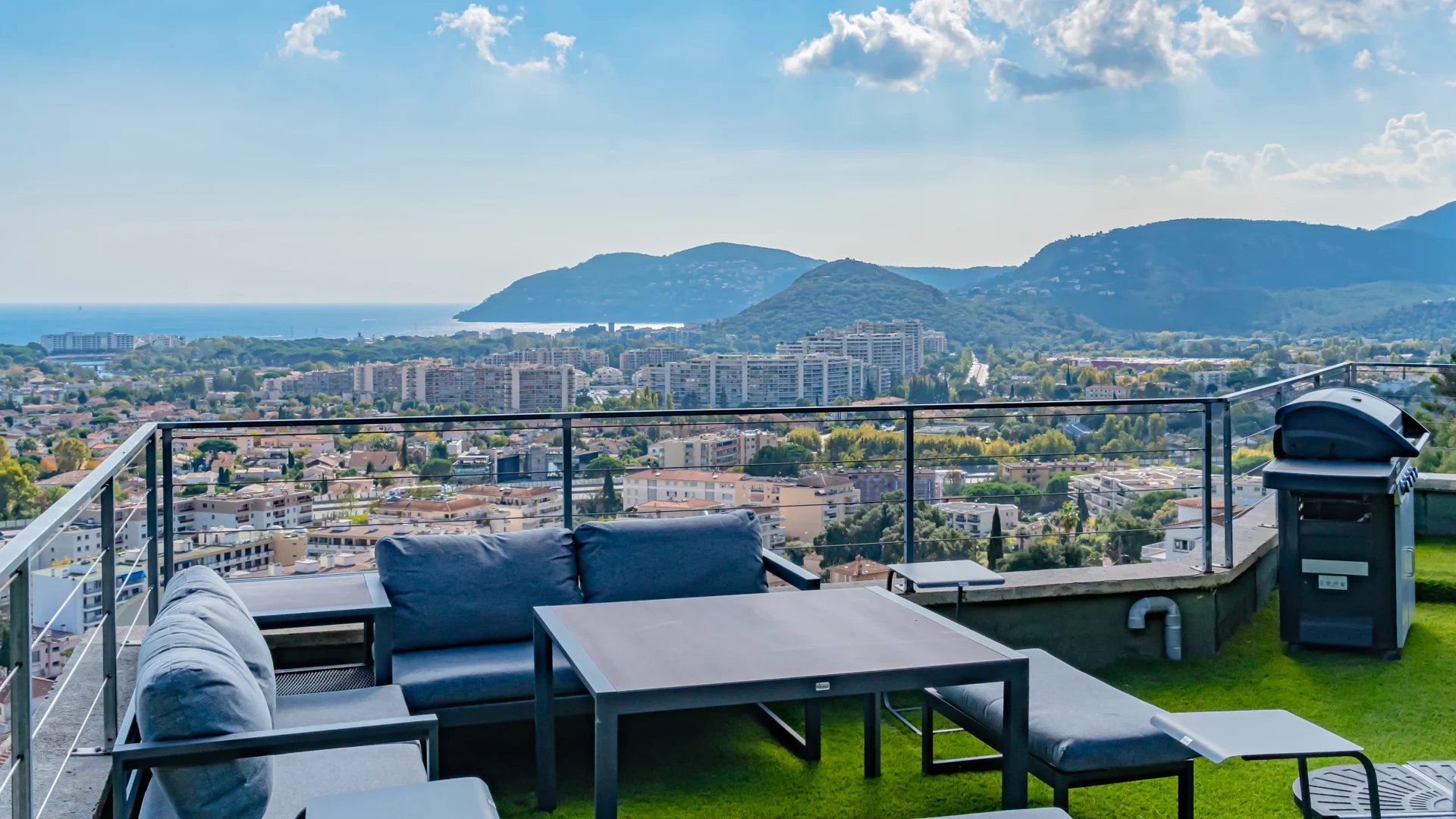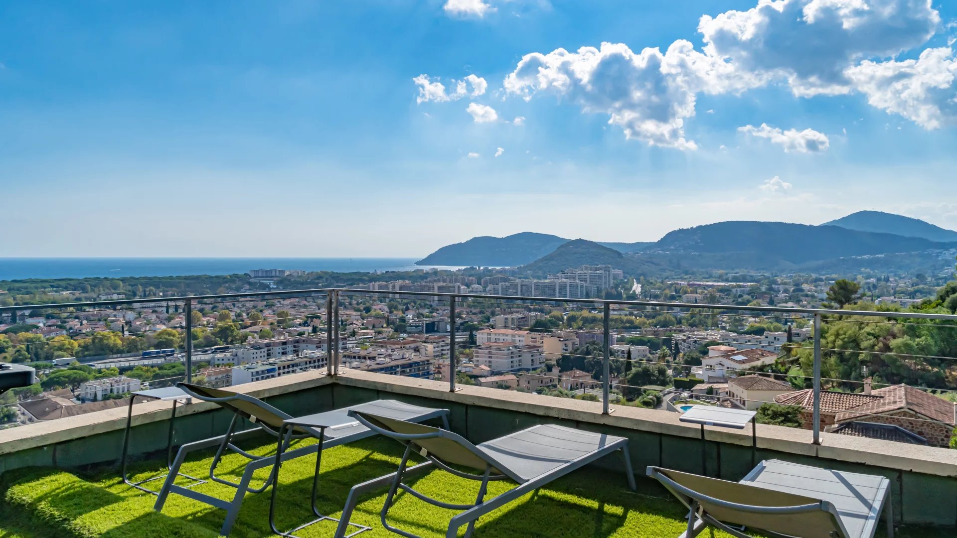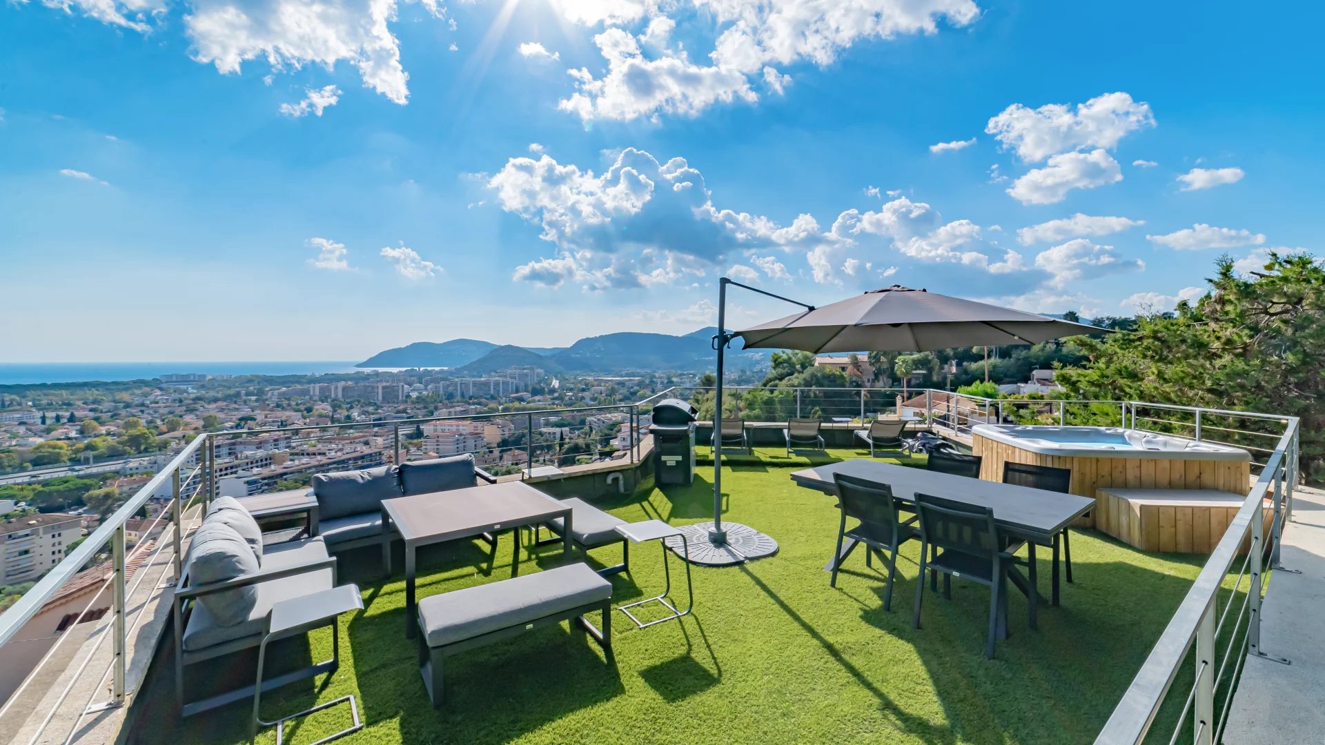– Accessible via an external staircase, the fully fitted rooftop terrace provides a unique relaxation area, featuring a spa and offering breathtaking views over the Bay of Cannes and the Esterel hills.