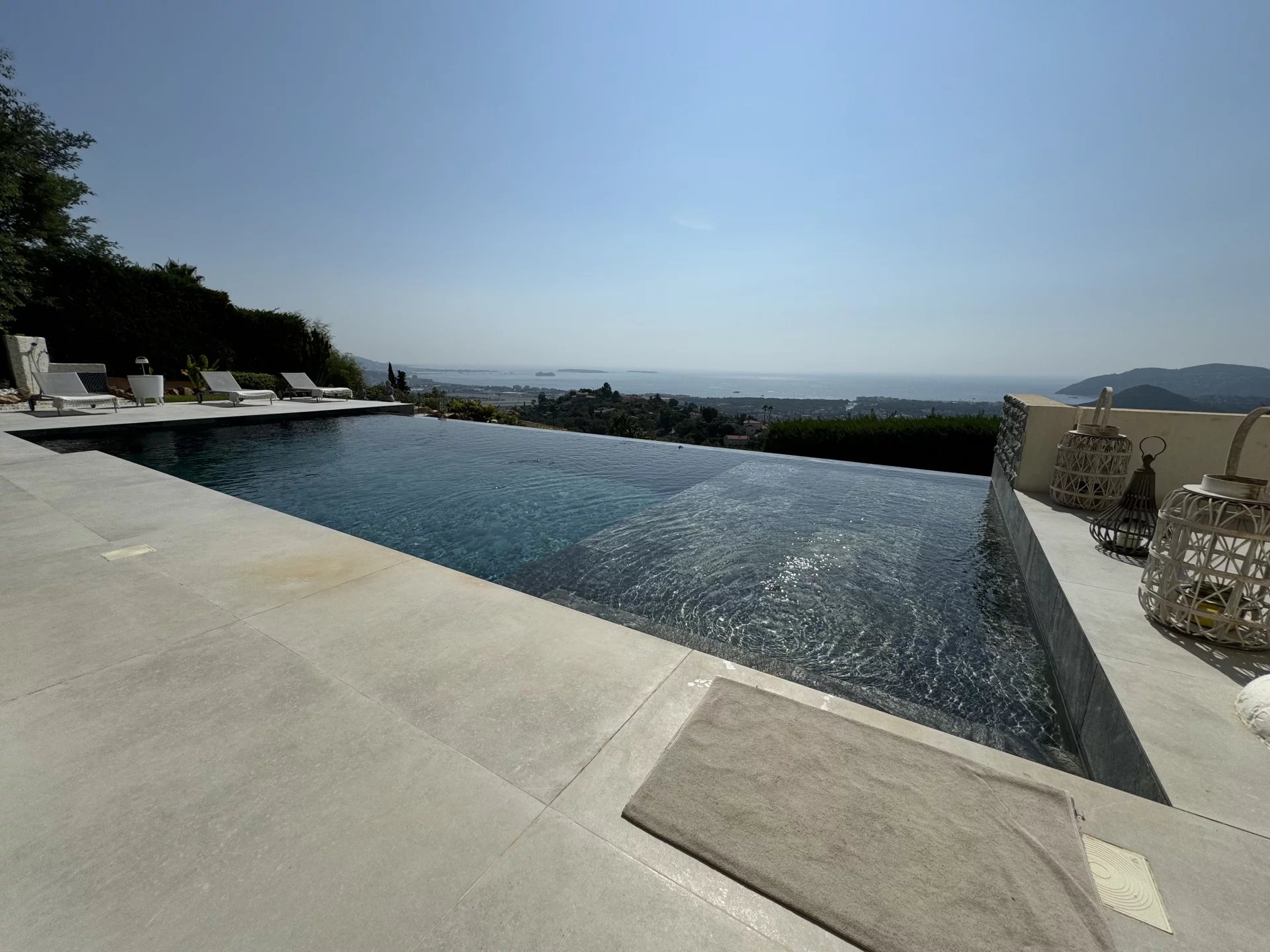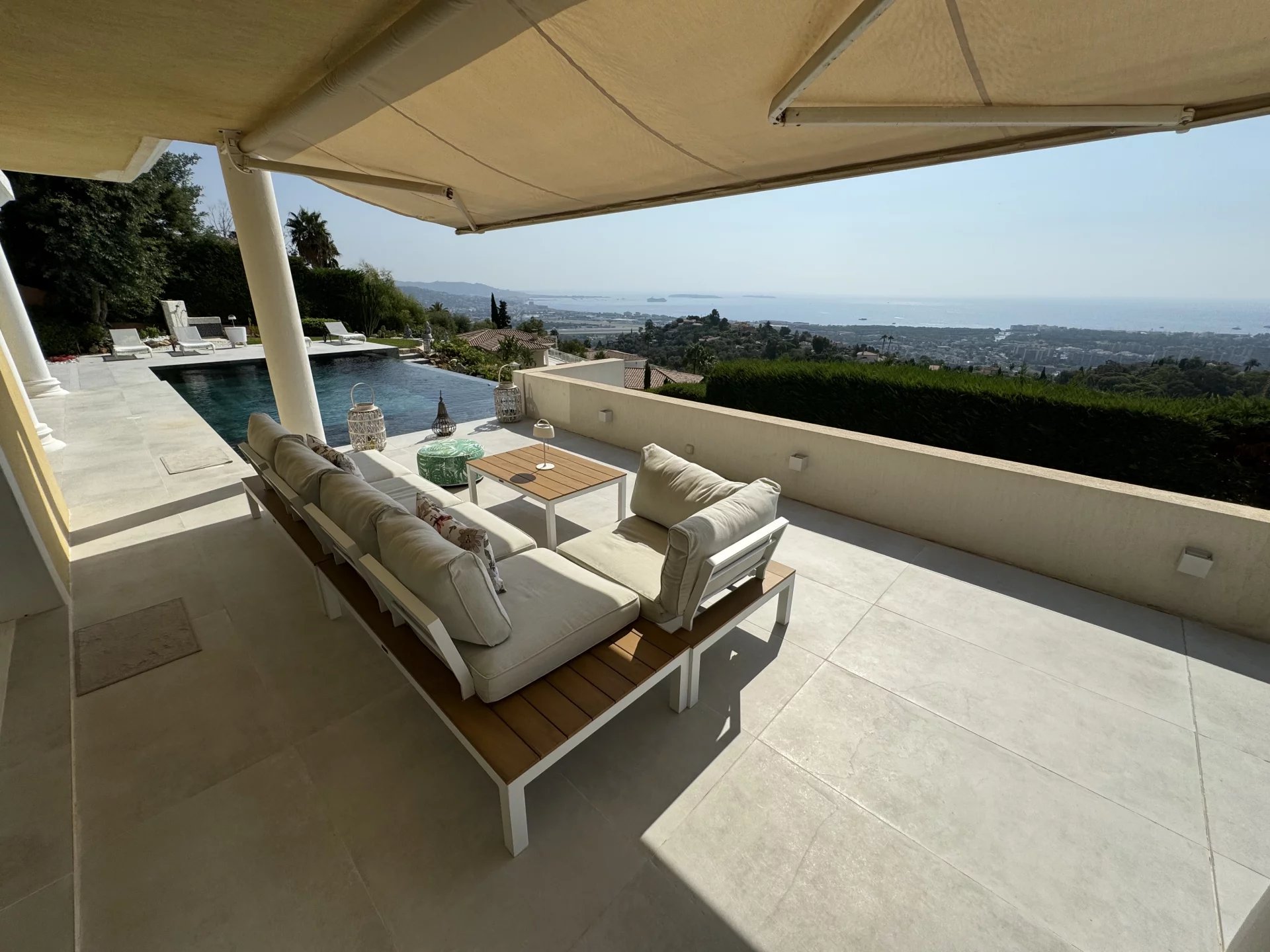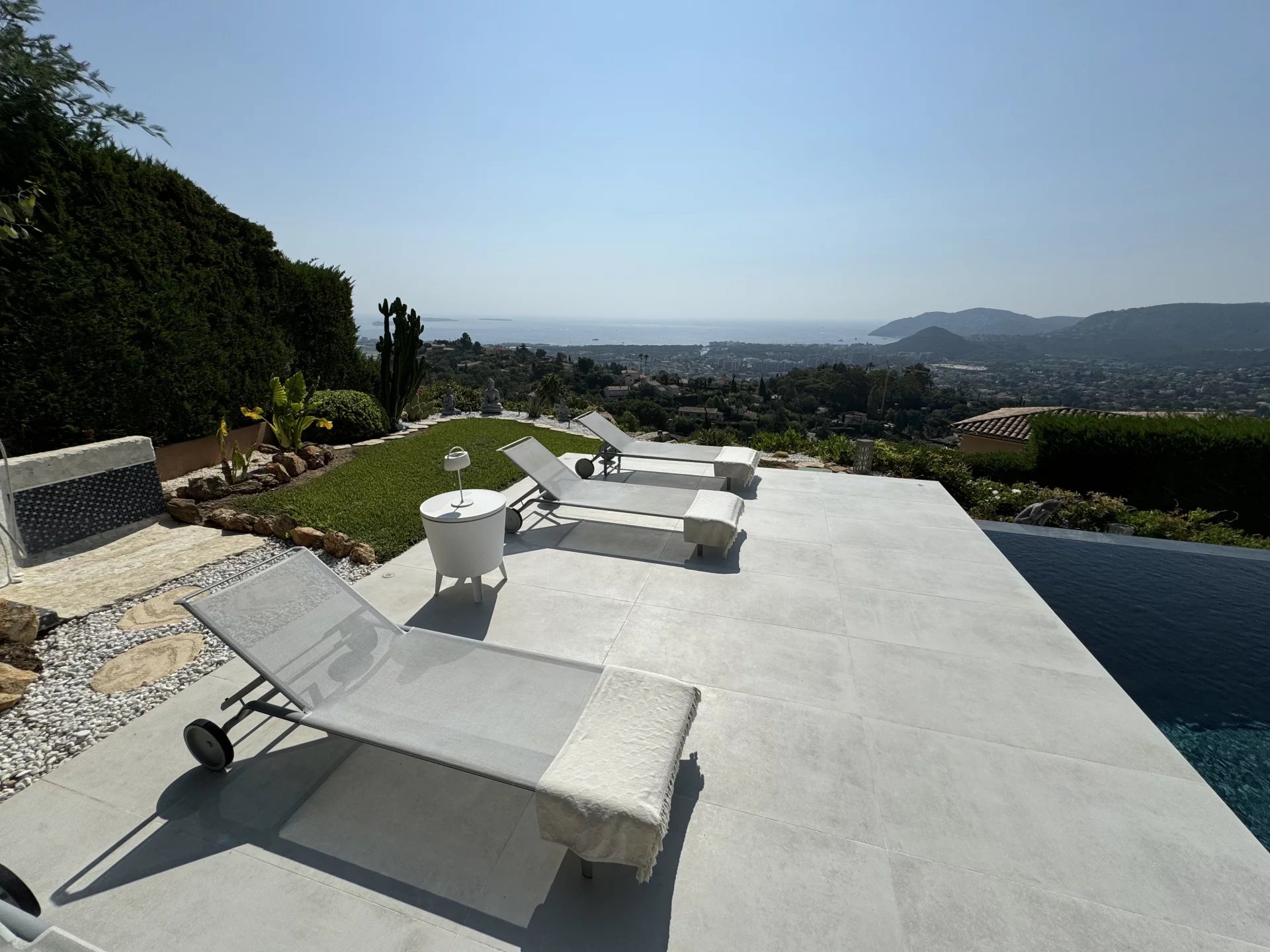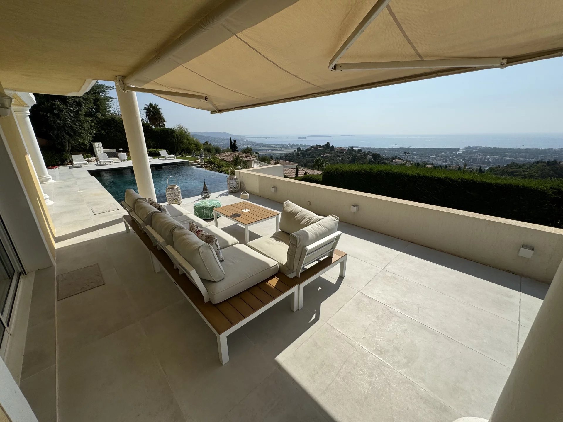 Nestled on the heights of Mandelieu-la-Napoule, this exquisite 180 m2 villa offers breathtaking 180 degree panoramic views of the sea and surrounding hills, just 5 minutes from the city center.