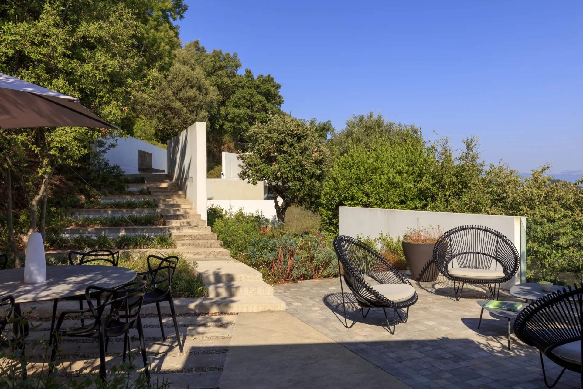 Located in the hills above Mandelieu-la-Napoule, within the Estérel Residential Park, this renovated villa of approximately 140m2 of living space sits on a landscaped plot of 1,347m2. Facing east and west, it enjoys a commanding position offering magnificent panoramic views of the sea and the Estérel hills.