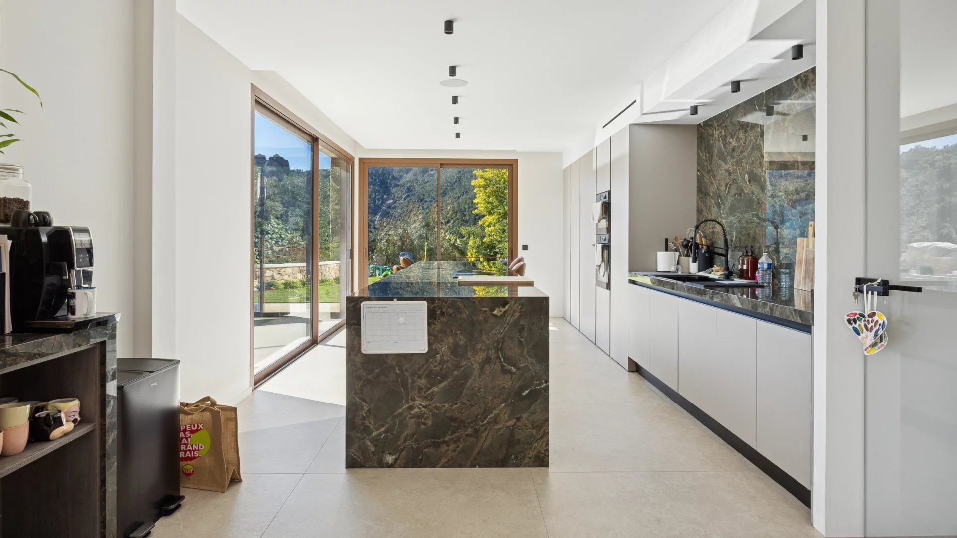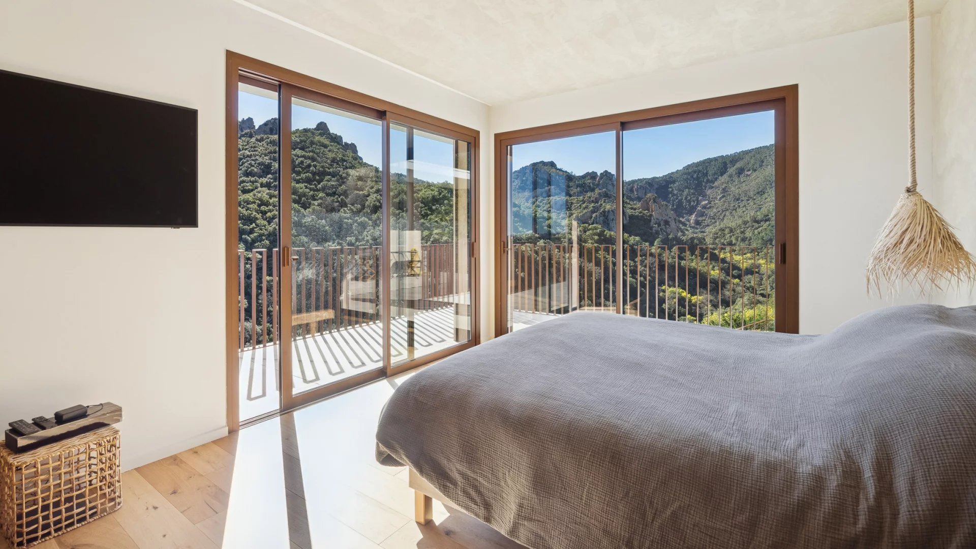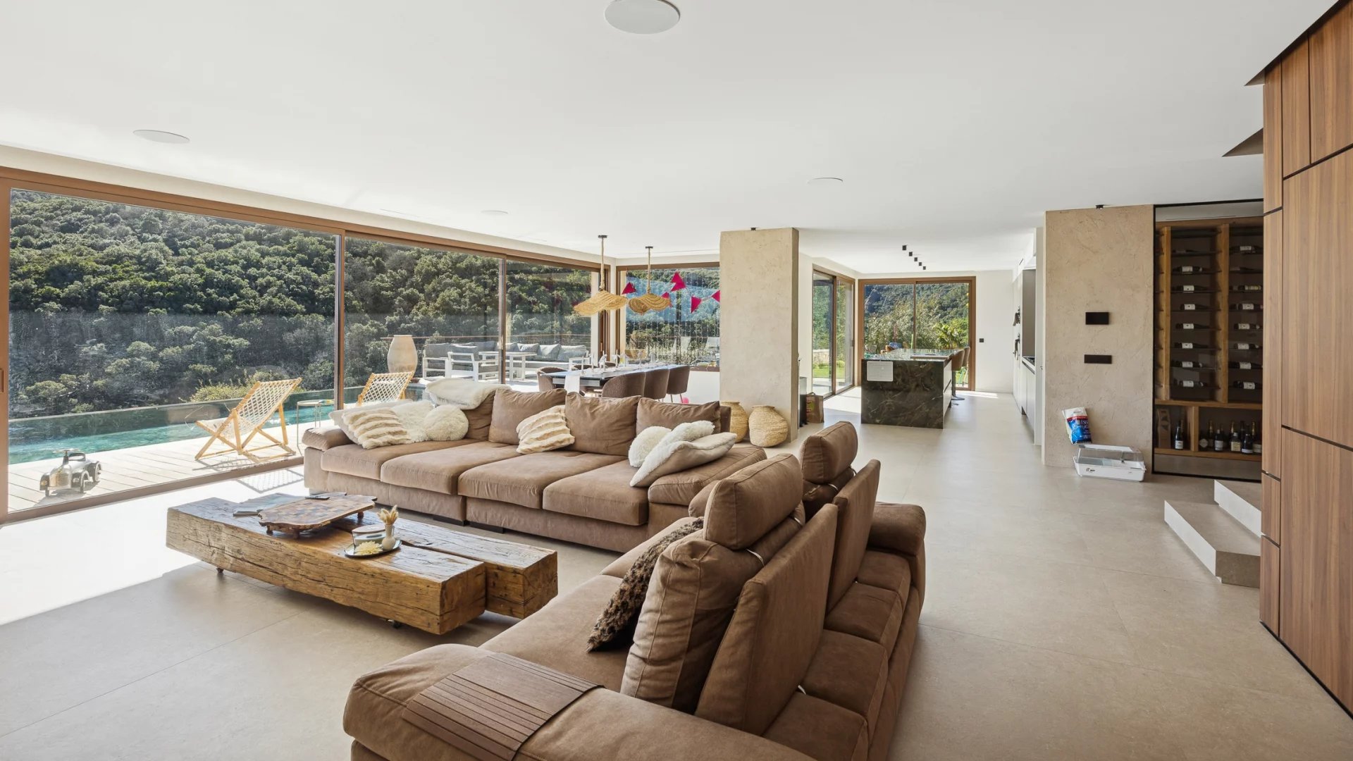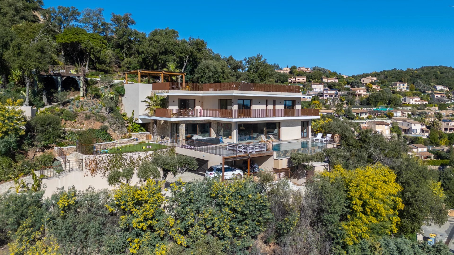 Built on a south-facing plot of over 2,000 m2, it enjoys privacy and peace and quiet, in the heart of a secure estate bordering the forest of the Massif de l’Esterel.