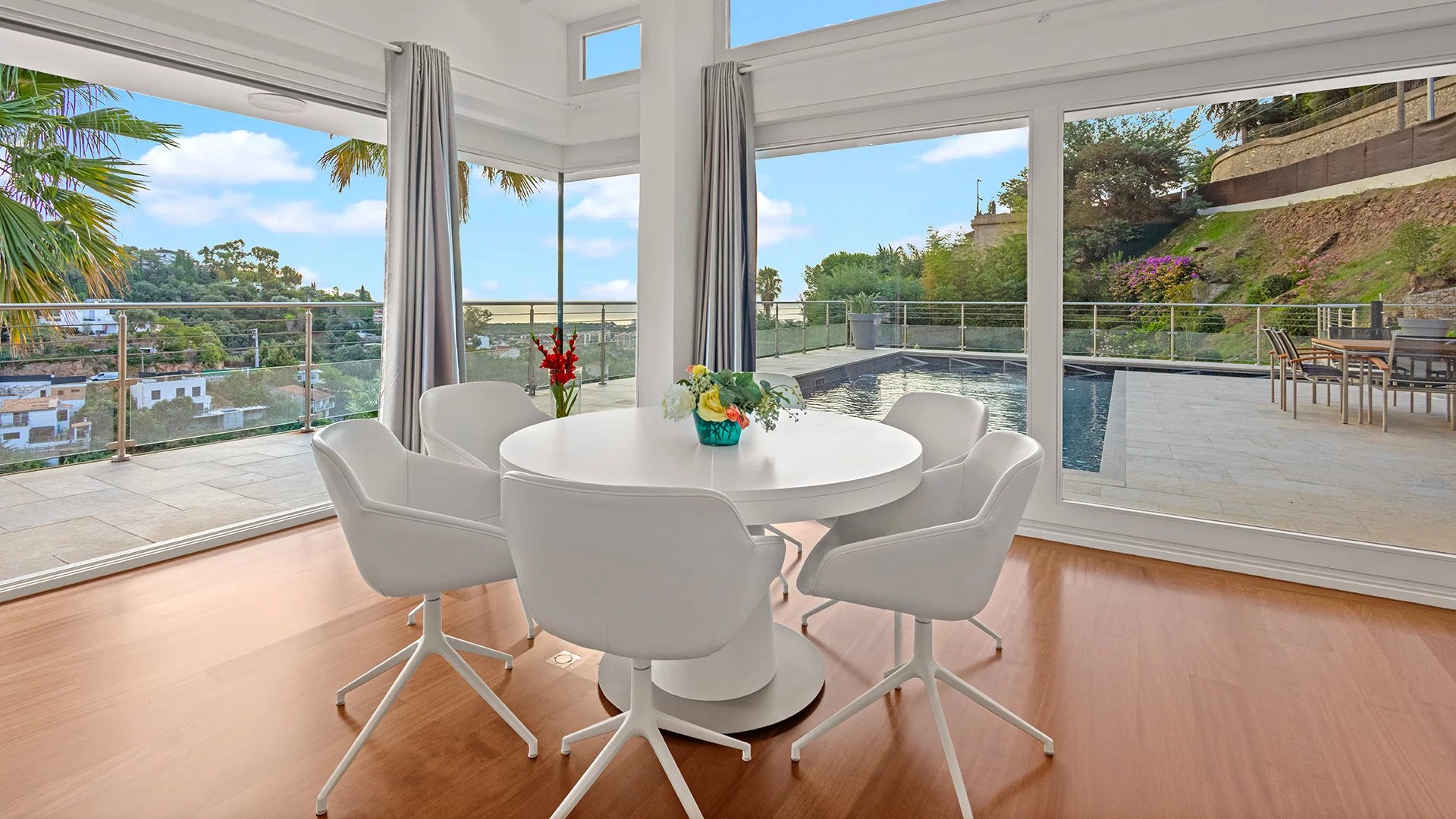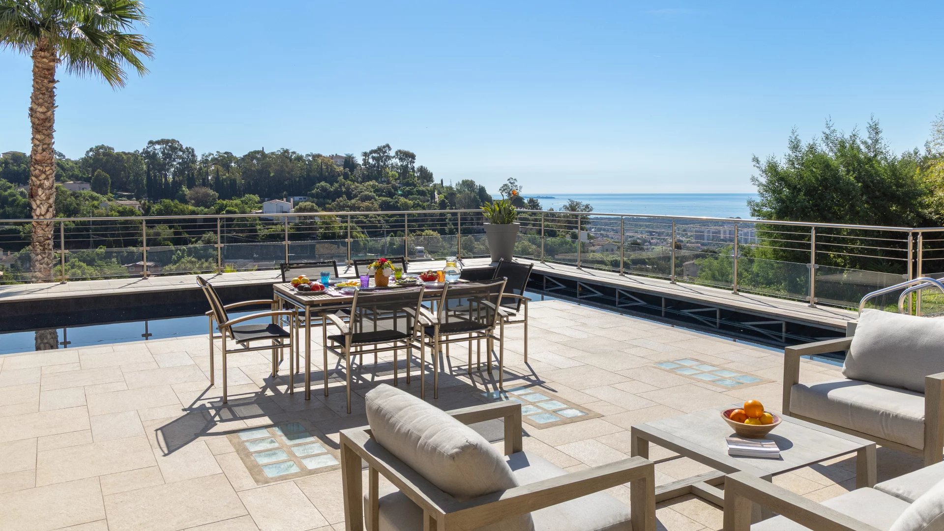 This contemporary-style villa, perched on the hills of Termes in Mandelieu, offers a panoramic view that seamlessly blend the sea with the surrounding hills.