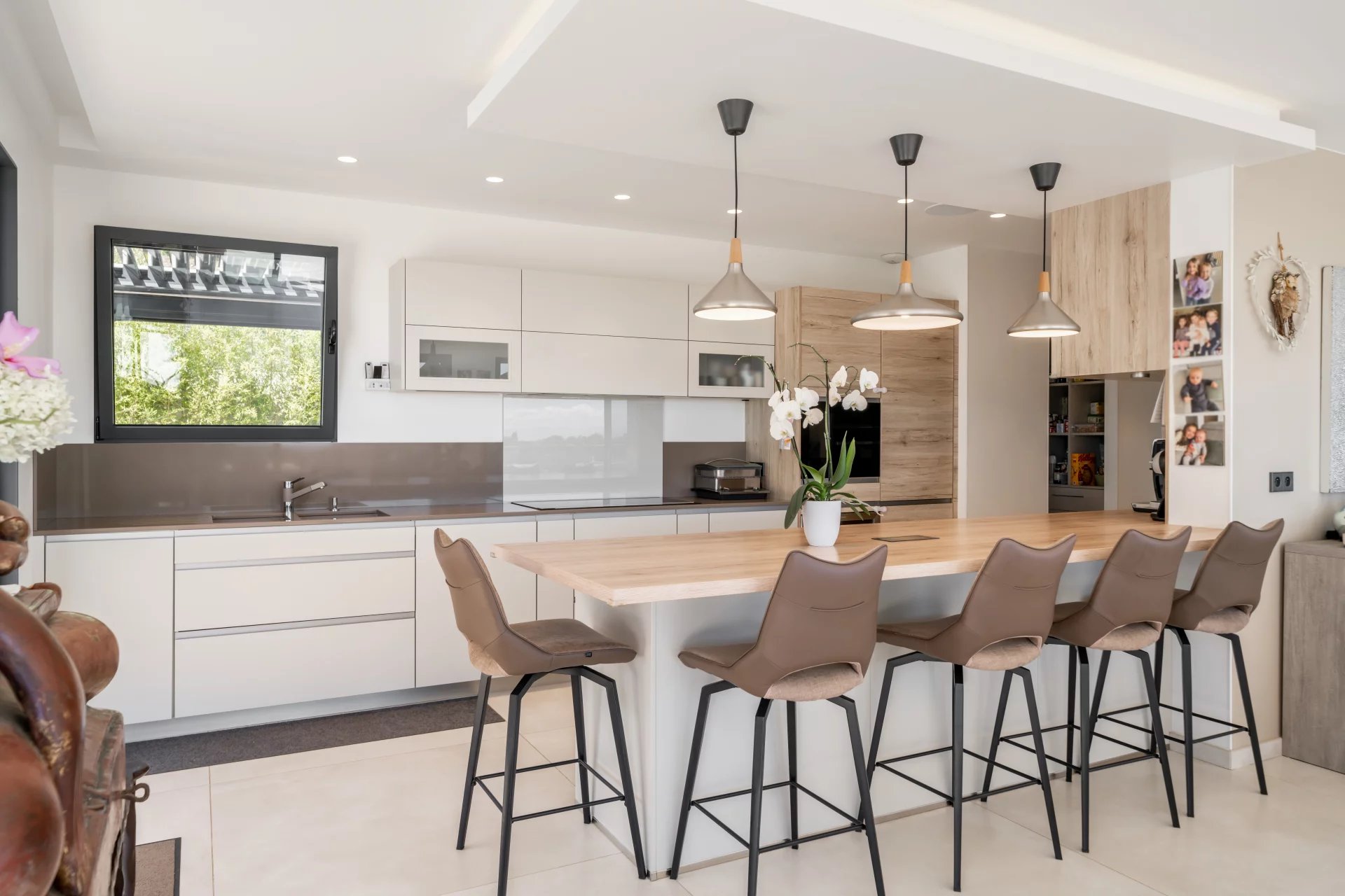 On the ground floor, an entrance hall opening into a spacious and bright 90 m2 living room (and dining room), a fully equipped kitchen partially open to the dining room, a pantry, a guest toilet, one in-suite bedroom with a dressing room and large bathroom, two further bedrooms, one bathroom, one office, and one large laundry room.