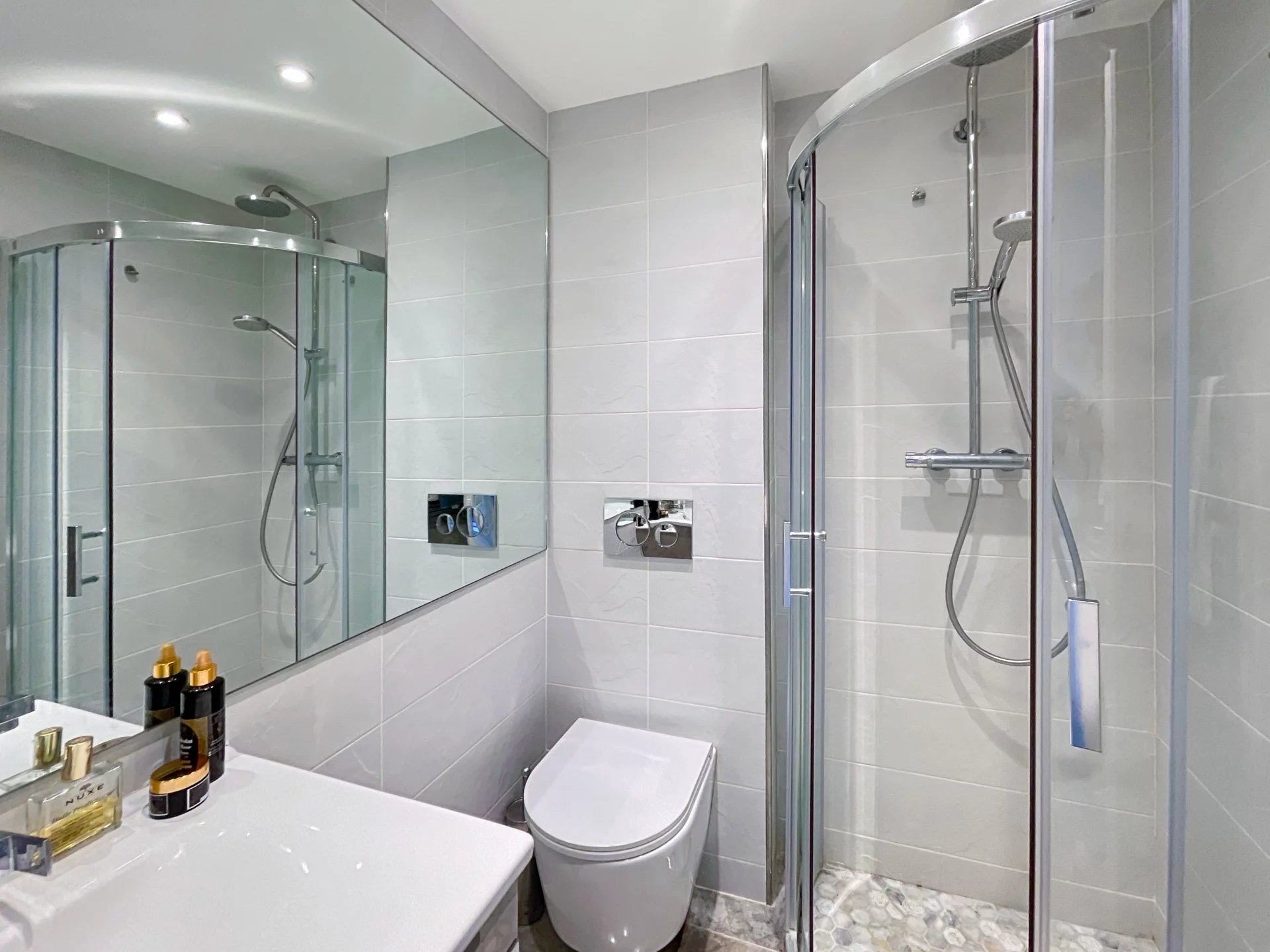 On the upper floor, two bedrooms with terraces offer stunning views of the sea. A shower room with WC ensures the comfort of the occupants. And the master bedroom, with its large bathroom including a shower, bathtub, and separate WC, also has its terrace.