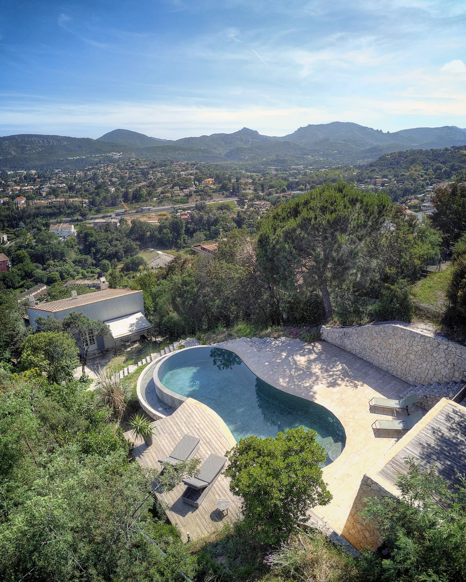 An infinity pool, accompanied by a large terrace, creates an ideal relaxation area. The adjacent pool house includes a bar, a shower, toilets, and a storage room.