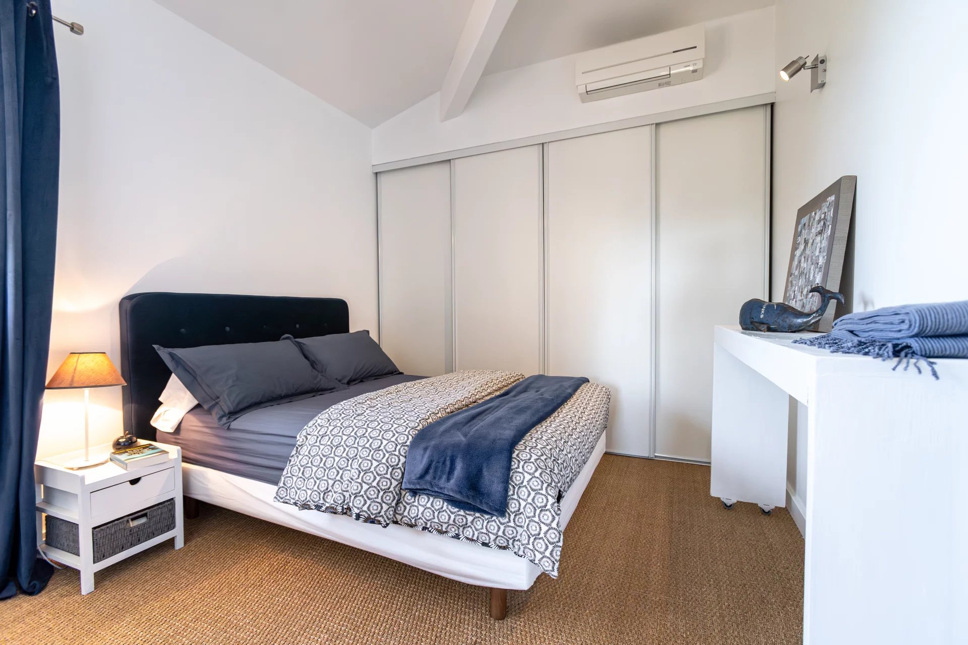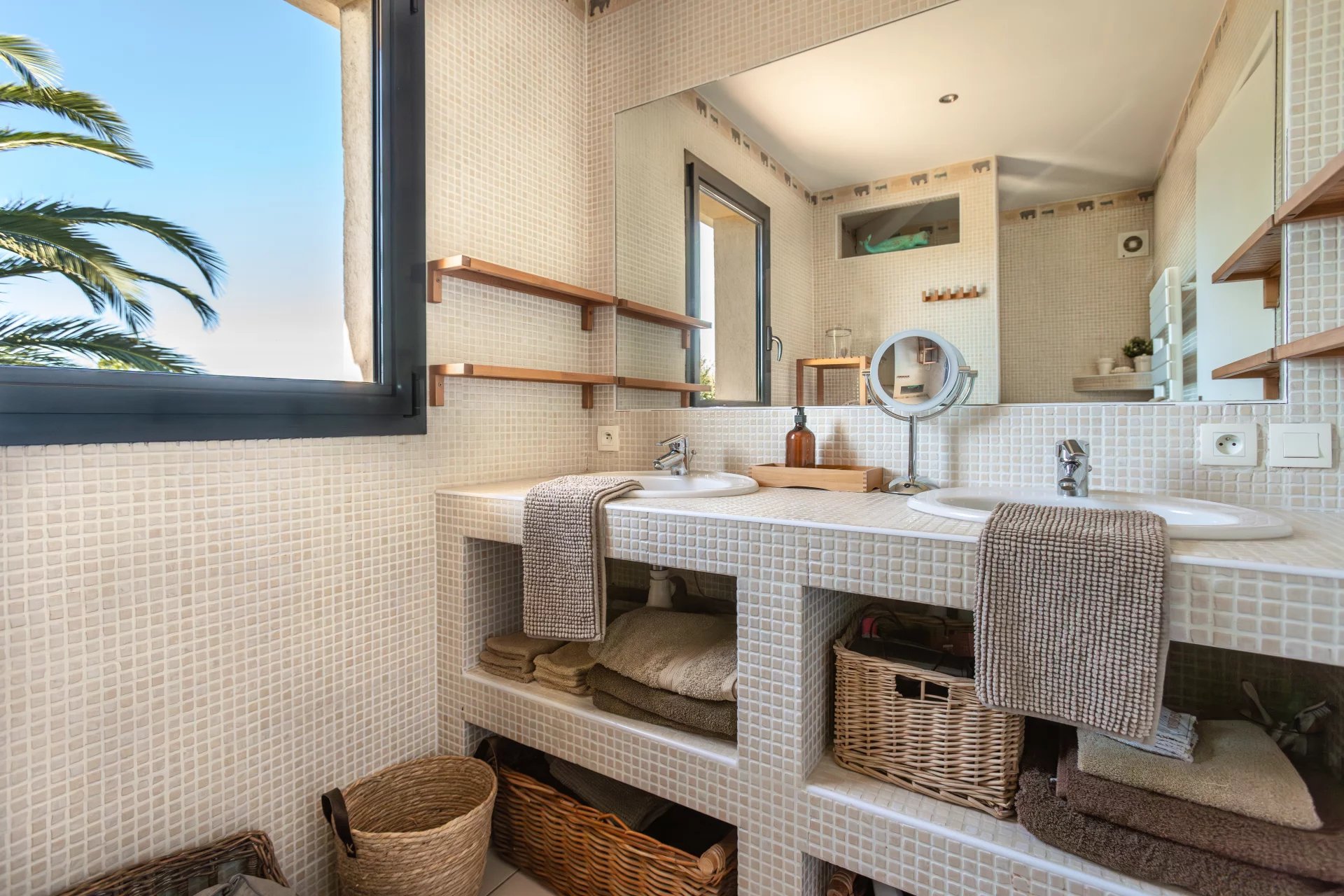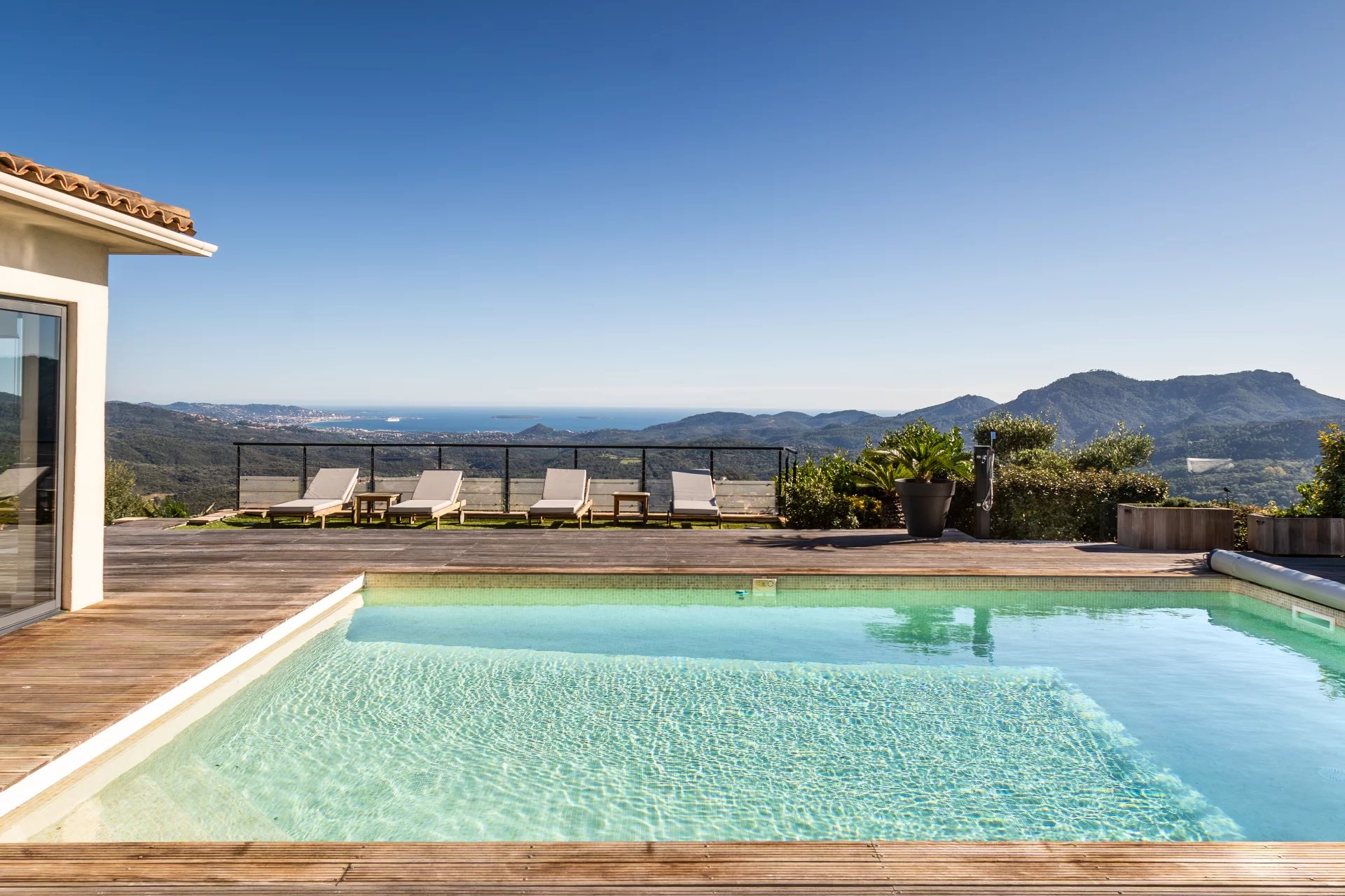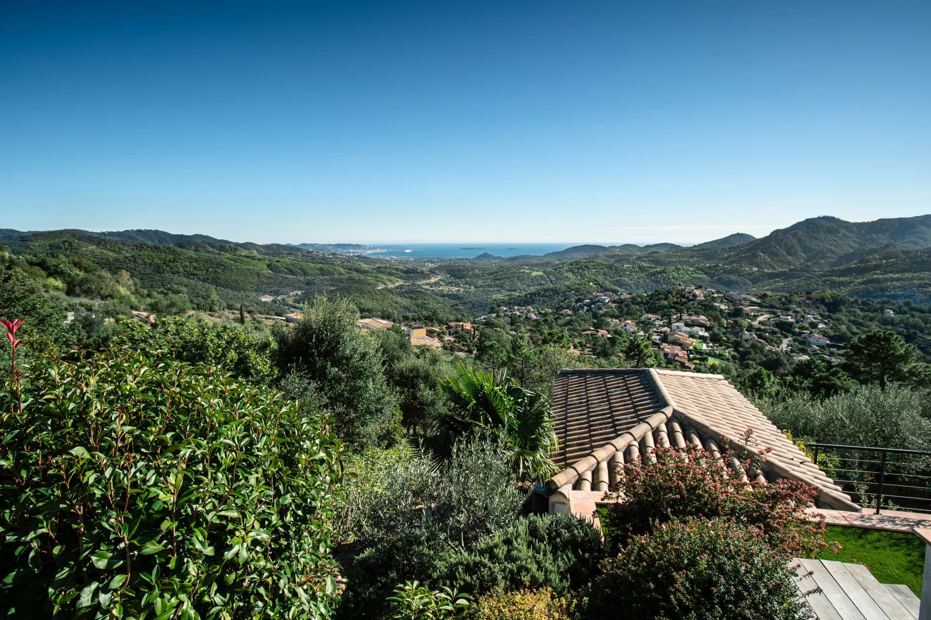 In the heart of a protected massif, in a residential estate with tennis courts, this luxurious architect-designed villa of 383m2 offers you a breathtaking view of the bay of Cannes and the Lérins islands.