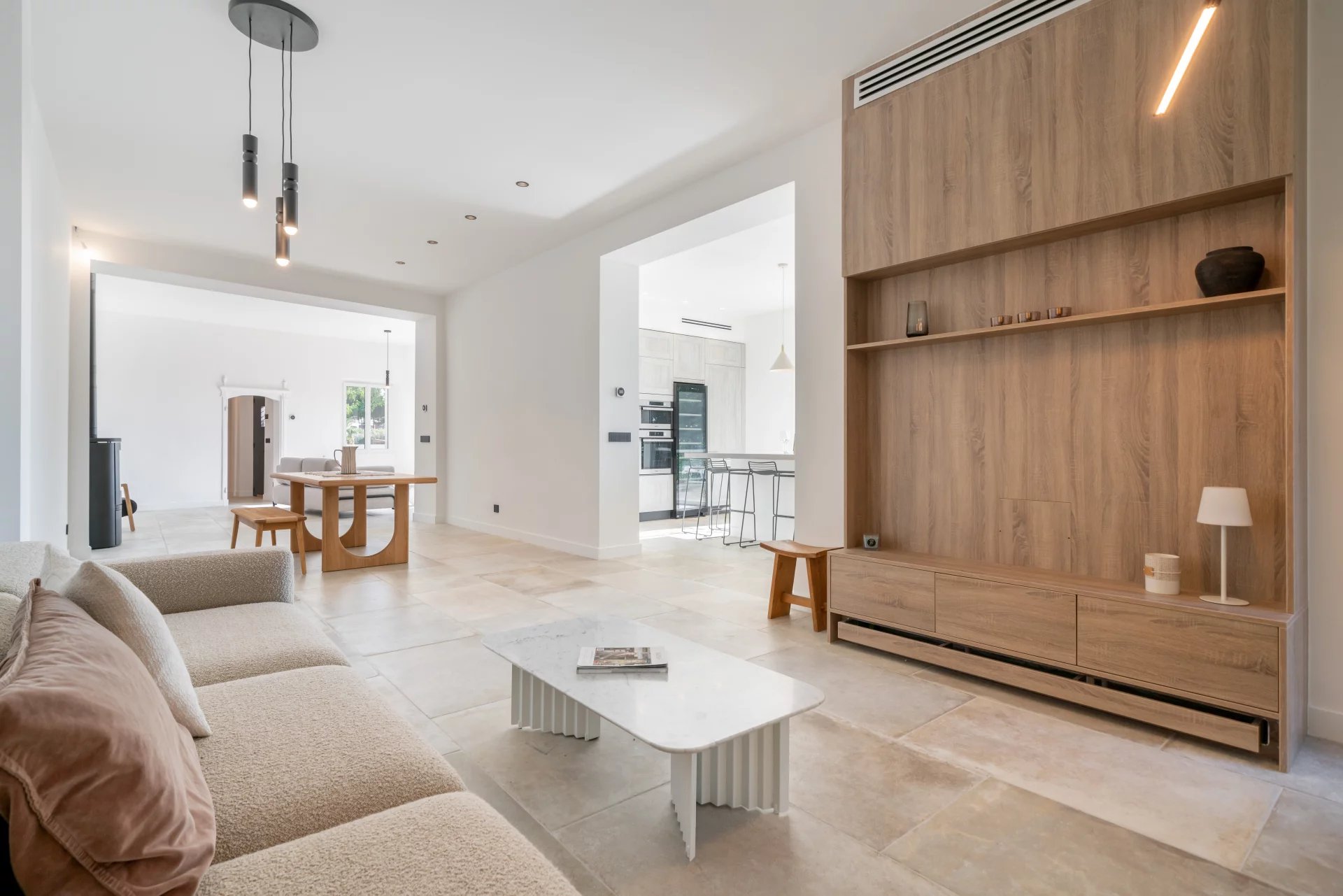 Garden level: An entrance opening onto the living and dining area, a fully equipped kitchen with pantry, an office, and an en-suite bedroom with shower room.