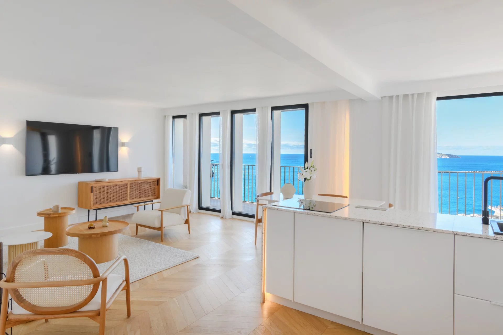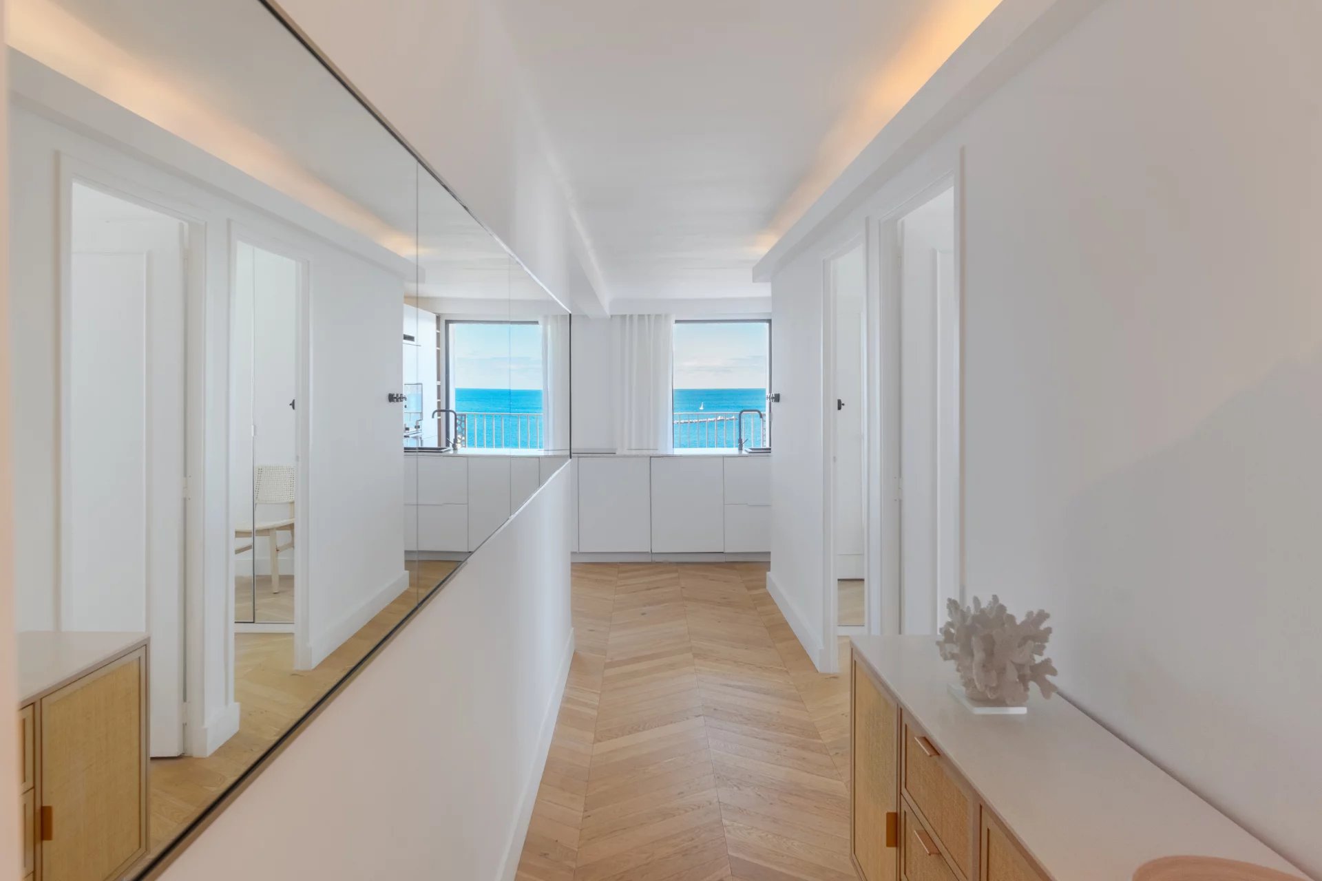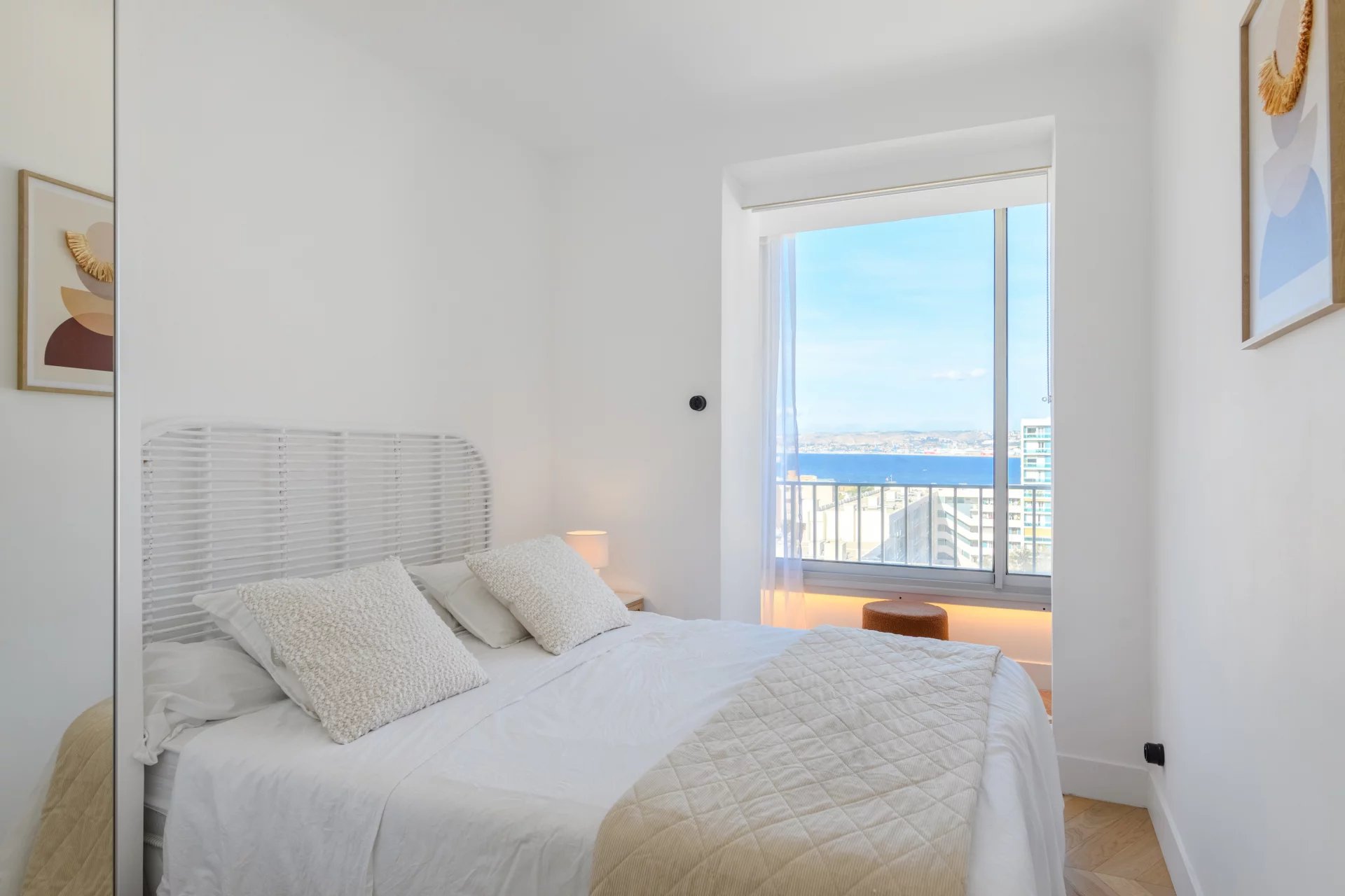 Located on a high floor, it offers breathtaking panoramic sea views, a living picture where only the blue of the sky and the Mediterranean Sea can be seen. In the heart of the 7th arrondissement, this apartment charms with its elegant renovation and high-quality amenities. The light-filled living room flows naturally into a custom-built open-plan kitchen, creating a harmonious living space facing the sea. Two bedrooms complete the apartment, as well as a bathroom with refined finishes. Numerous custom-built storage spaces make this property very functional.