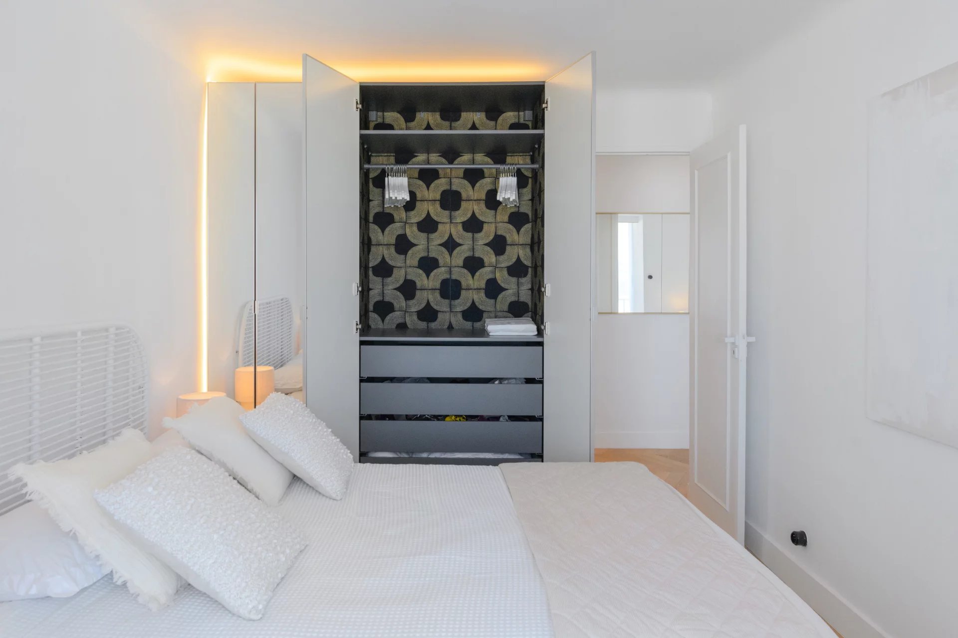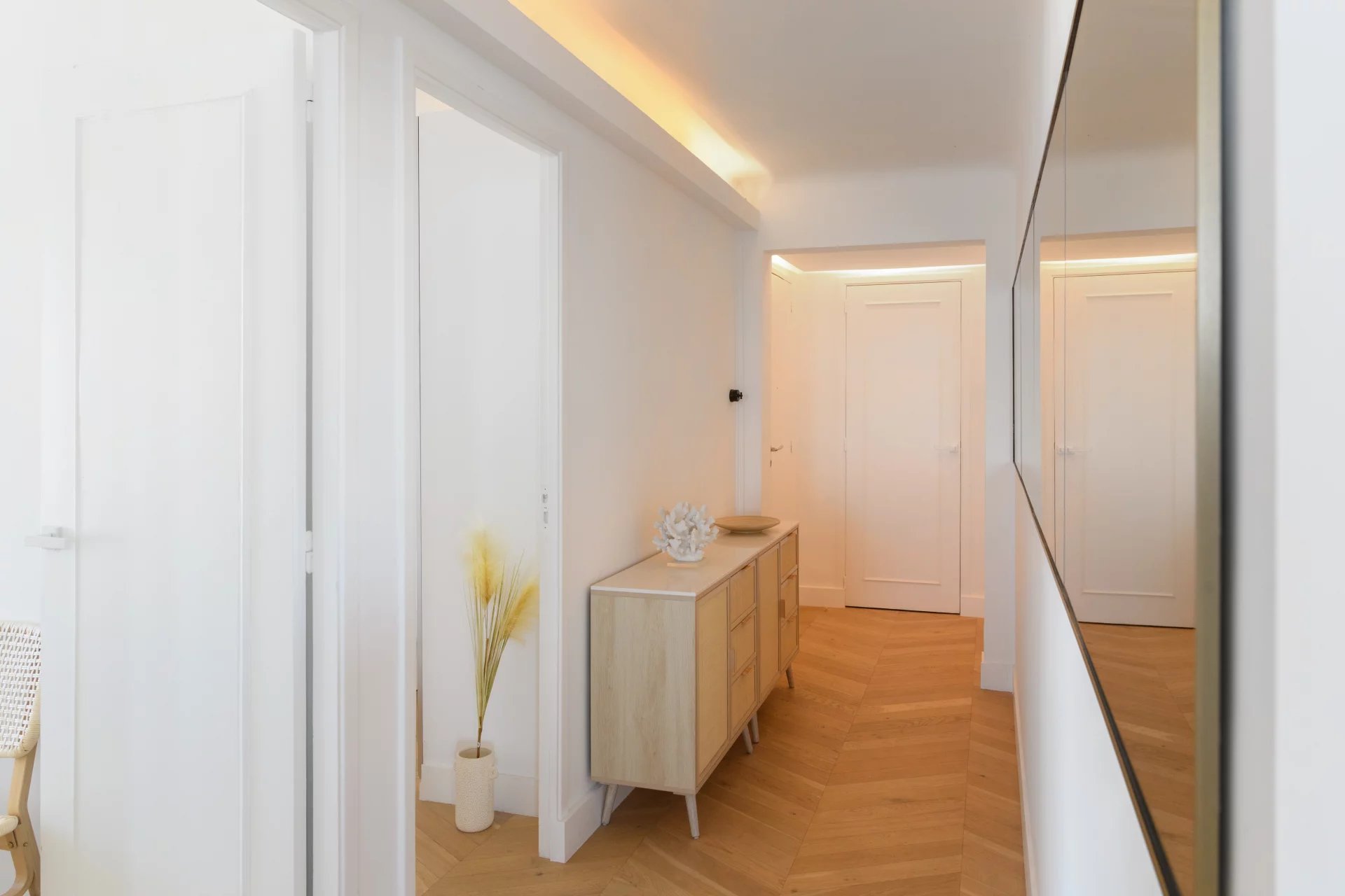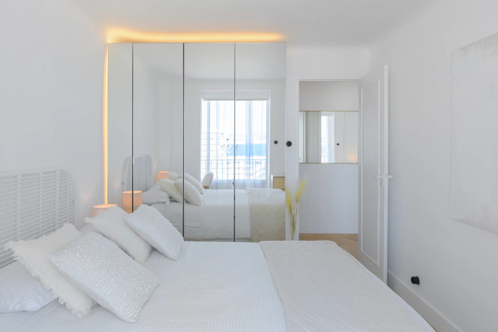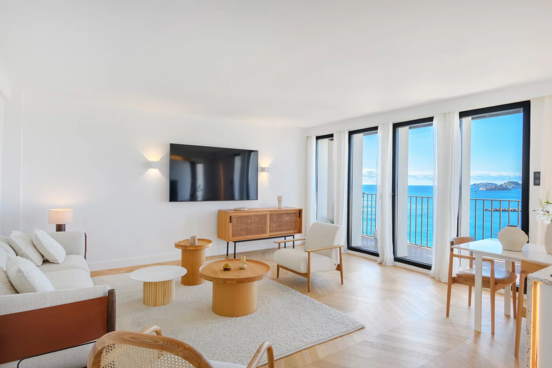 Located on a high floor, it offers breathtaking panoramic sea views, a living picture where only the blue of the sky and the Mediterranean Sea can be seen. In the heart of the 7th arrondissement, this apartment charms with its elegant renovation and high-quality amenities. The light-filled living room flows naturally into a custom-built open-plan kitchen, creating a harmonious living space facing the sea. Two bedrooms complete the apartment, as well as a bathroom with refined finishes. Numerous custom-built storage spaces make this property very functional.