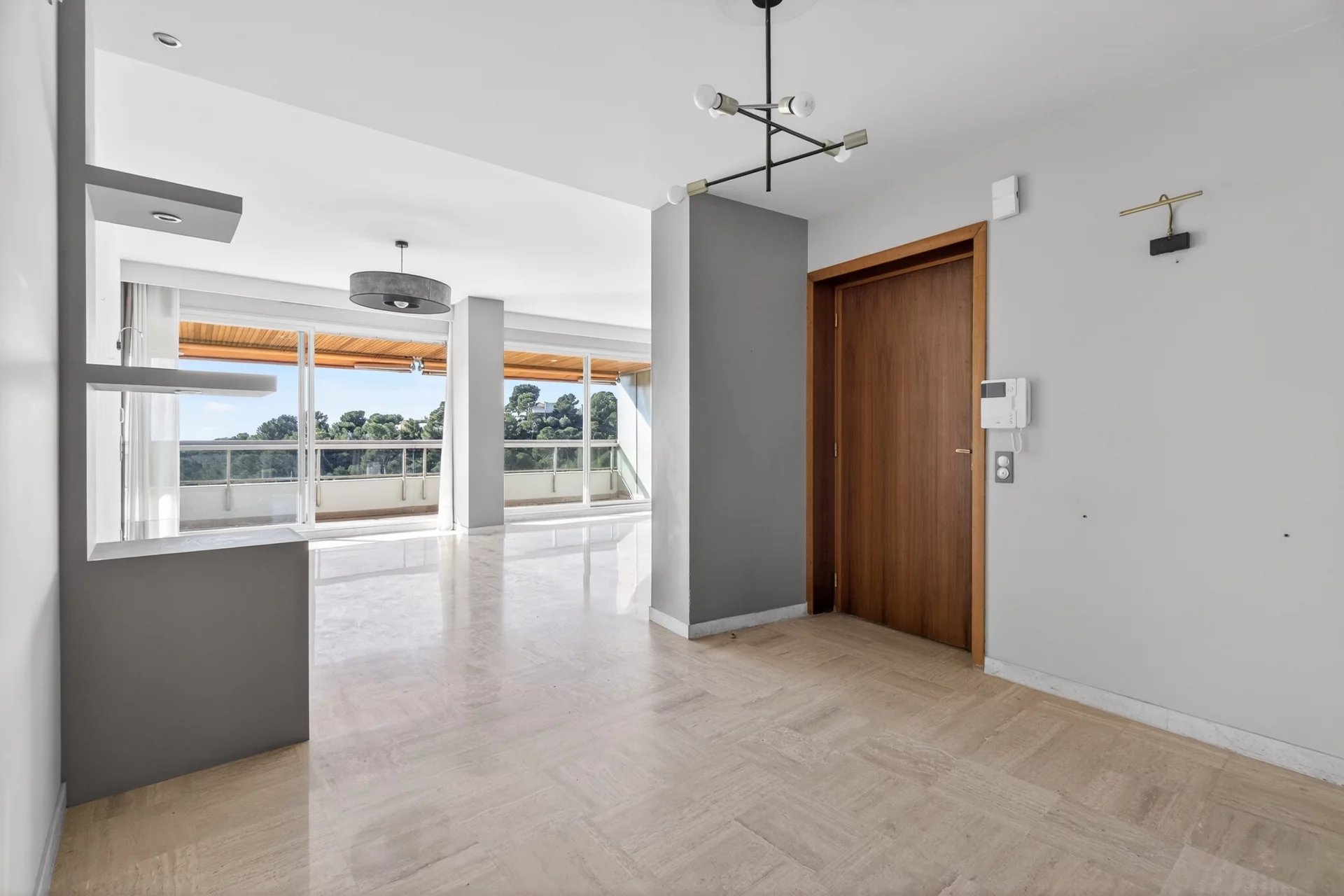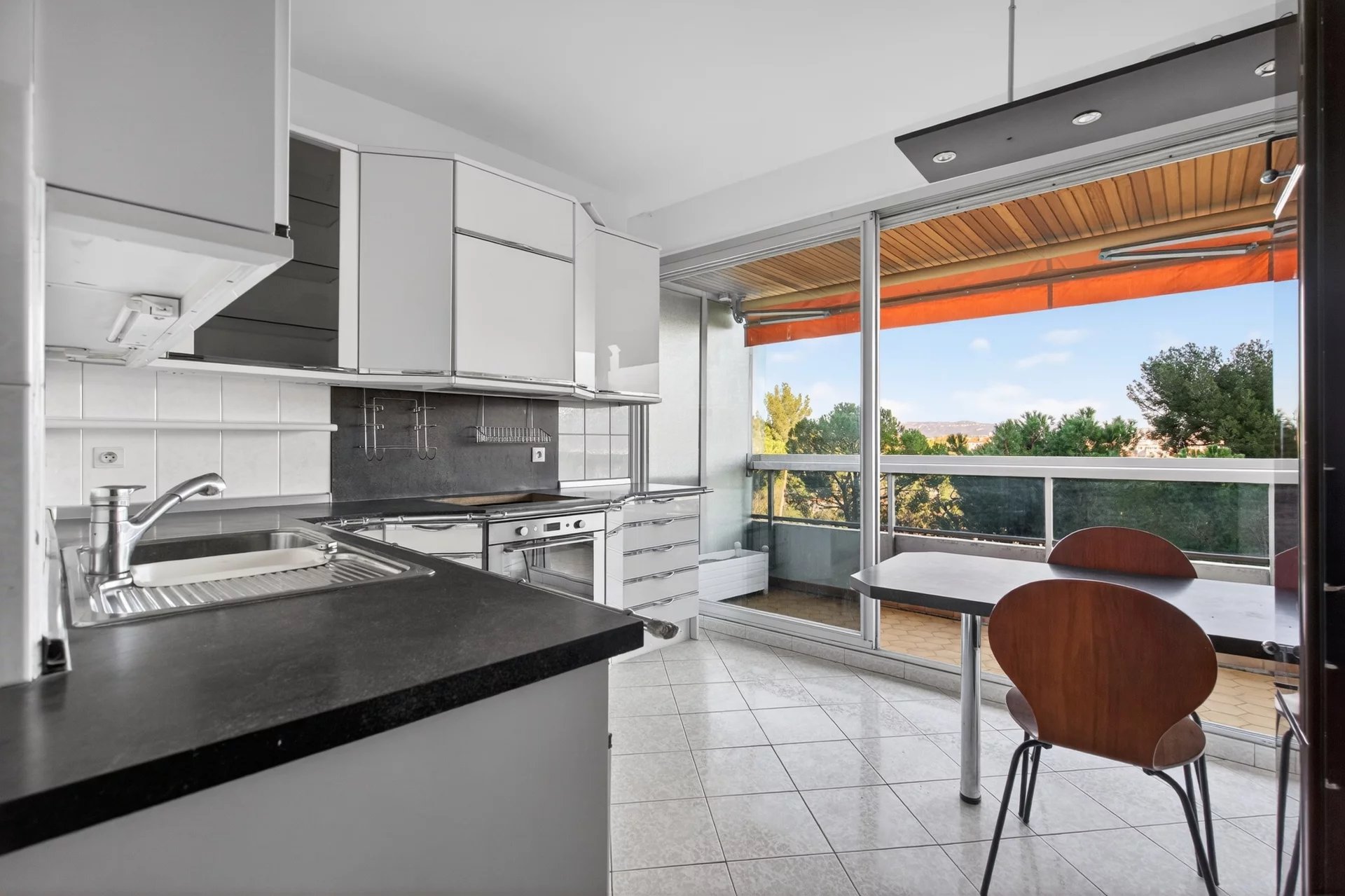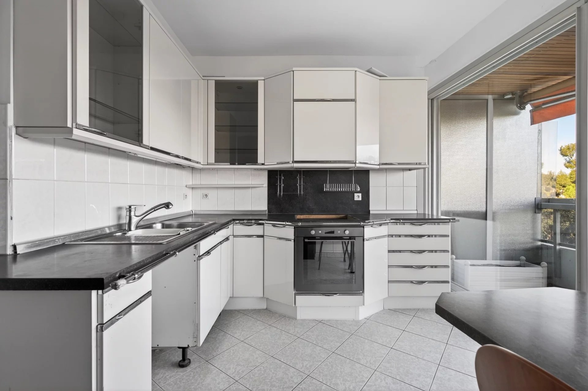 Dual-aspect and south-facing, the apartment benefits from outstanding sunlight throughout the day. The fully equipped independent kitchen opens onto a second terrace and also offers strong potential for reconfiguration, including the possibility of creating a third bedroom and opening the kitchen onto the living area for a more contemporary reception space.