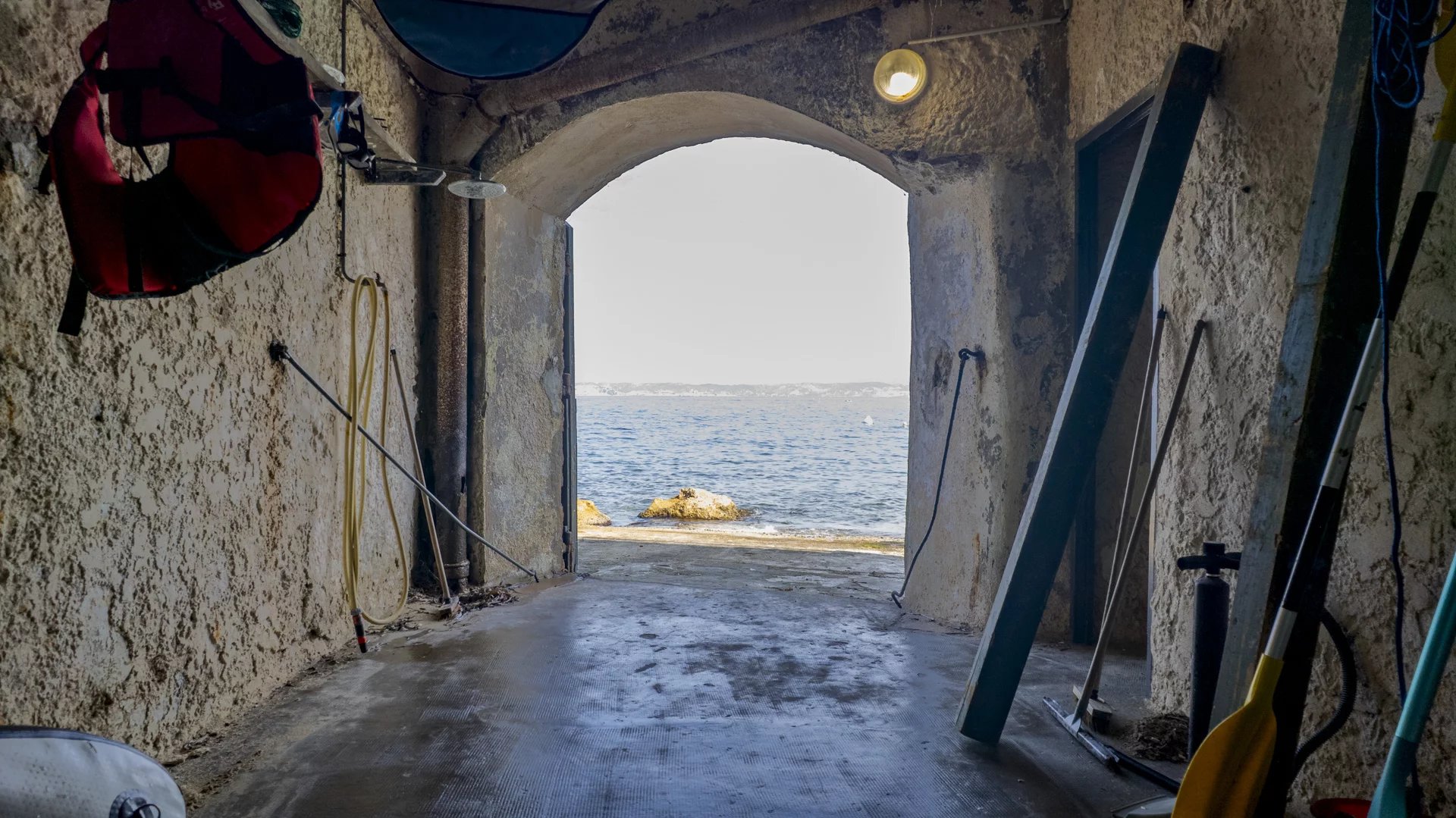 A discreet stone staircase carved into the rock leads to your private sea access. A boat garage with private slipway is also included.