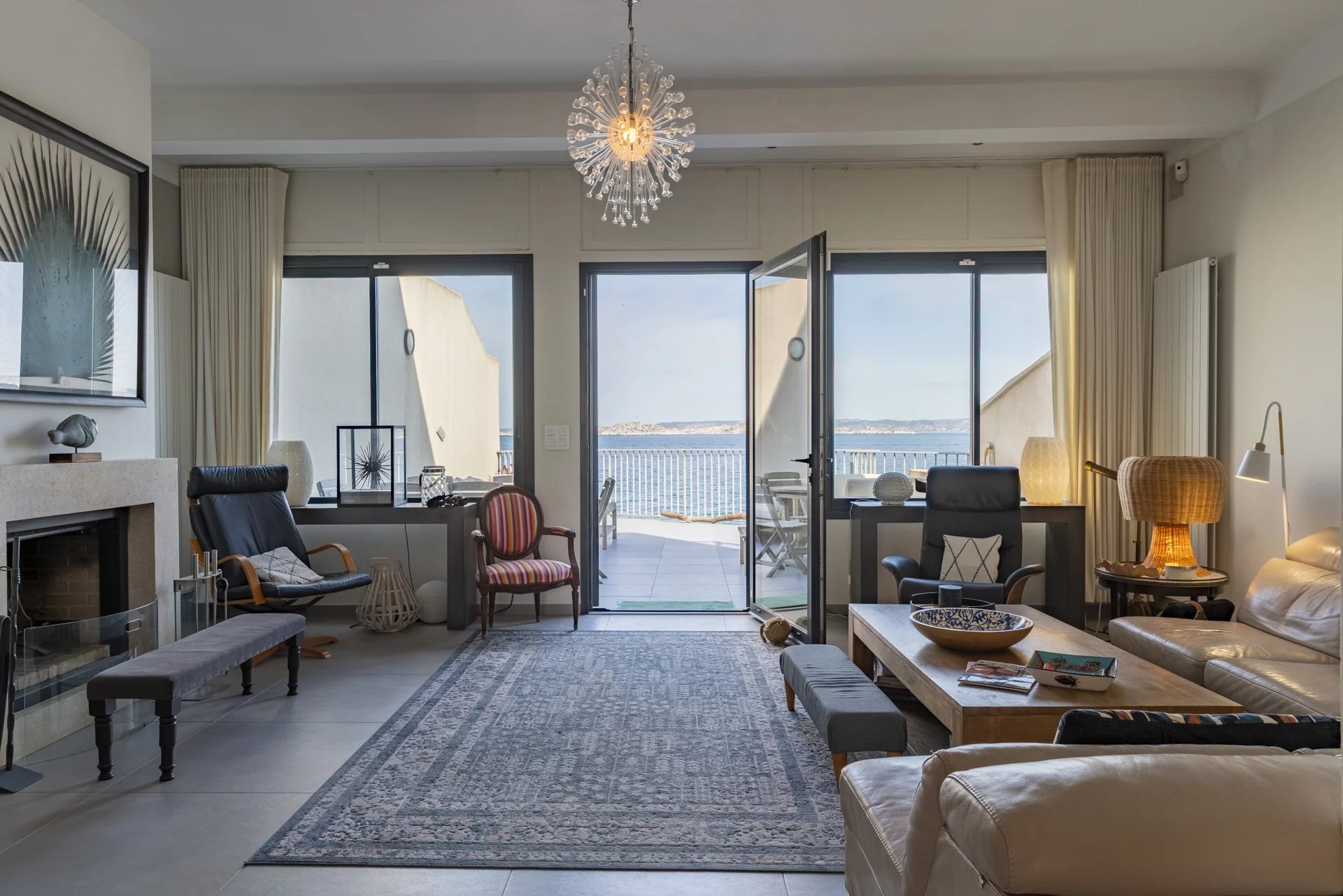 The ground floor opens onto a bright and spacious living room, extended by a terrace suspended above the sea, offering breathtaking views over the Mediterranean. The separate kitchen combines functionality and conviviality. In the lower level, a large laundry room and a wine cellar complete the technical amenities.
