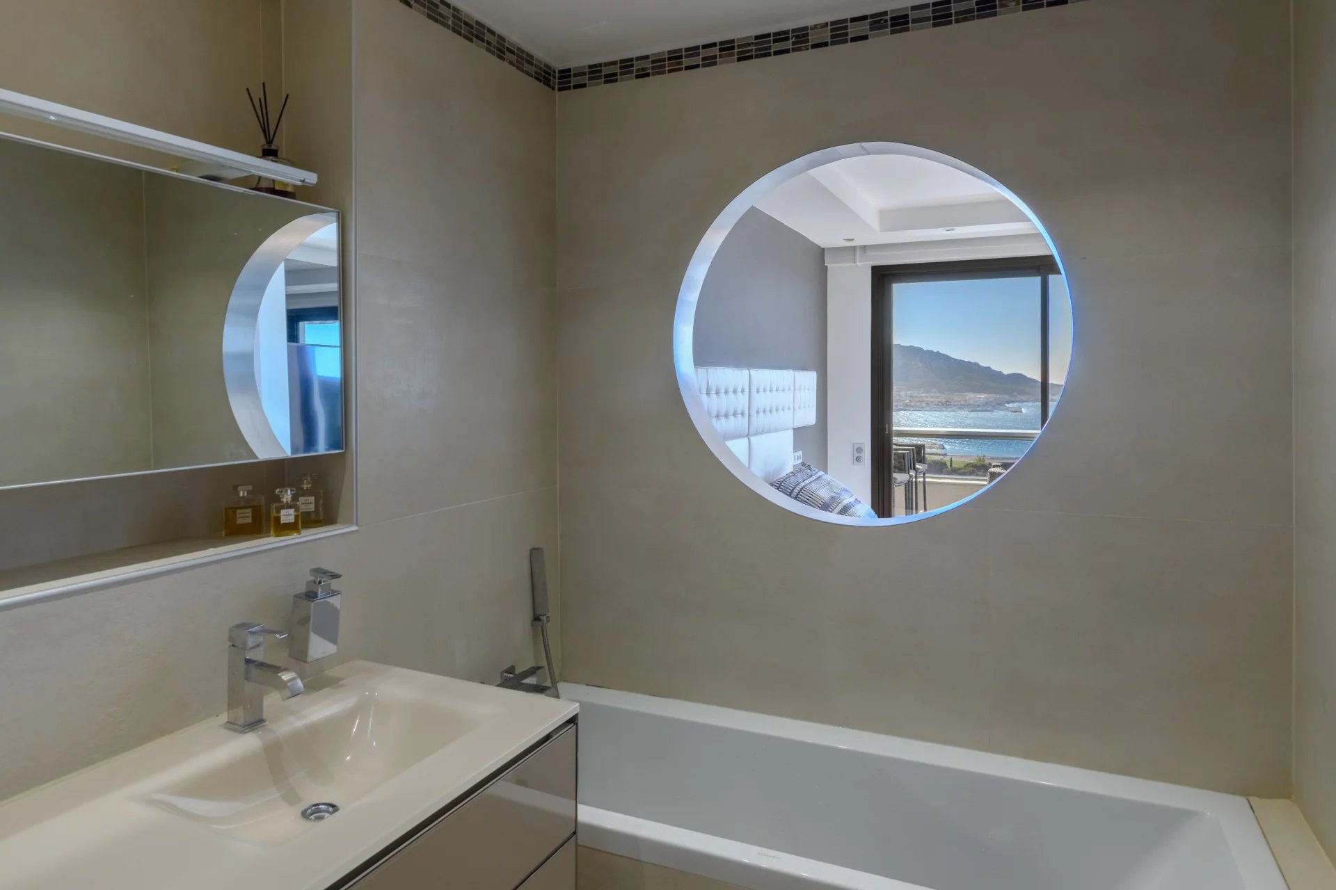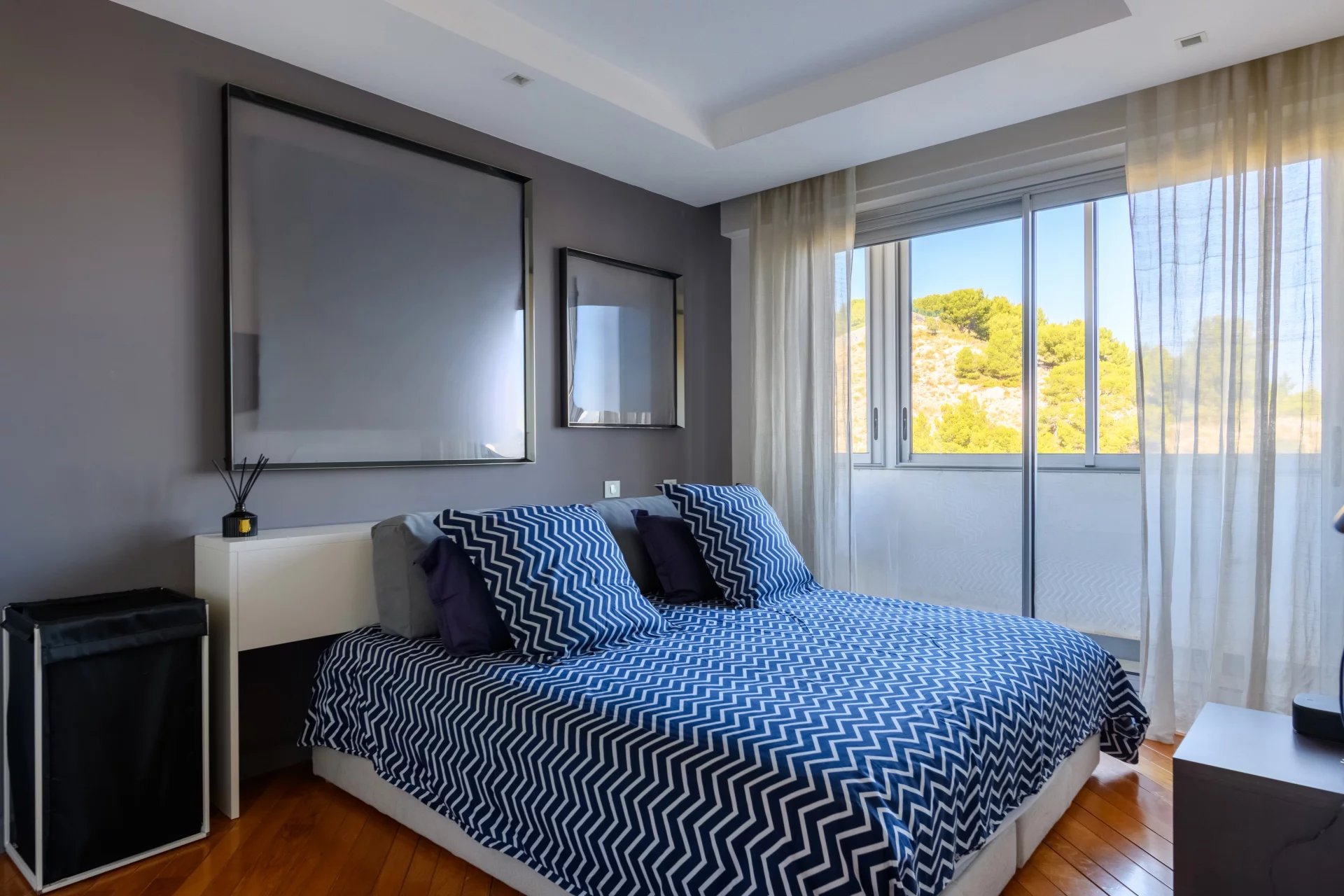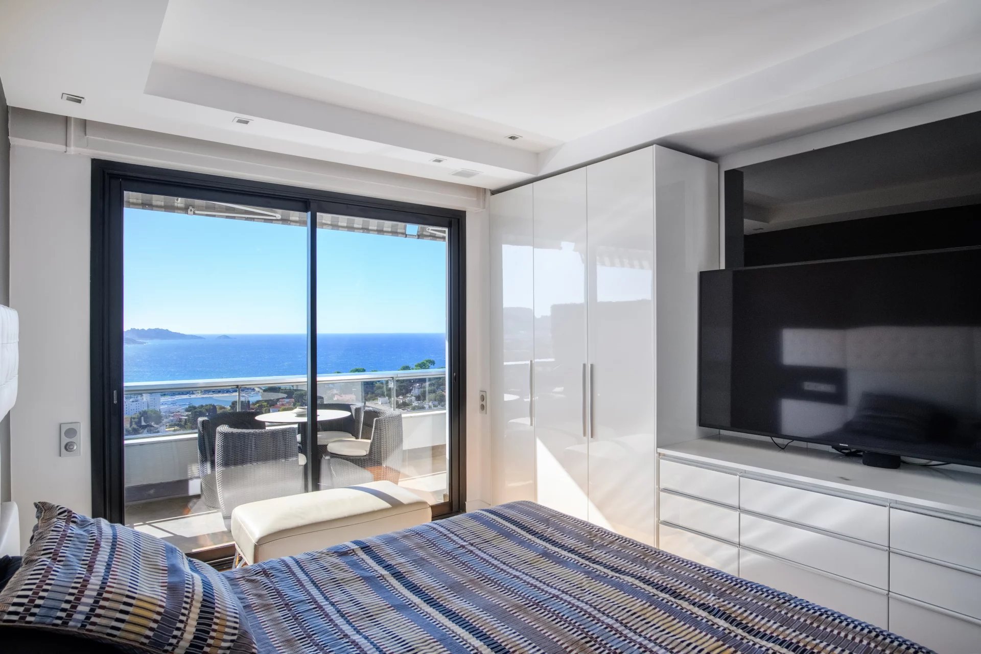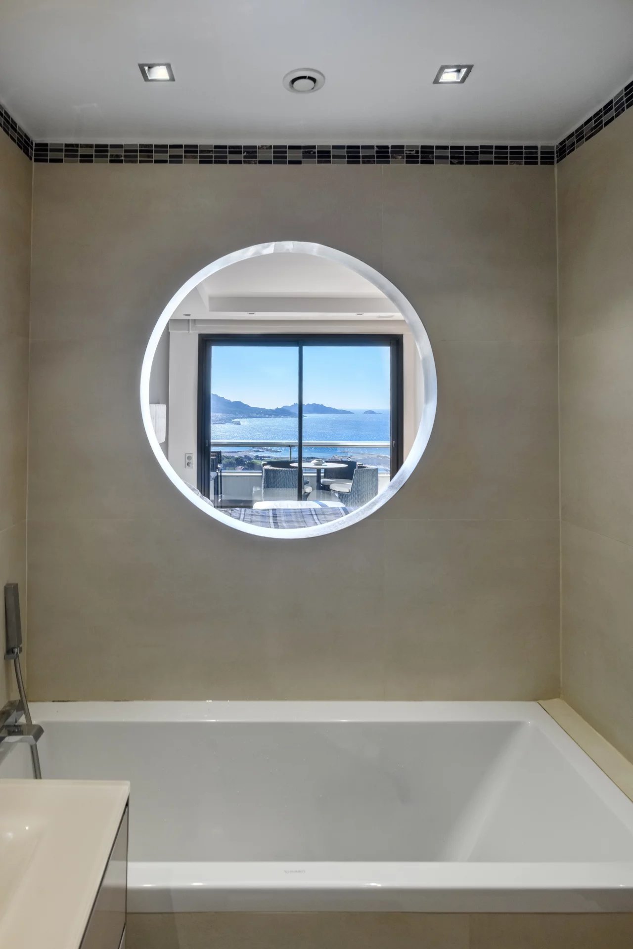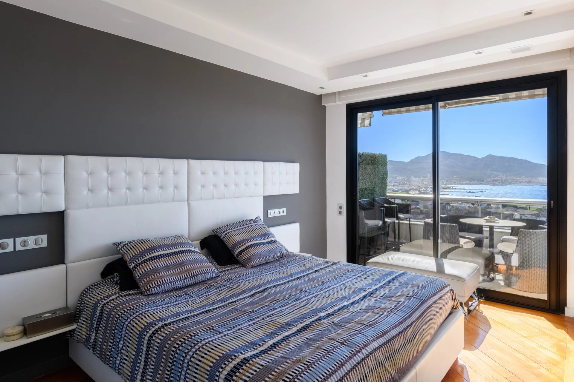 The master suite, a corner apartment of nearly 30 m2, features striking sea views, a custom dressing room, and a luxurious bathroom with bathtub, walk-in shower, and separate WC.