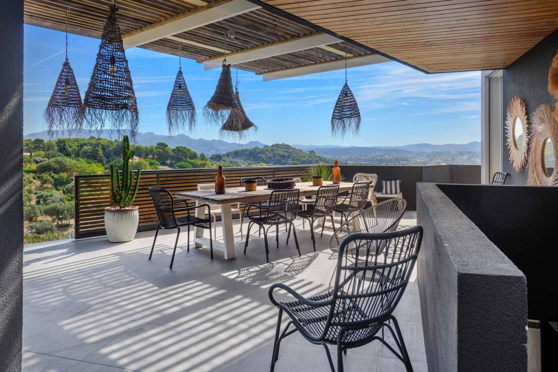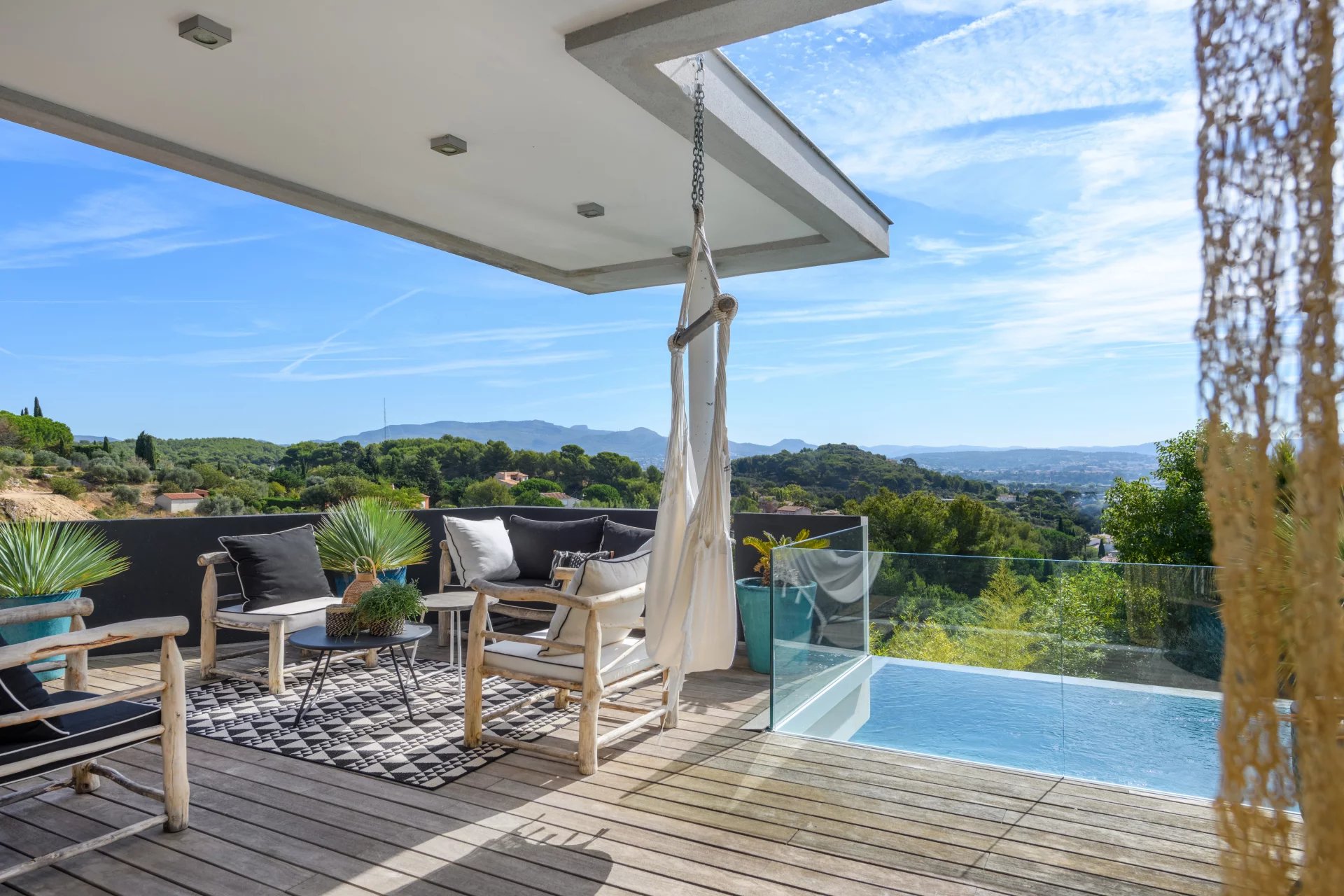Nestled in a peaceful residential enclave at the foot of the majestic Massif de l’Étoile, this contemporary architect-designed home offers an exceptional living environment just 20 minutes from Marseille’s vibrant city center.