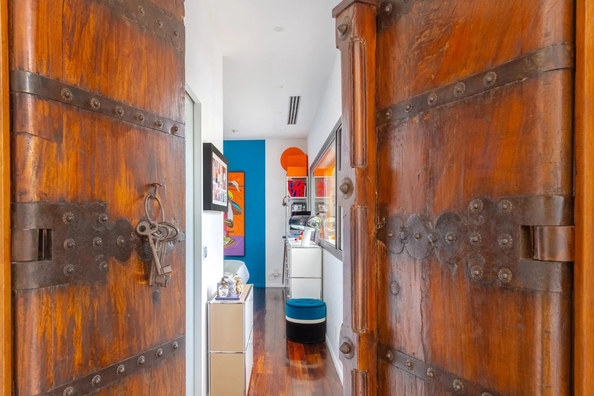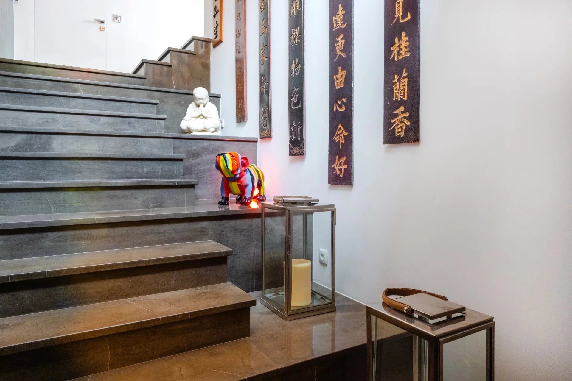 The reception level features a bright 65 m2 living room with a fireplace, complemented by an open-plan kitchen and a separate utility room. Large glass doors provide panoramic views of the surrounding hills and the city. Exquisite 16th-century Indian temple doors open onto a spacious master suite with a luxurious bathroom, including a spa bath, Italian-style shower, and walk-in dressing room.