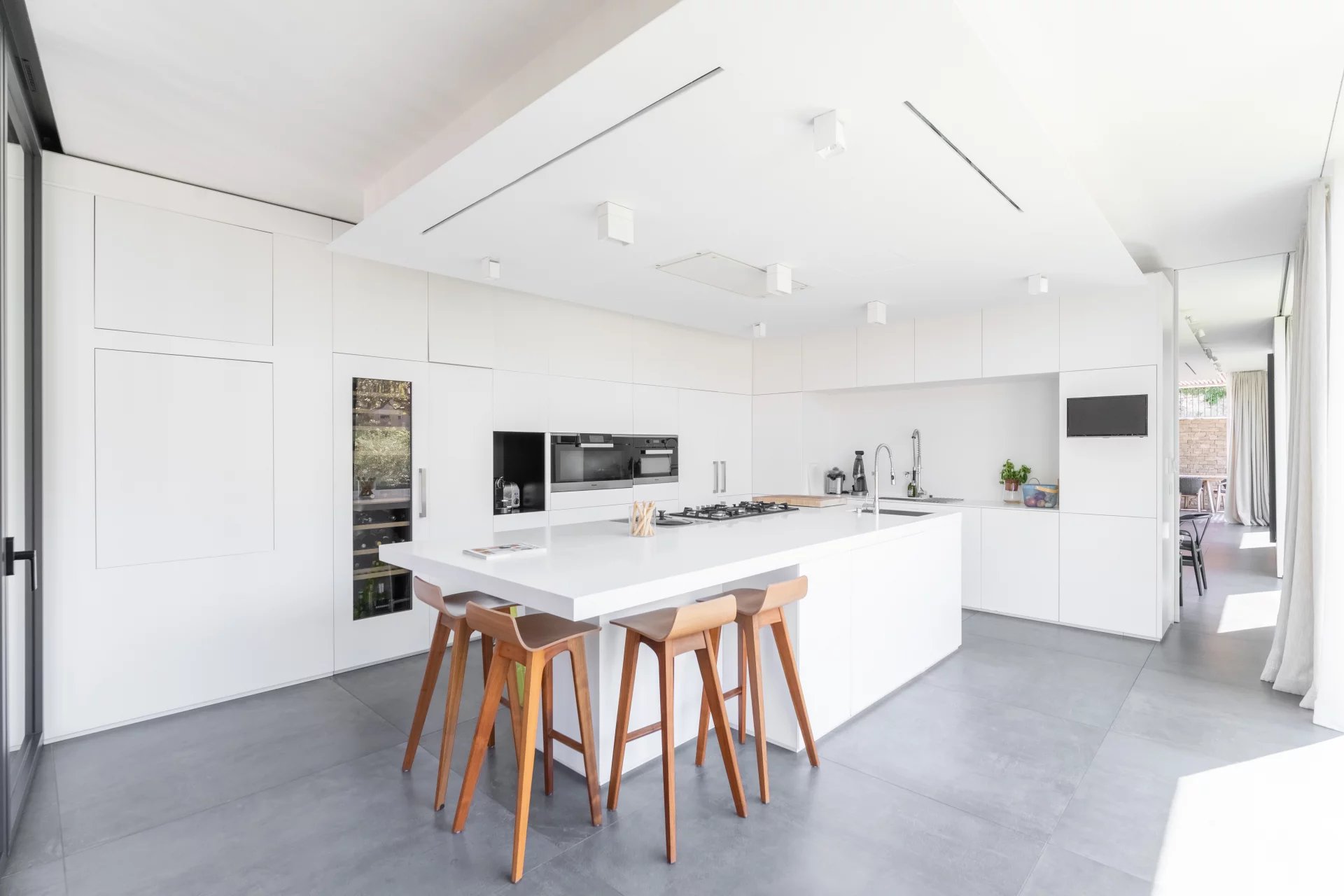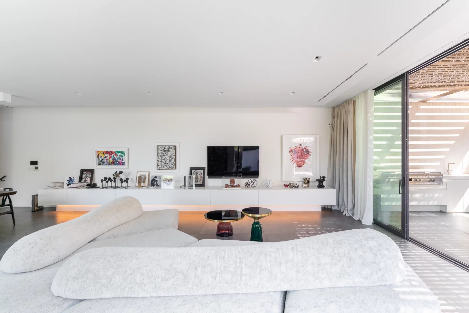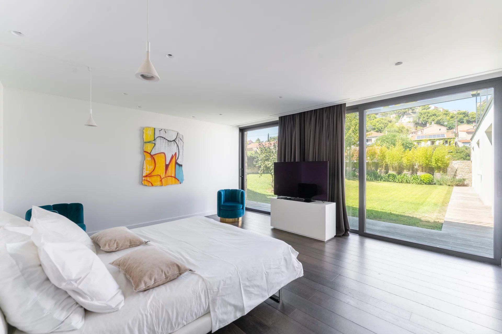 The lower level is devoted to the night quarters: three luminous bedrooms, each with its own en-suite bathroom, custom-made office space and dressing room, plus a sumptuous master suite with private study, bespoke dressing, elegant bathroom (Italian shower, bathtub, double vanity) and separate WC. Each bedroom opens onto the outdoors through large sliding glass doors, inviting in light and nature.