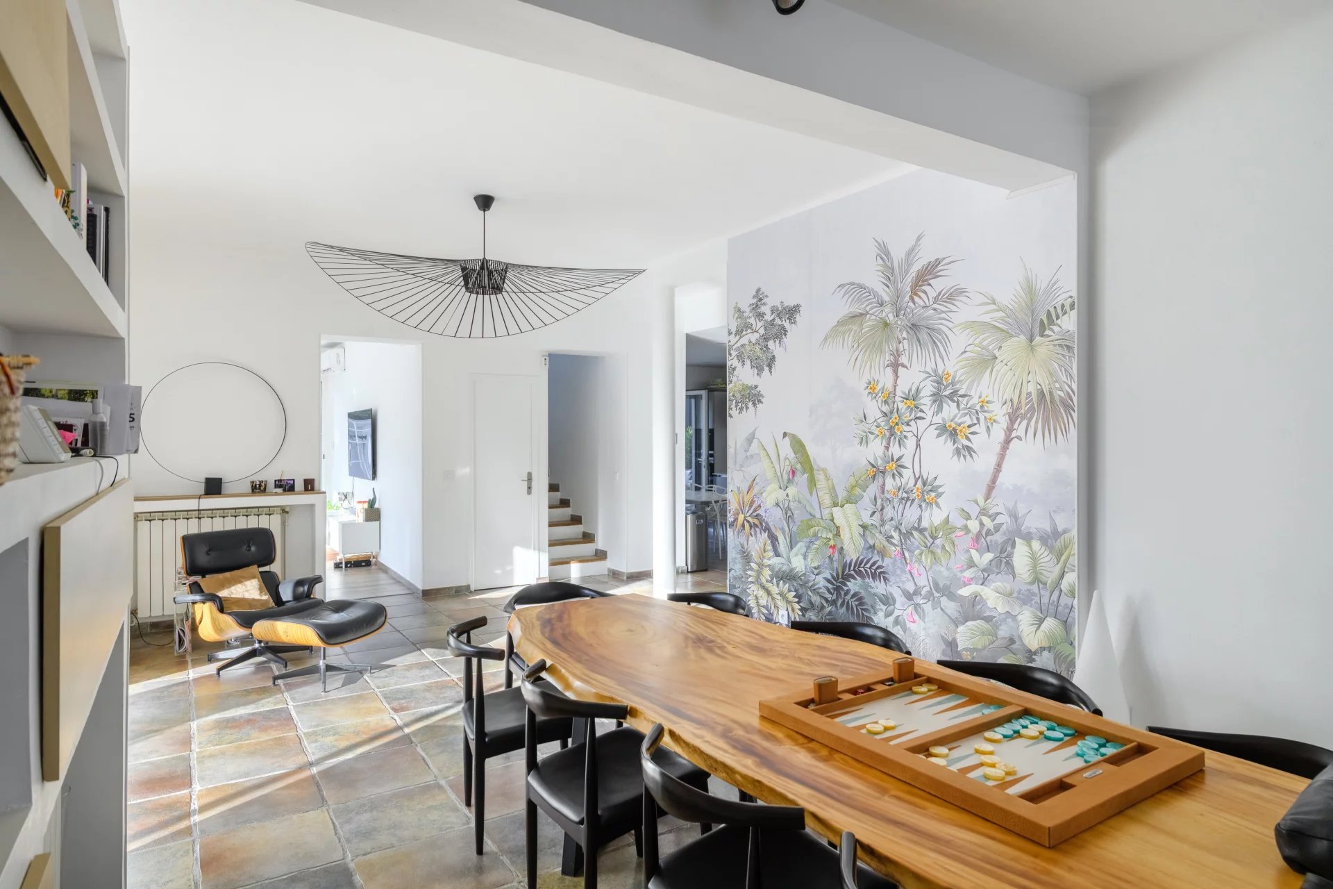 The ground floor features a spacious entrance hall leading to beautiful reception areas, including a well-proportioned dining room and a remarkable living room, both opening extensively onto the outdoors and filled with natural light. The family-sized kitchen, designed as a true convivial living space, seamlessly extends these areas and opens onto the terrace. A ground-floor master suite with shower room completes this level, along with separate guest toilets and ample built-in storage for optimal comfort.