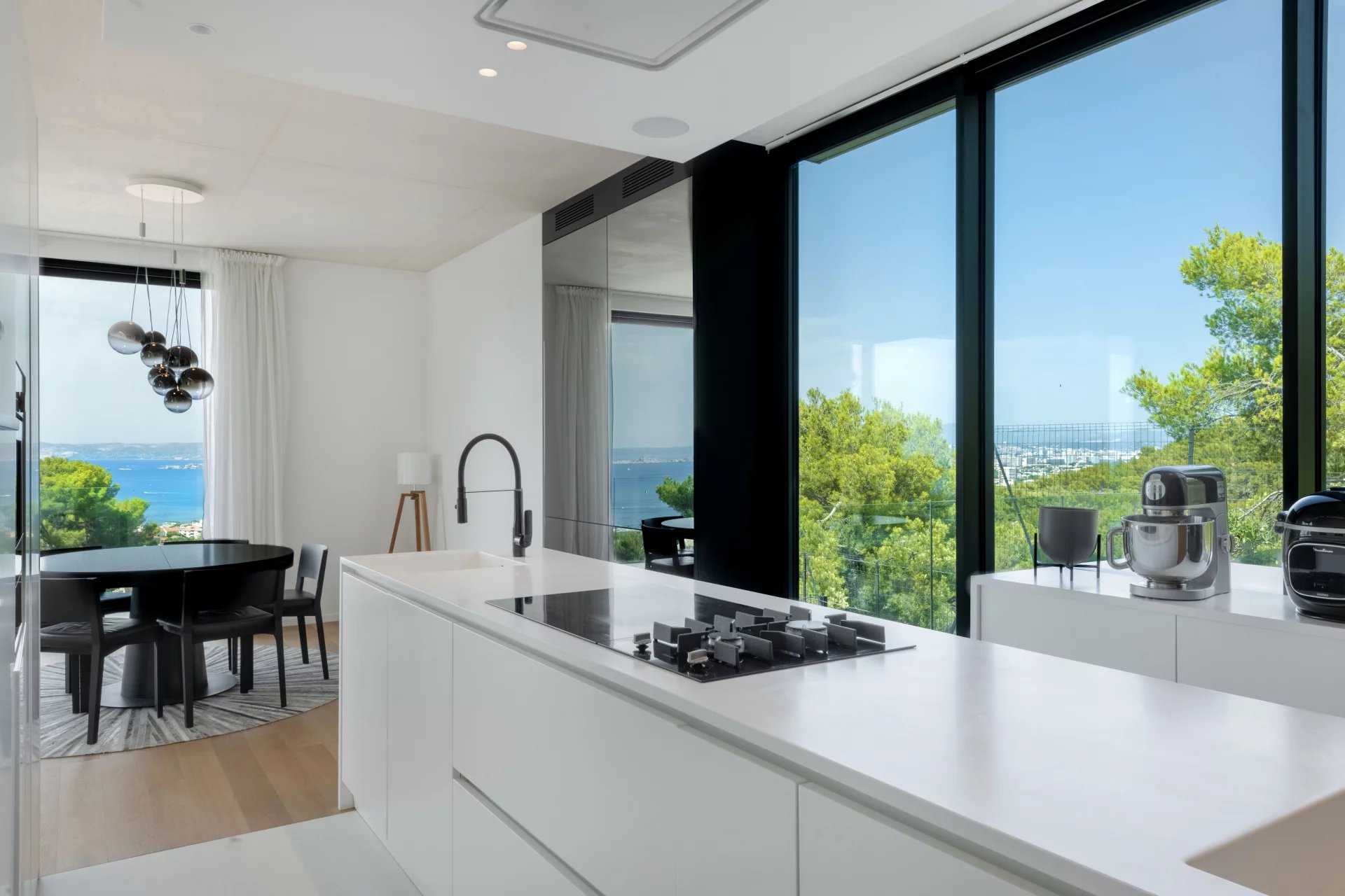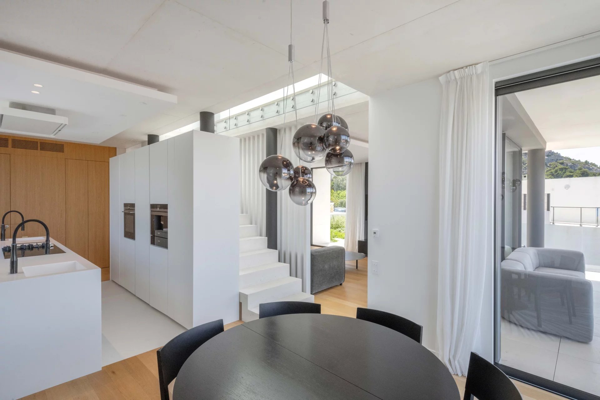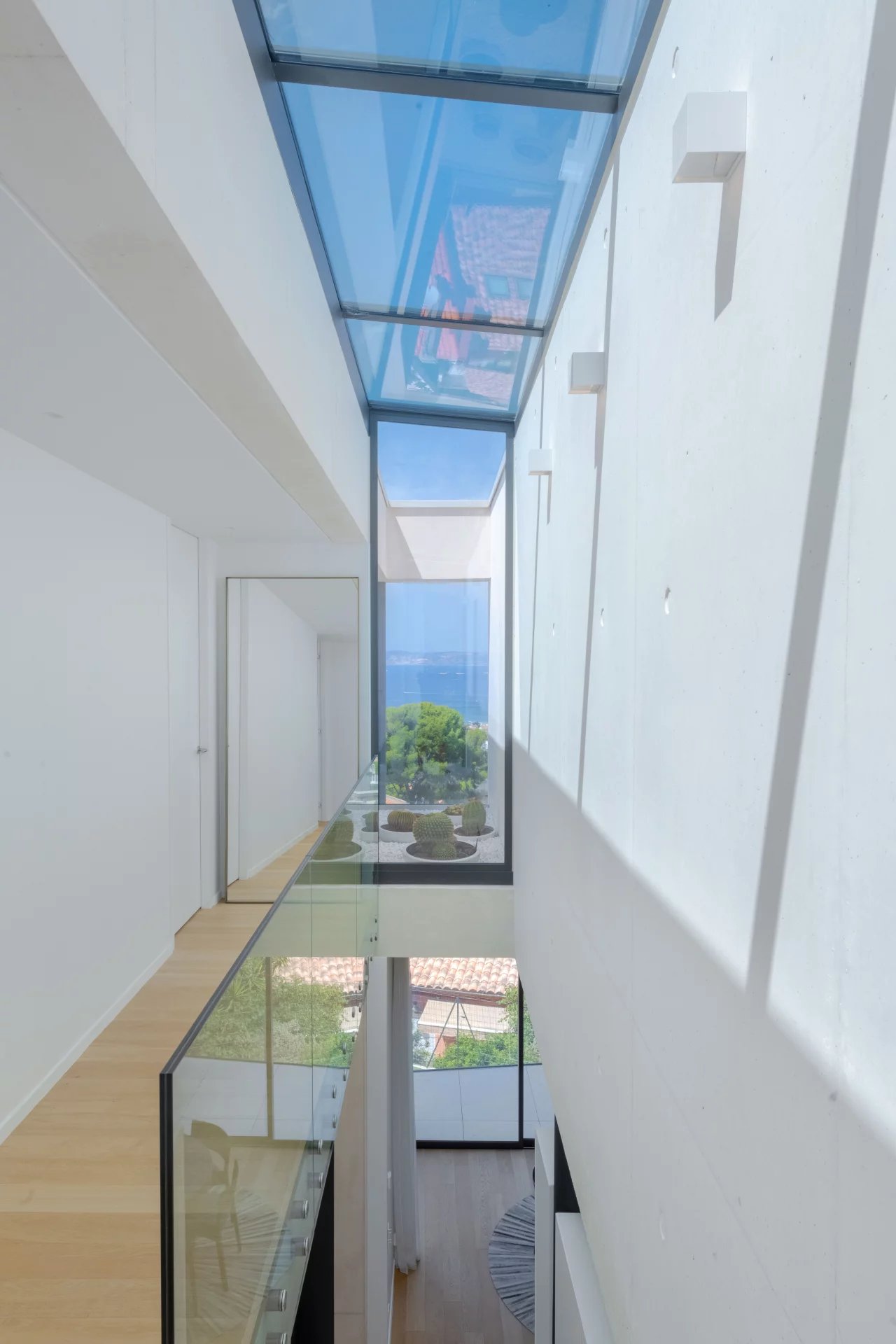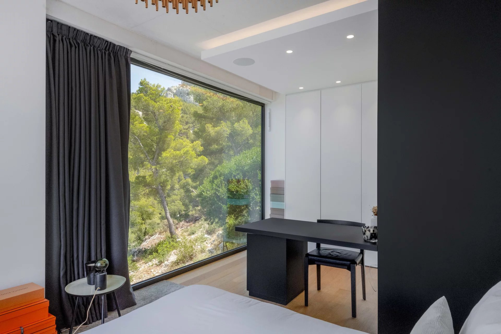 From the main level, you’ll be seduced by the breathtaking panoramic sea views. You’ll discover a beautiful living room with fireplace, a dining room and a fully-equipped, custom-built open-plan kitchen, as well as a separate laundry area. All rooms overlook the sea and the finely crafted, integrated exterior. There are two separate levels for the sleeping area, the first giving access to three bedrooms with bespoke dressing rooms and a bathroom with shower.
