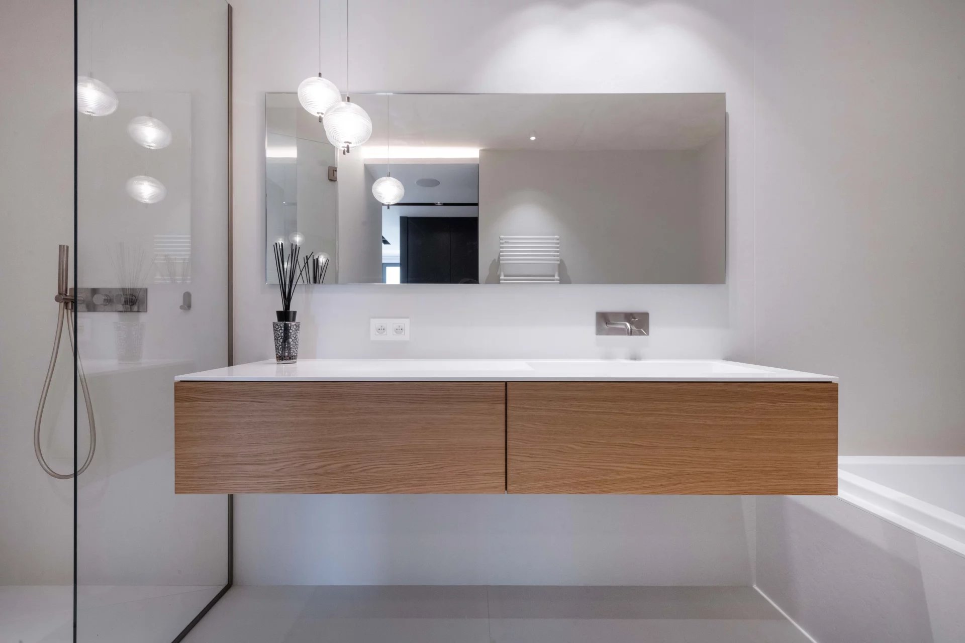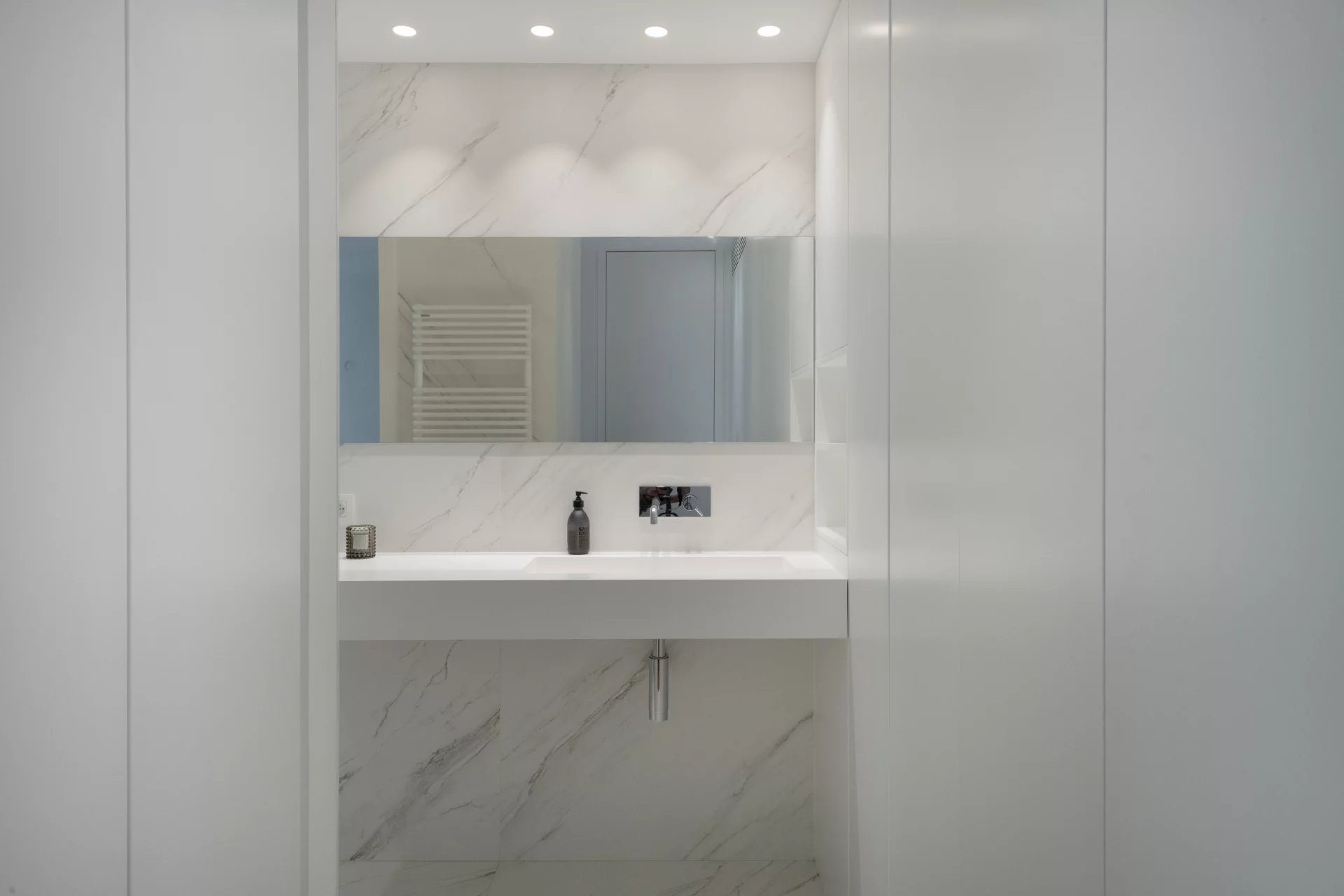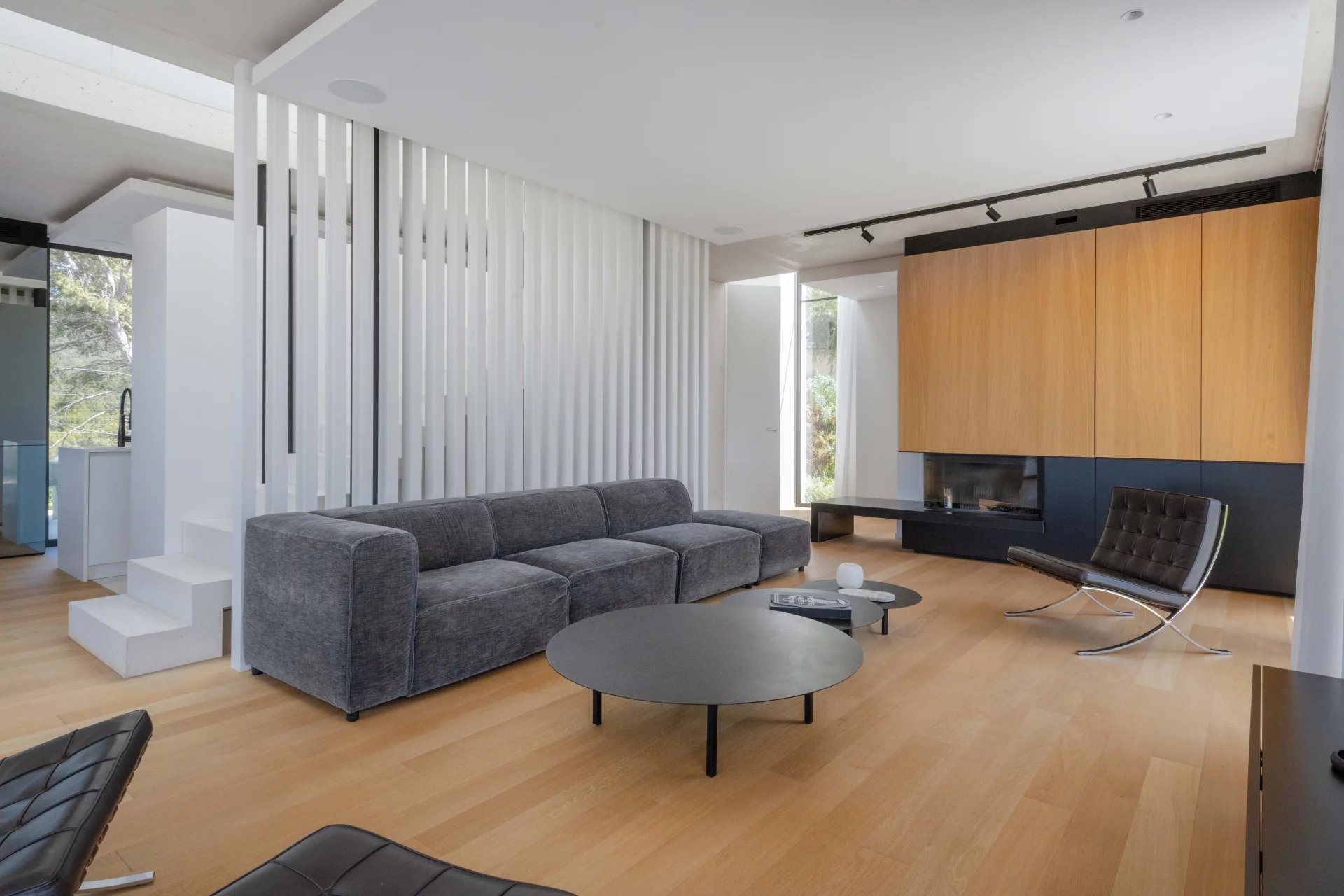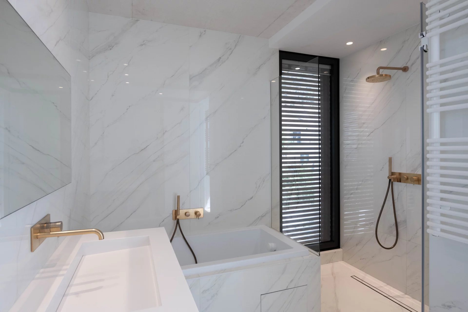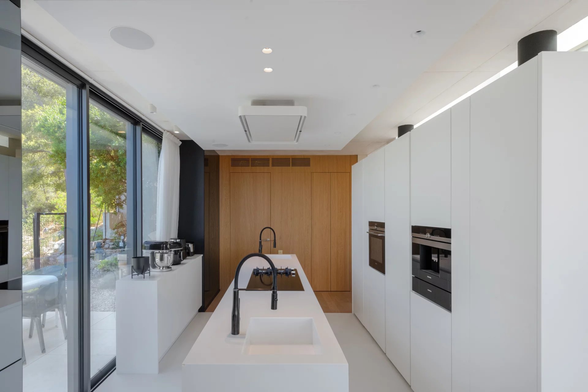 From the main level, you’ll be seduced by the breathtaking panoramic sea views. You’ll discover a beautiful living room with fireplace, a dining room and a fully-equipped, custom-built open-plan kitchen, as well as a separate laundry area. All rooms overlook the sea and the finely crafted, integrated exterior. There are two separate levels for the sleeping area, the first giving access to three bedrooms with bespoke dressing rooms and a bathroom with shower.