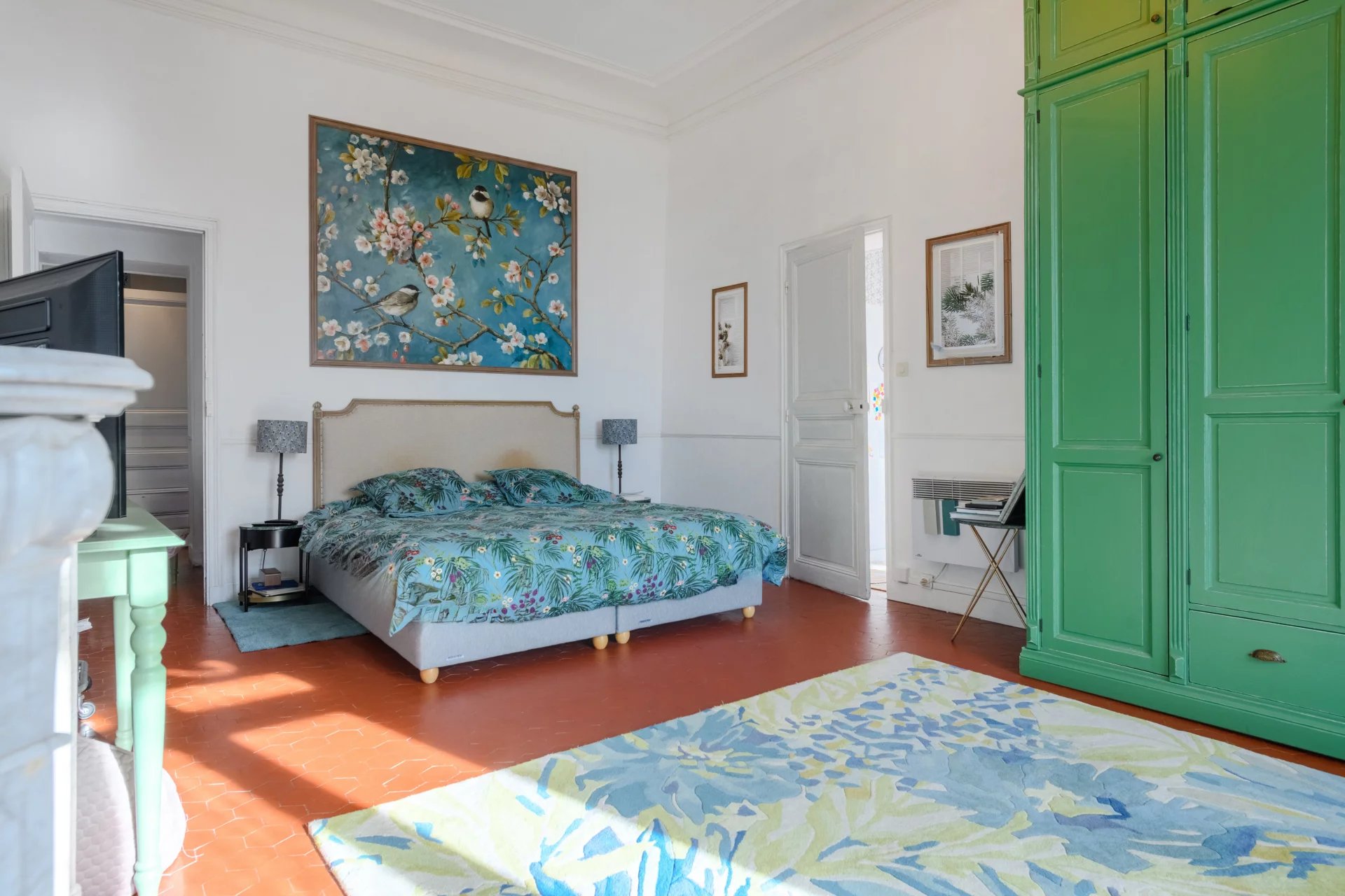 Upstairs, additional bedrooms of refined proportions are complemented by a warm library, a bathroom, and a second kitchen—offering flexible living arrangements or guest accommodation. Each bedroom benefits from exterior access with balcony and open, unoverlooked views.