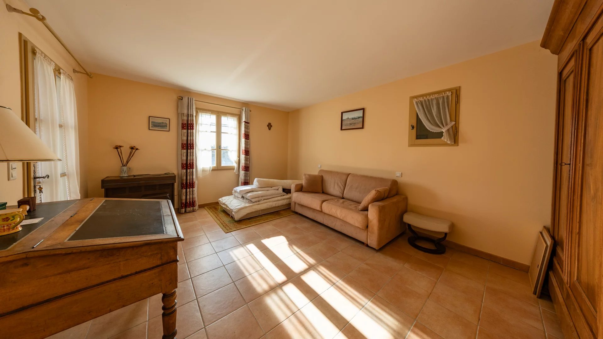 Offering approximately 130 m2 of living space comprising a kitchen, a living room with fireplace, two adjoining bedrooms and two bedrooms sharing a shower room on the first floor.