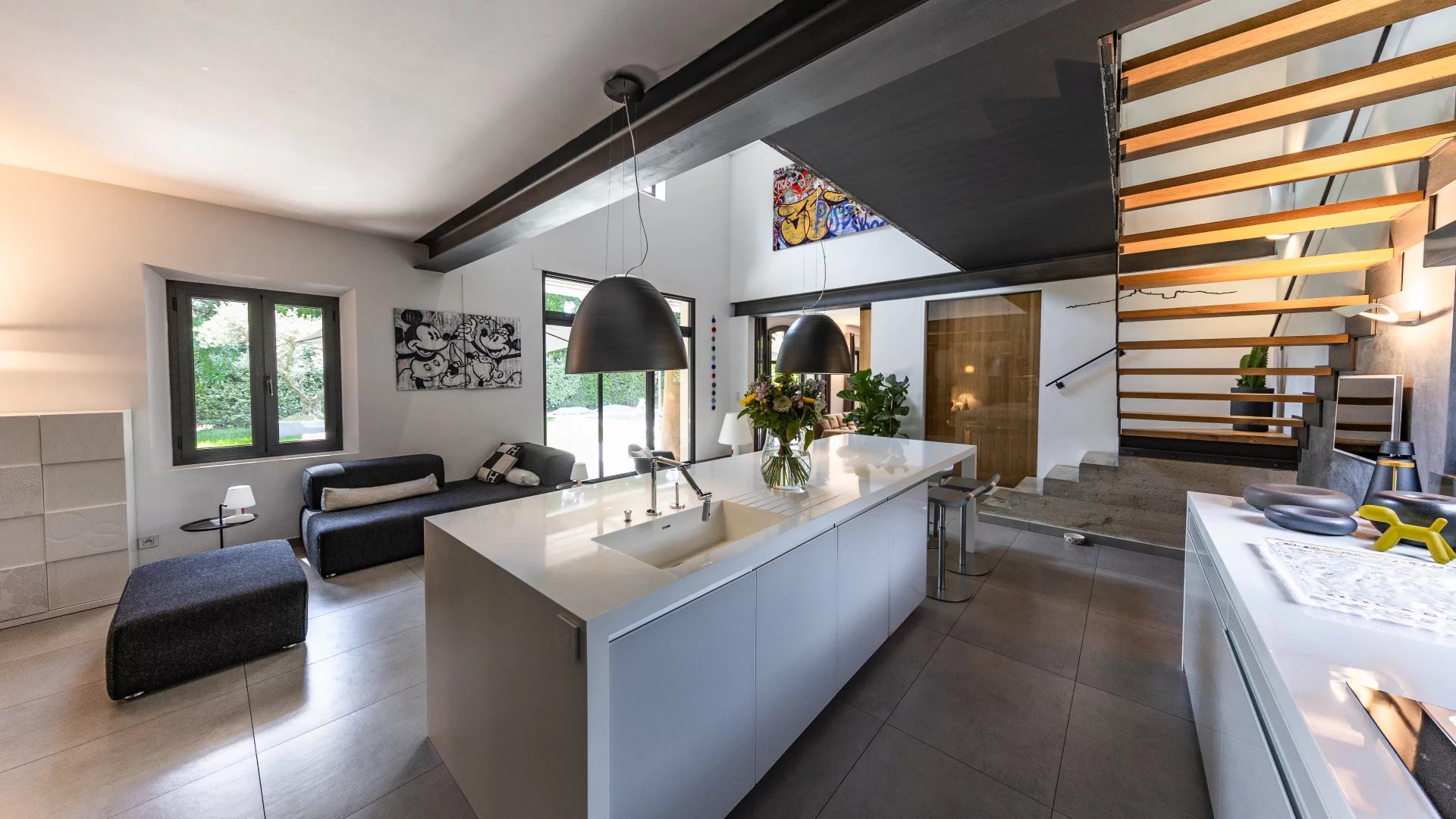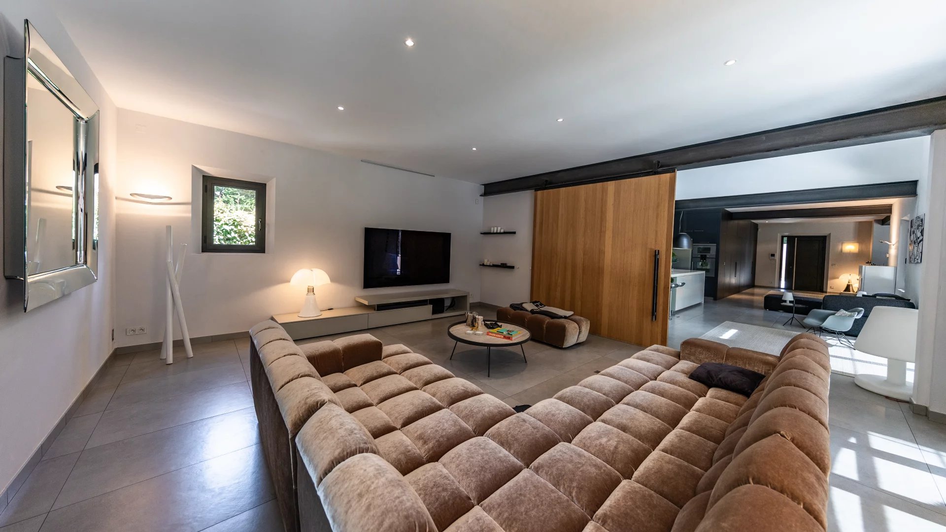 Discreetly set and offering 280 m² of living space spread over 2 levels with quality features and finishes throughout, the light and bright accommodation comprises, on the ground floor, a succession of living rooms that include a dining room, kitchen and sitting room, together totalling 120m2. Also on this level is a large en-suite bedroom of around 60 m2.