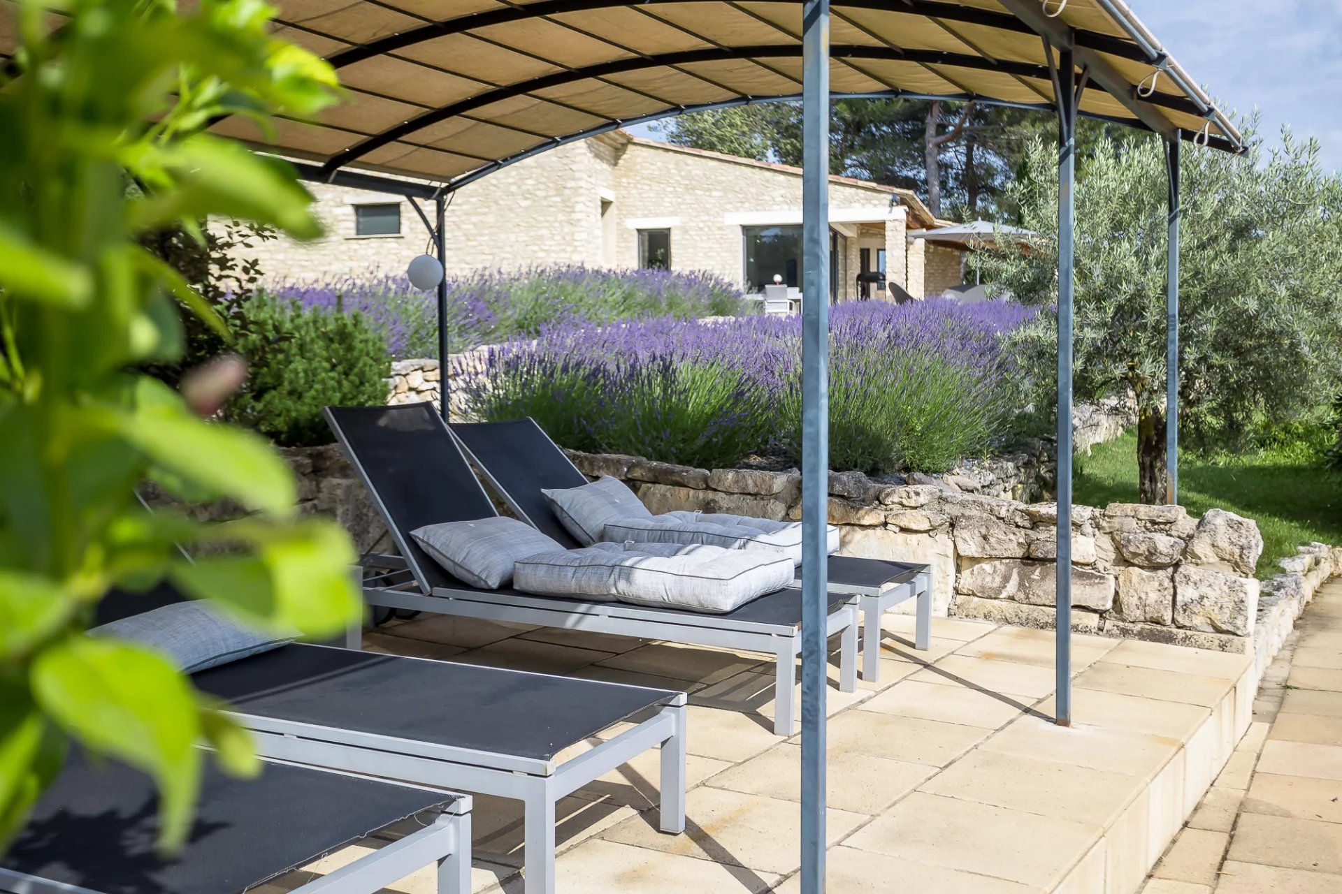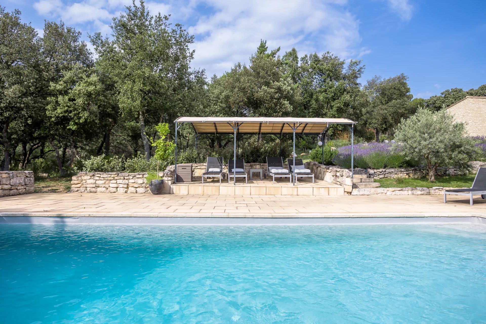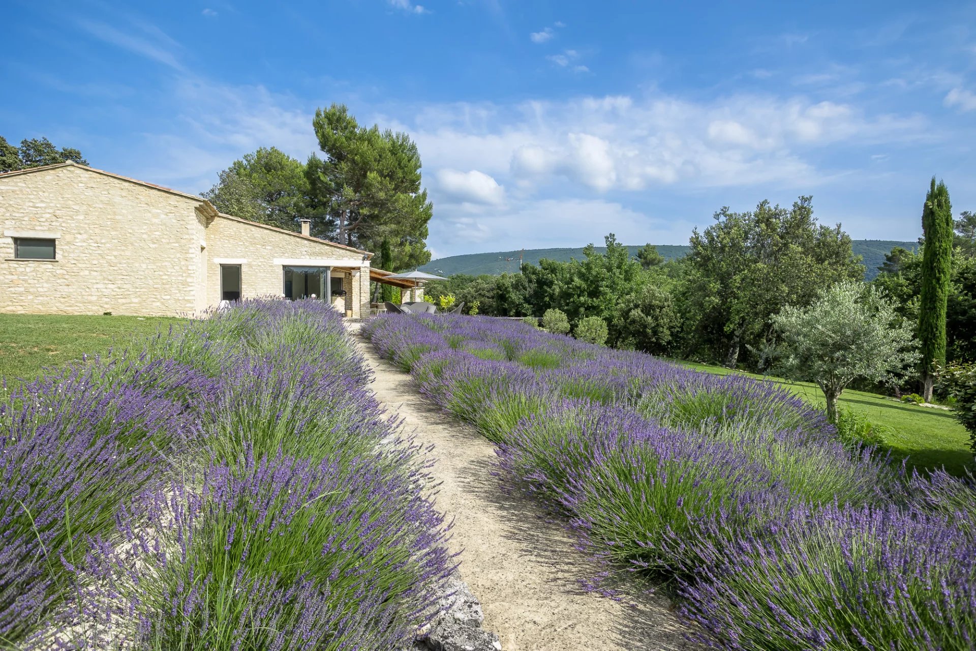From the south-facing terrace, a paved driveway meanders through lavender fields to the heated 10 x 5-meter swimming pool, equipped with an automatic cover, an outdoor shower, a technical room, paved sunbathing areas, and a covered pergola. The rest of the one-hectare property is partially landscaped with a lawn, laurel bushes, and cypress trees, while another part remains in its natural state, featuring pine trees, white oaks, and holm oaks. The entire property enjoys a superb unobstructed view of the Luberon.