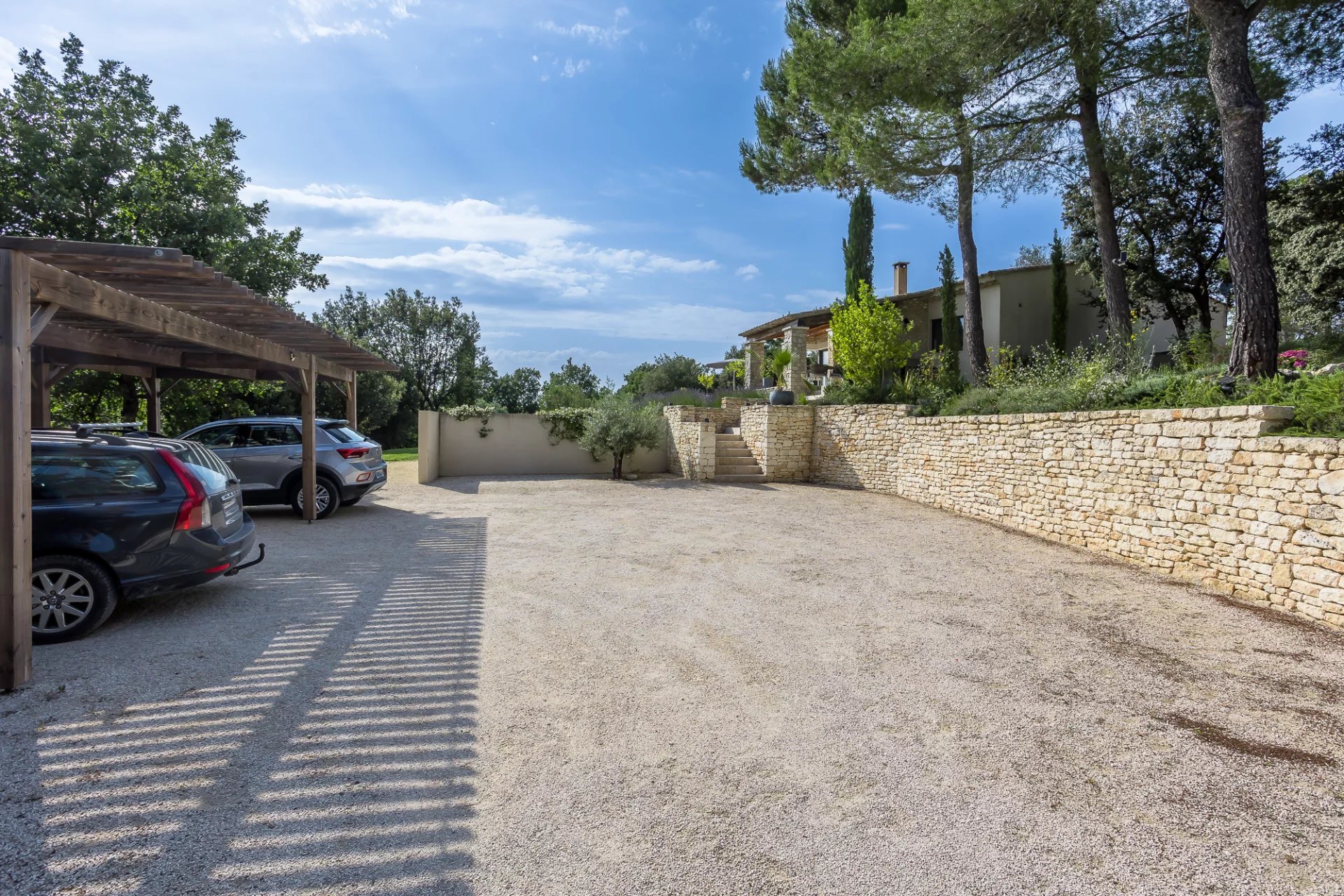 This spacious and elegant villa occupies a privileged position on a residential hill in the charming village of Menerbes. Located at the end of a small dirt path, it benefits from an entrance with an automatic gate leading to a gravel parking area bordered by stone walls and a pergola that can accommodate up to 3 vehicles. A stone staircase leads to a magnificent terrace that extends along the Gordes stone house, offering breathtaking views to the south.