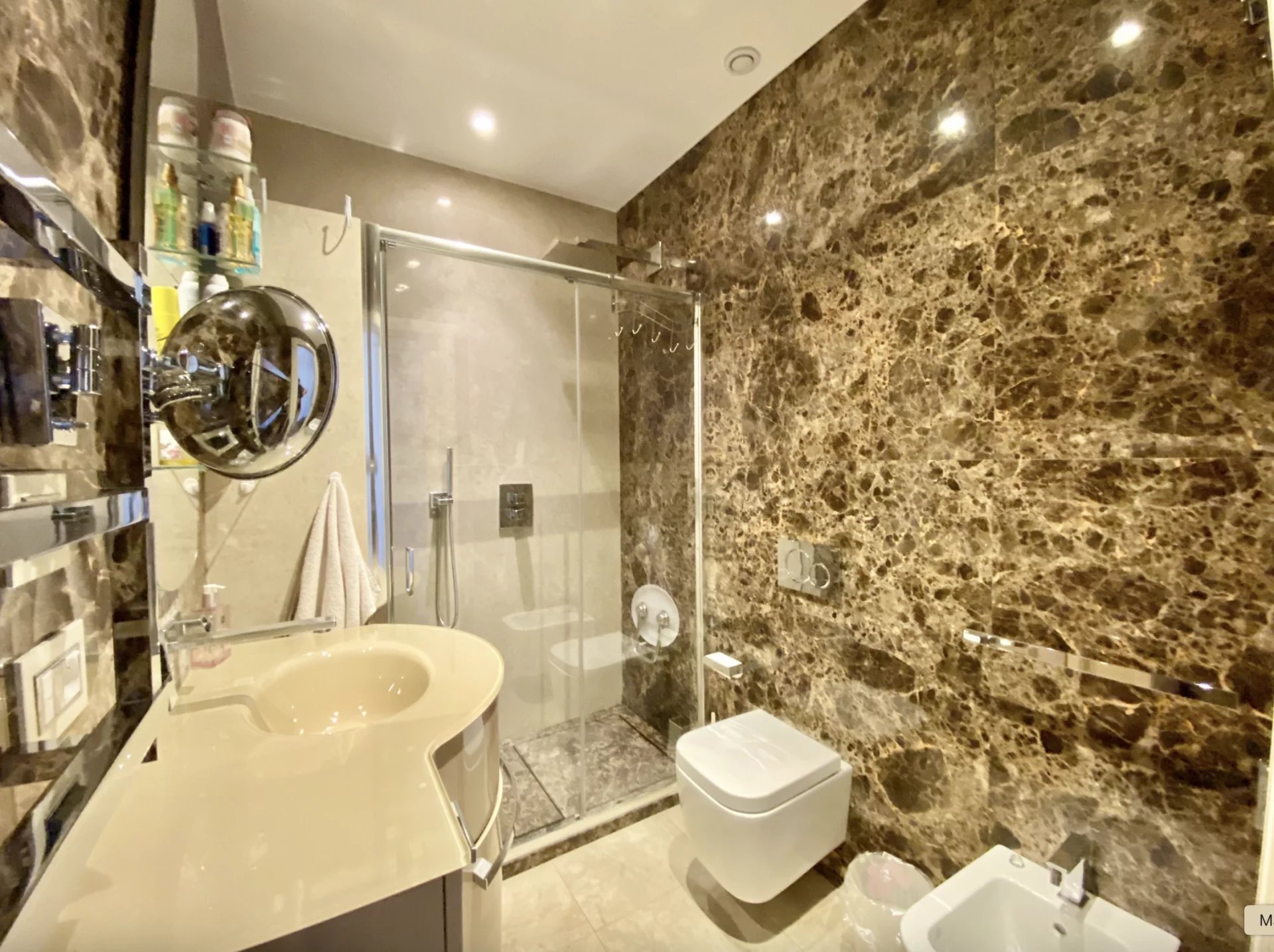 The layout includes an entrance hall, a spacious living room with fully equipped open-plan kitchen, three bedrooms, one bathroom, two shower rooms and a separate WC. Six built-in closets provide ample storage.