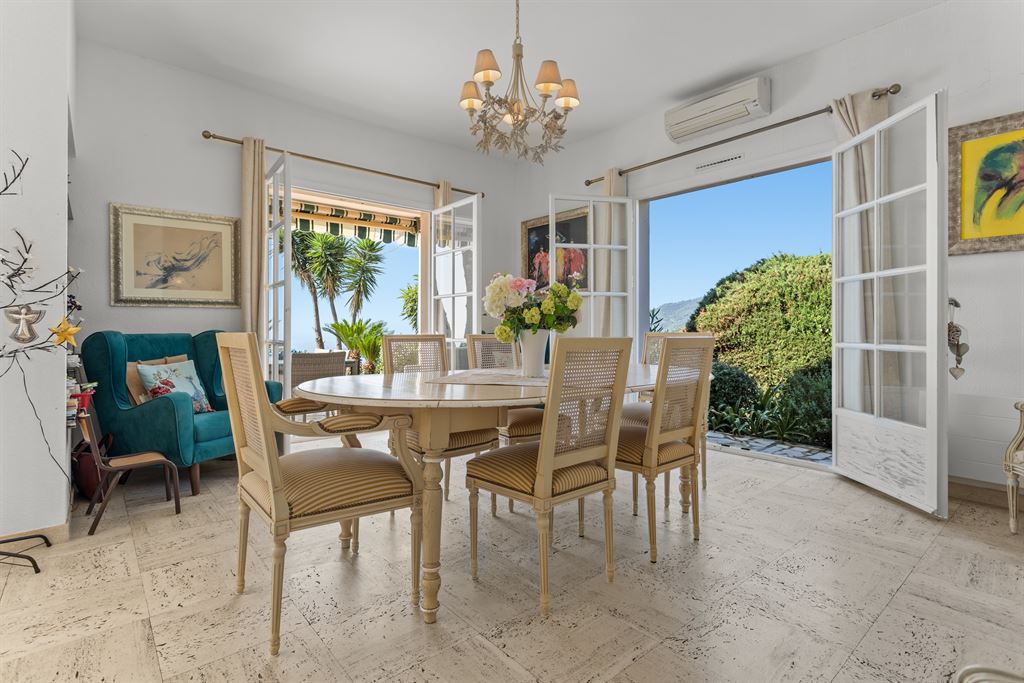 Inside, the villa’s sunlit living spaces are enhanced by expansive bay windows, creating a seamless connection between interior elegance and the stunning Mediterranean backdrop. The grand double living room, thoughtfully furnished for both relaxation and entertaining, sets the stage for sophisticated gatherings. The fully equipped gourmet kitchen, complete with high-end appliances, and multiple terraces invite you to embrace the art of Mediterranean living in effortless style.