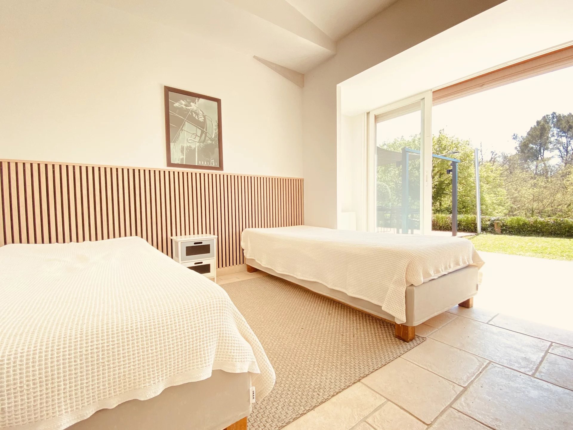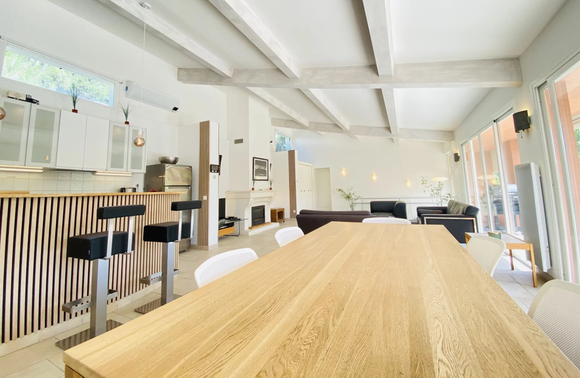The villa benefits from a spacious living room with fireplace, open and equipped kitchen, dining area, all with large bright bay windows overlooking the outside, a master bedroom with bathroom and office/bedroom, 2 other bedrooms and a shower room.